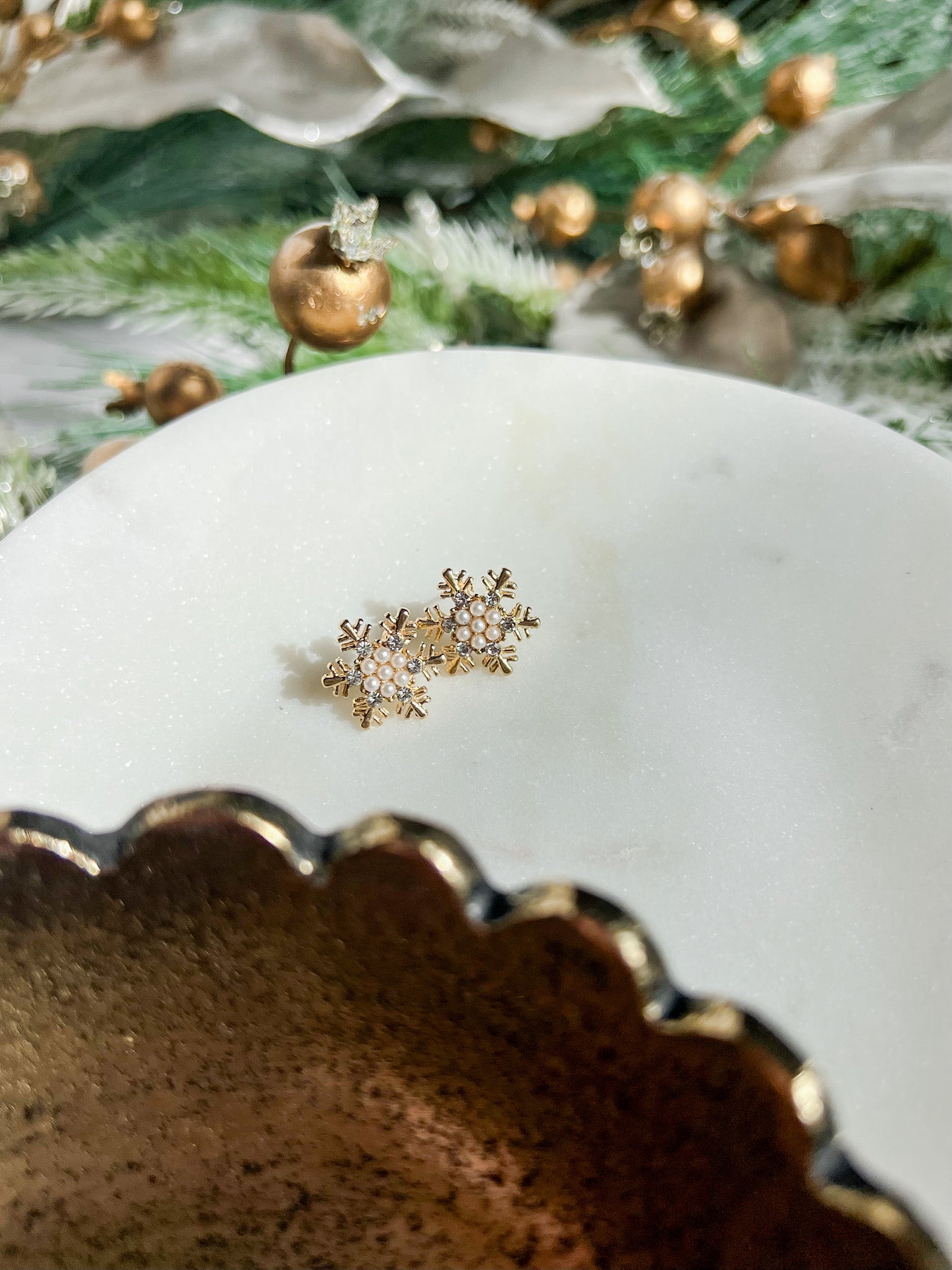 Petite gold snowflake studs with delicate pearl centers — a simple, sophisticated touch for every winter outfit.