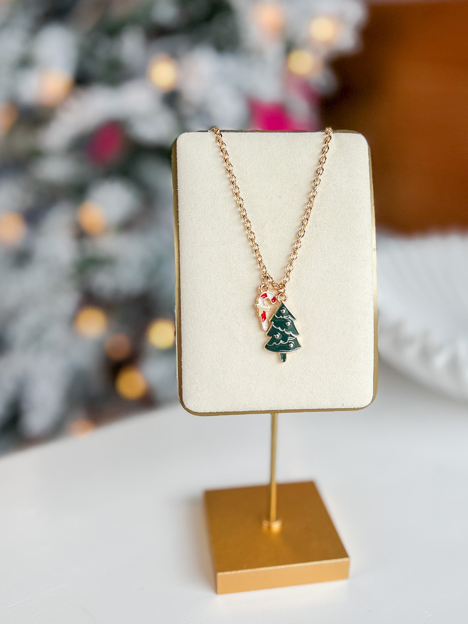 Sweet, simple, and perfectly festive. This gold charm necklace features two holiday classics — a sparkling candy cane and a tiny Christmas tree — for a cheerful pop of seasonal magic. Lightweight and easy to layer, it’s the cutest finishing touch to any holiday outfit.
