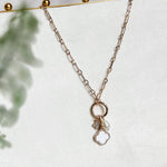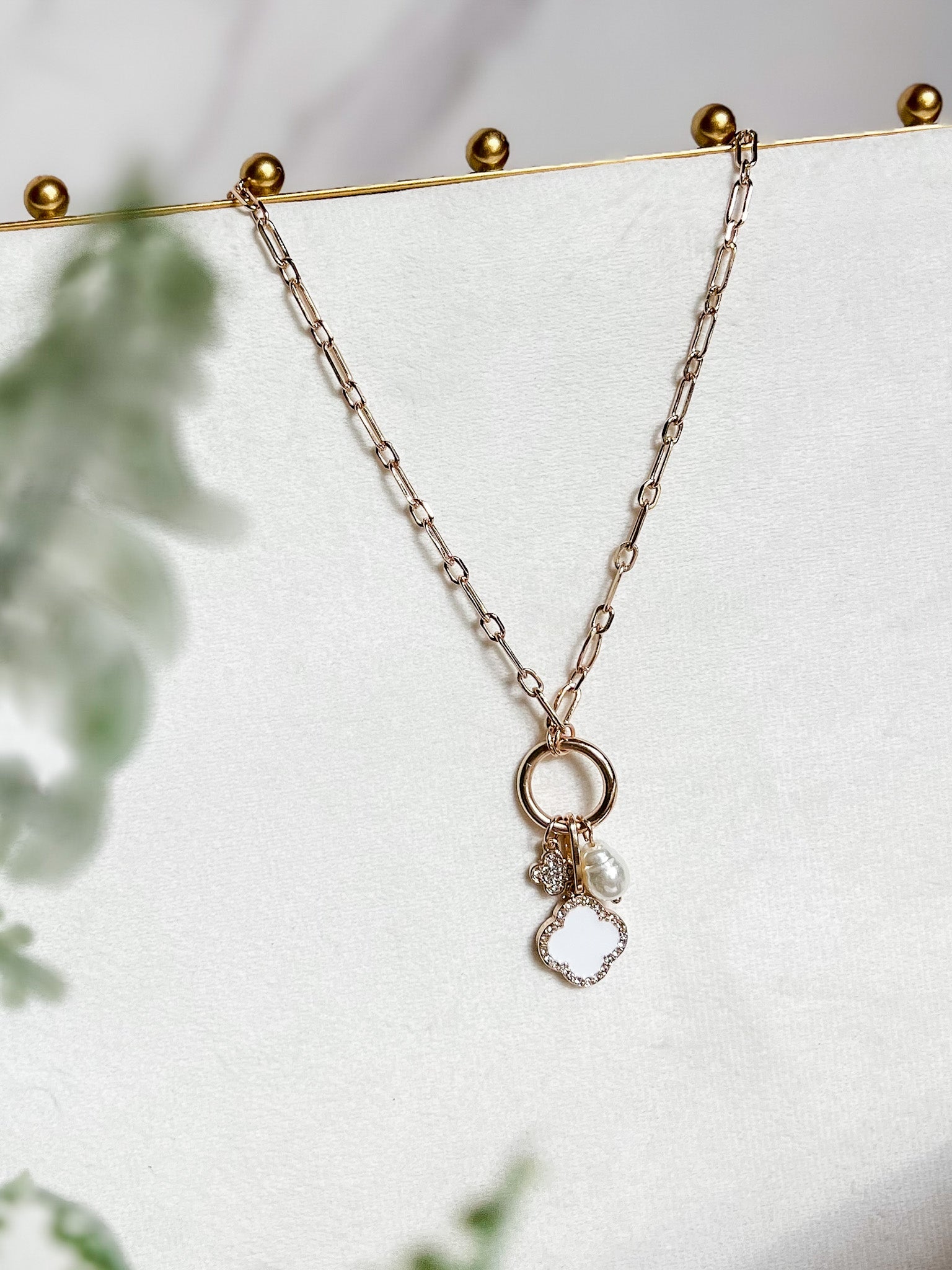 A gold link chain adorned with a pearl, crystal charm, and delicate quatrefoil pendant. The ideal mix of polished and playful, easy to style with everything from tees to blouses.