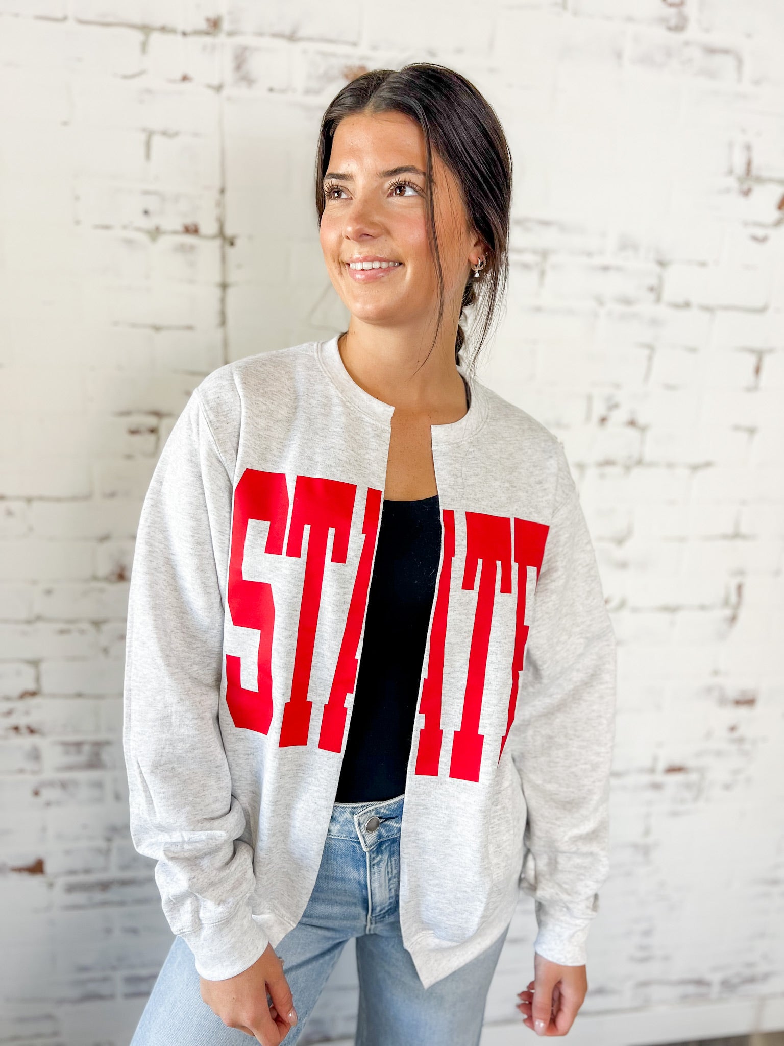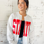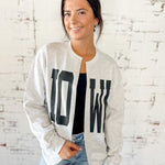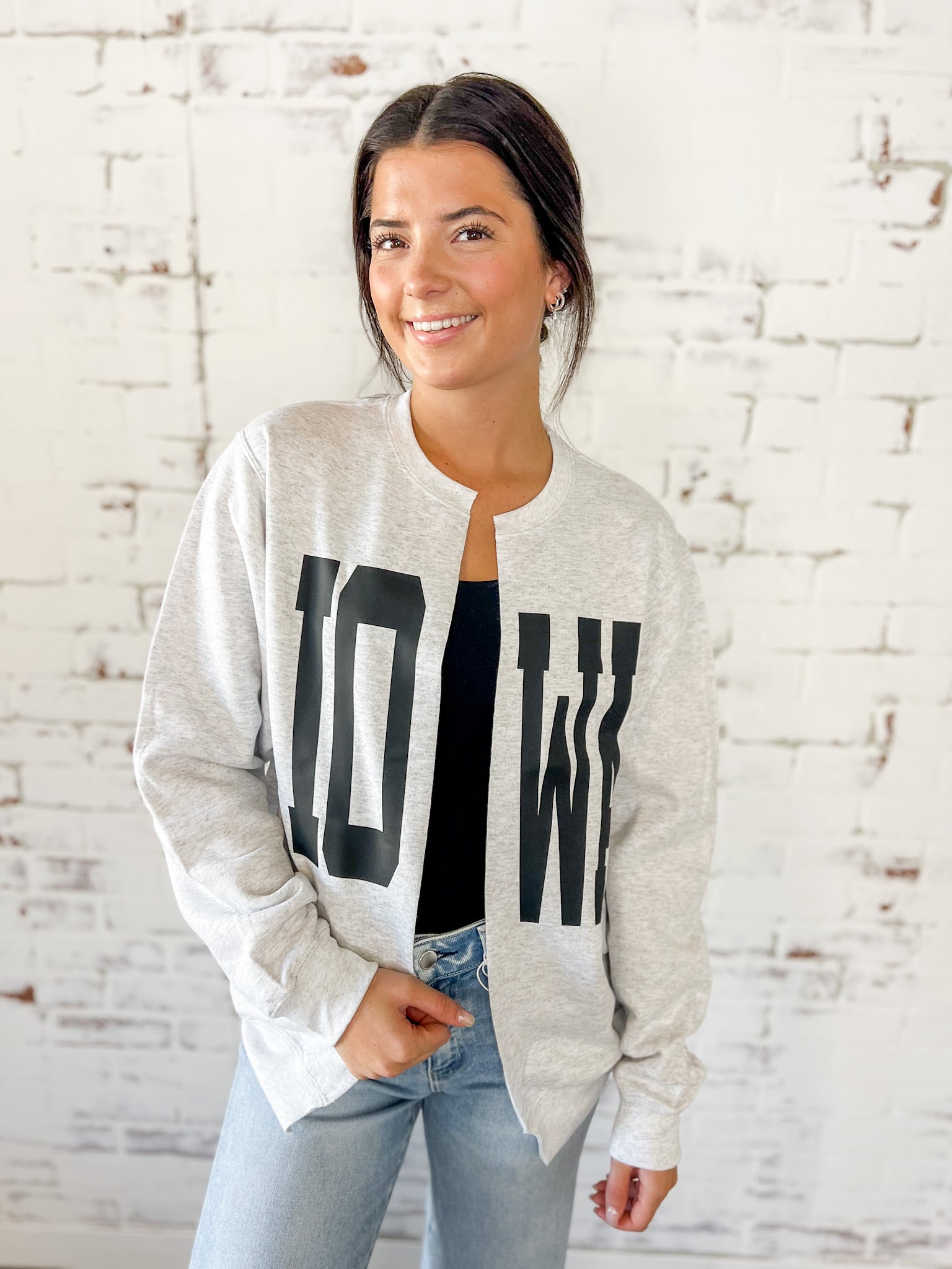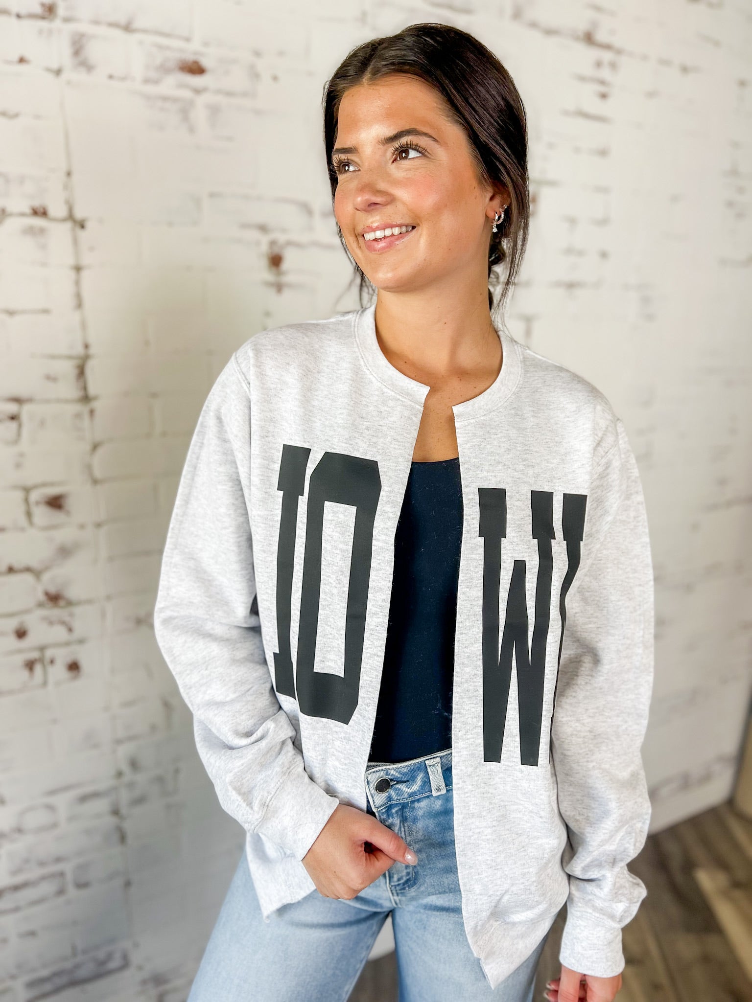 Team spirit, but make it cute. These open-front cardigans are the perfect game-day layer — cozy, lightweight, and boldly printed with your favorite team pride. Available in Iowa and Iowa State designs. Chloe is 5’7” and wearing a size small.