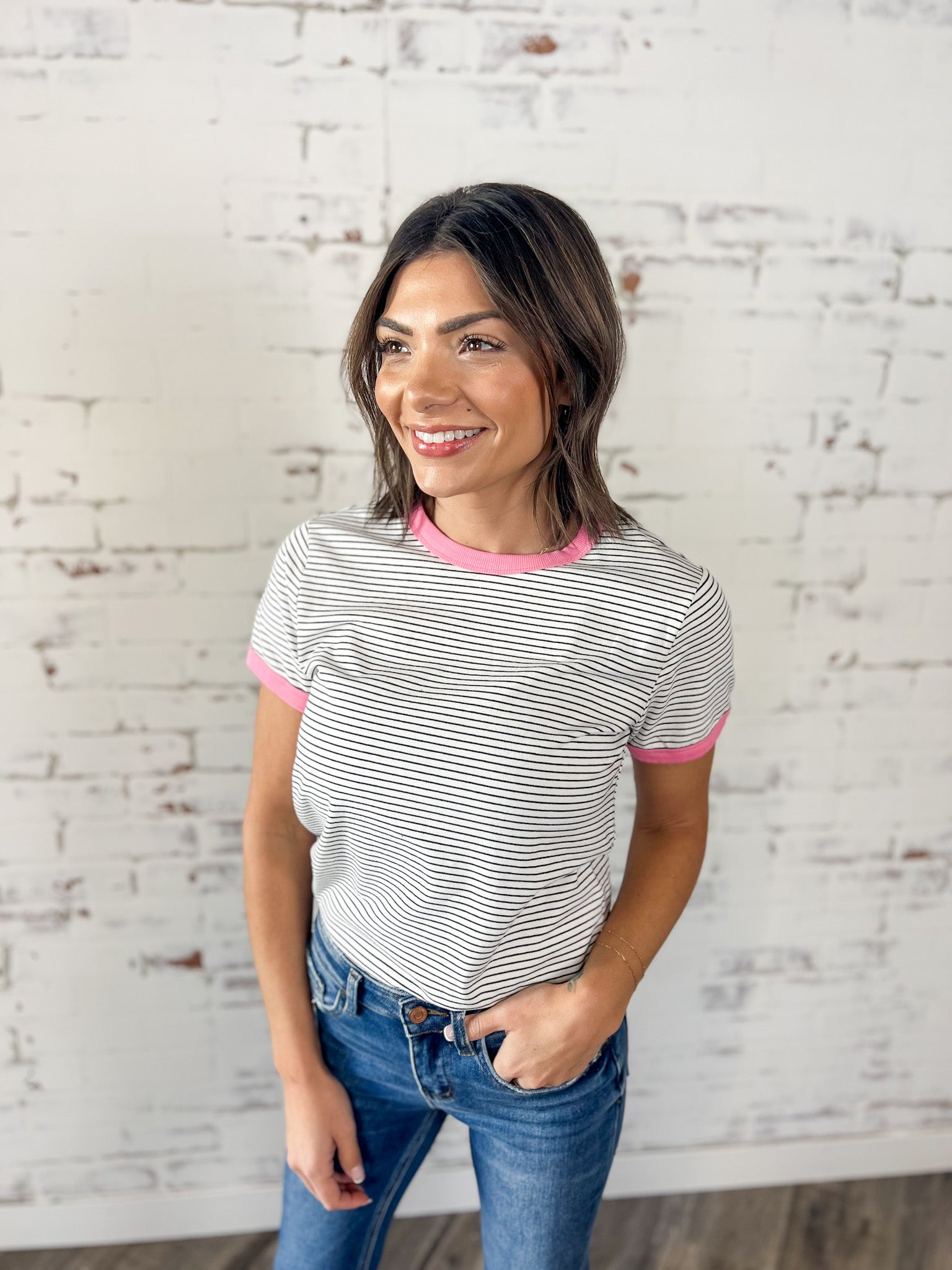 The Classic Striped Tee with a Pop of Pink is perfect with jeans, denim shorts or layered under a jacket when you want something simple but pulled together. It’s an easy grab-and-go piece that works for everyday errands, casual weekends and packing light for warm-weather trips.