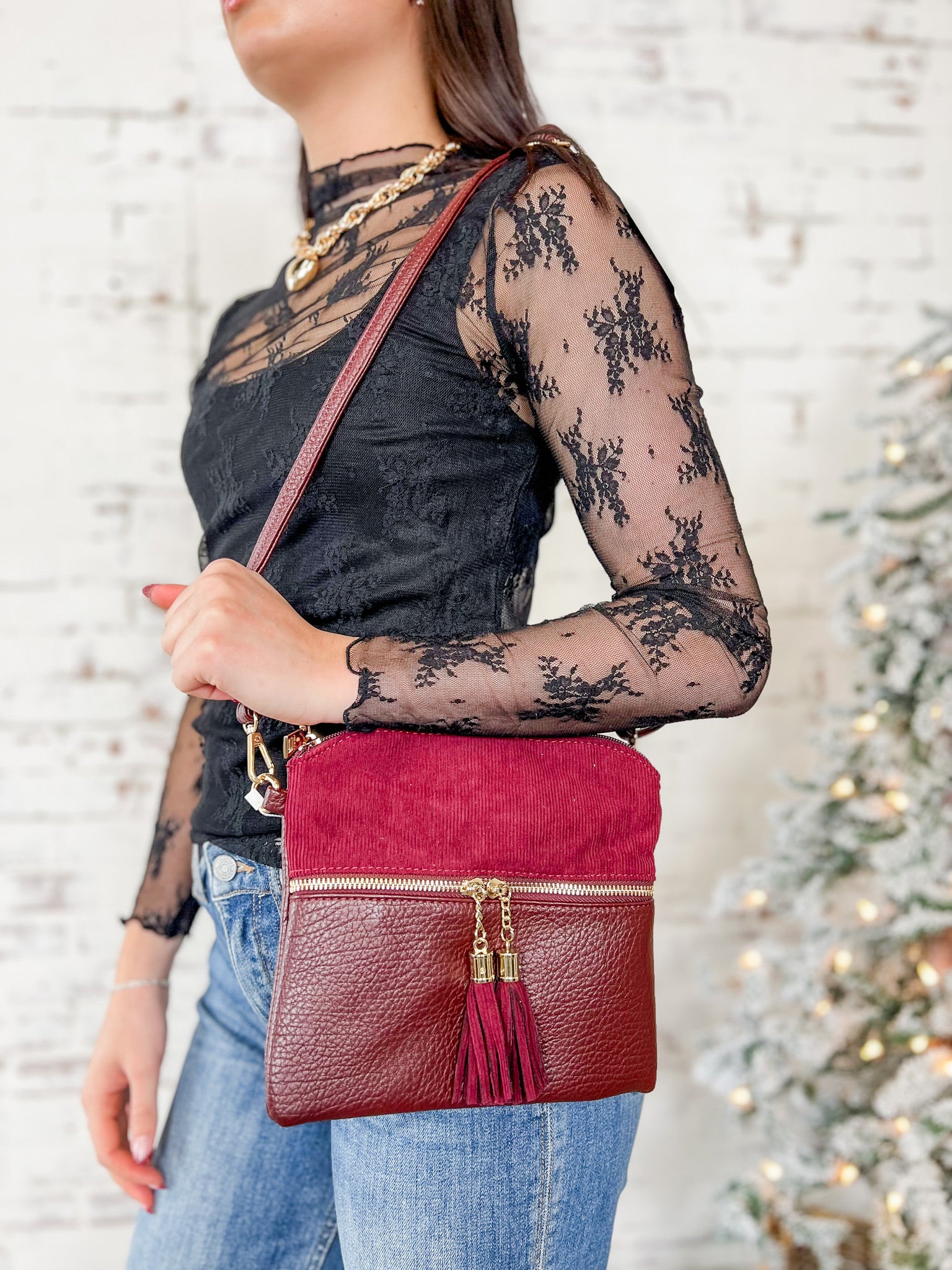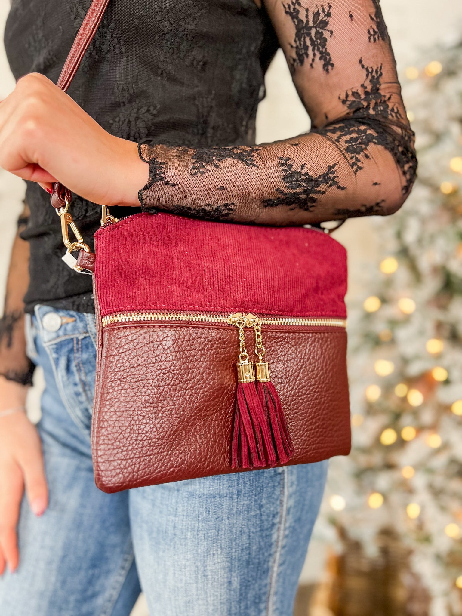 A little corduroy, a little vegan leather, a whole lot of “Where did you get that?” The Tassel Crossbody brings together fun texture, soft structure, and just the right amount of gold-tone detail to elevate your everyday outfits.