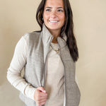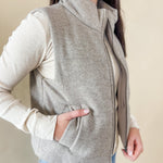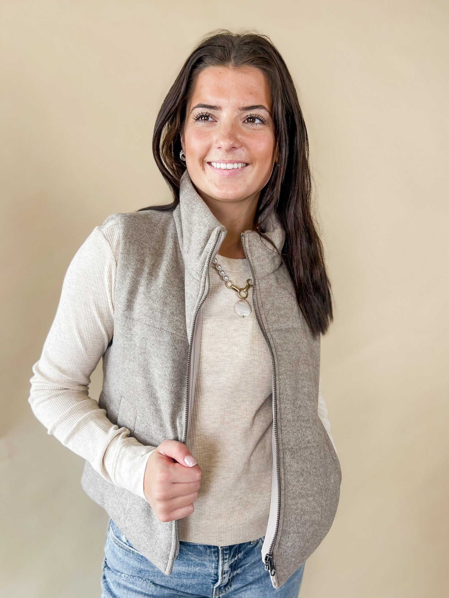 Your layering game just leveled up. This soft neutral vest is the perfect throw-on-and-go piece with its zip front, pockets, and cozy feel. Chloe is 5'7" wearing a size small, and the fit is true to size.