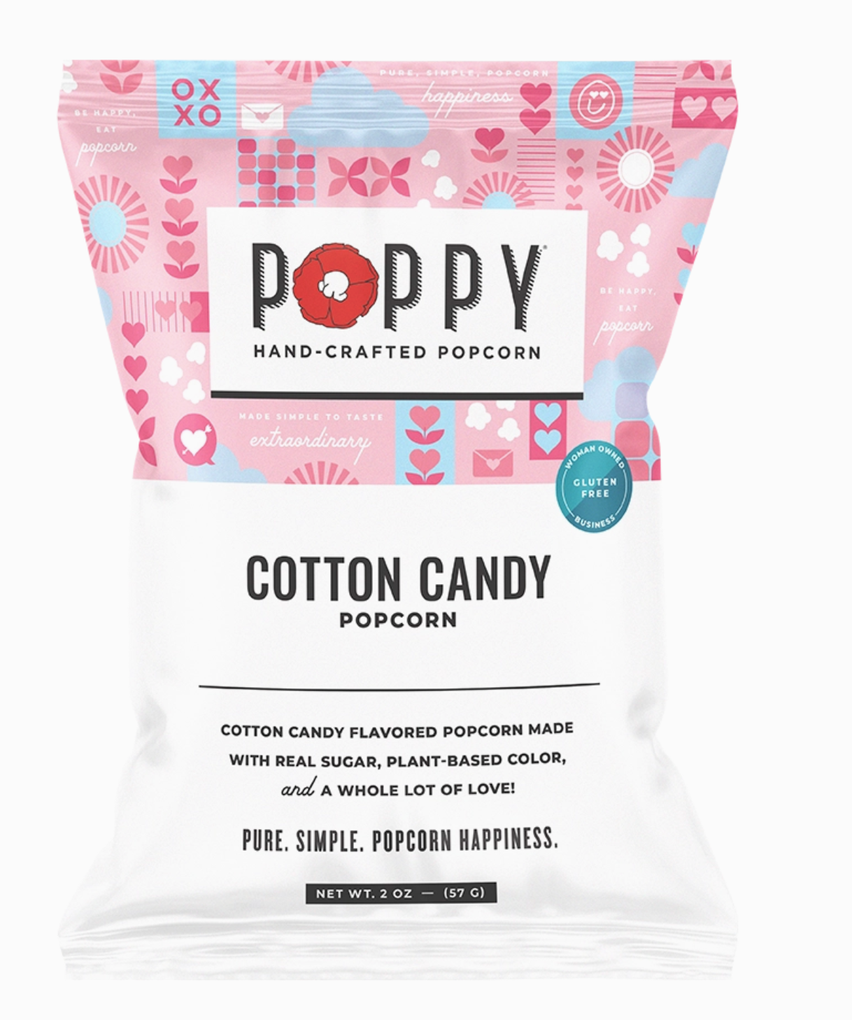 Blush pink, perfectly sweet, and made for Valentine’s season. This light and airy Cotton Candy popcorn is full of sugary charm in a 2 oz snack bag.