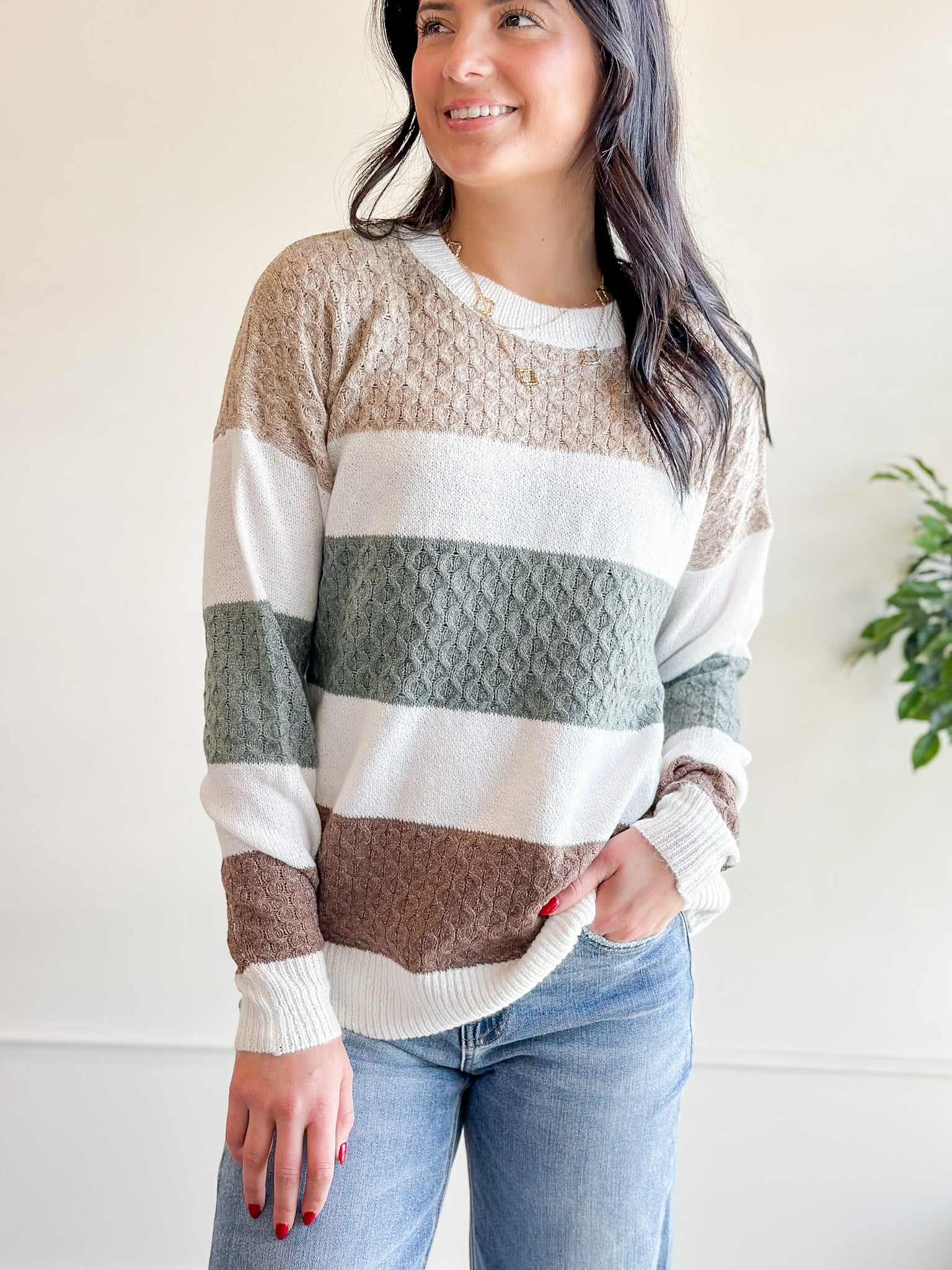 This neutral striped knit sweater features soft texture and easy earth-tone stripes that work with just about everything. Wear it on its own for everyday comfort or layer it under a vest with your favorite jeans and boots for a fun, pulled-together outfit that feels casual but intentional. It’s one of those pieces you’ll reach for all season long.