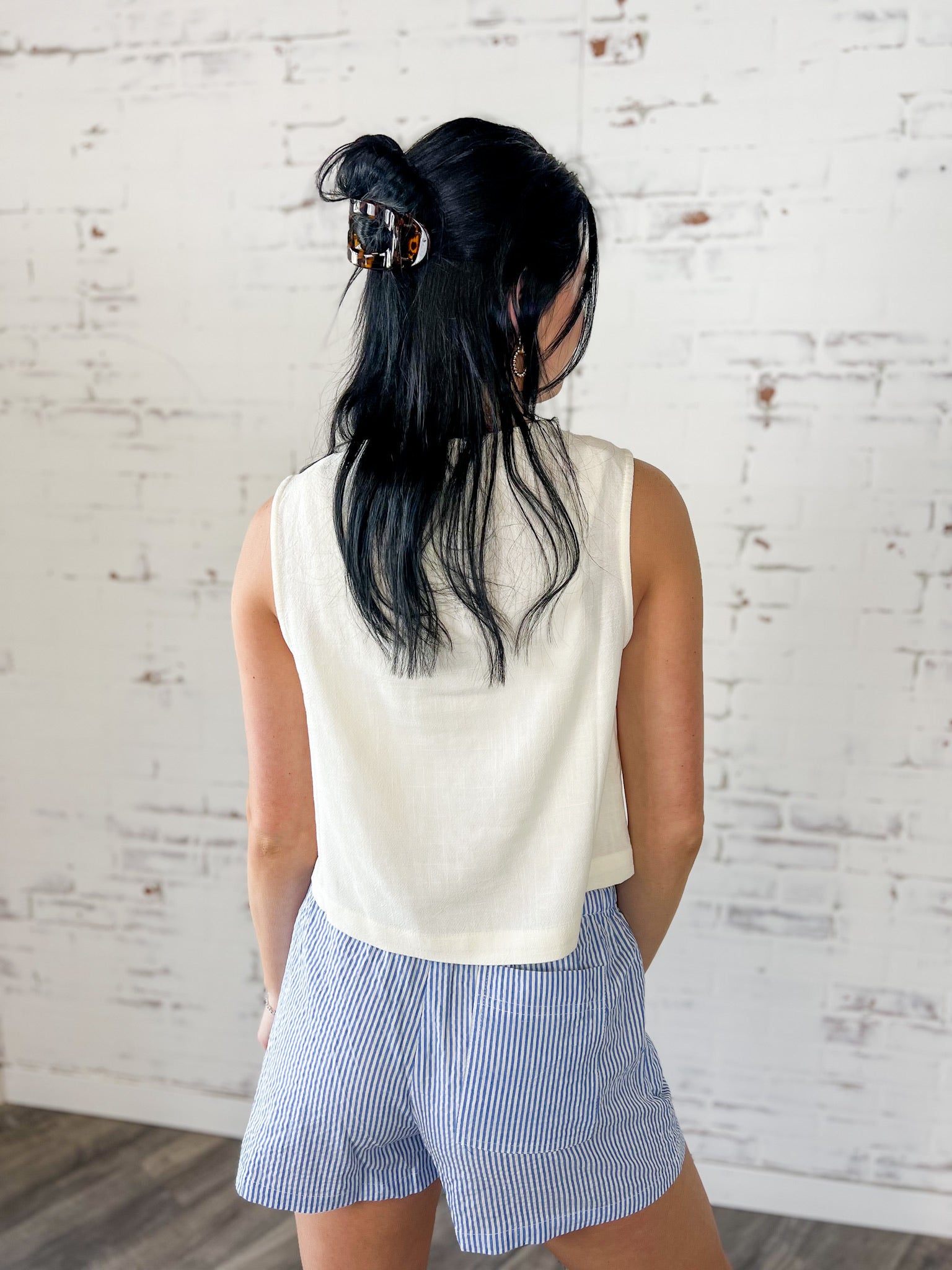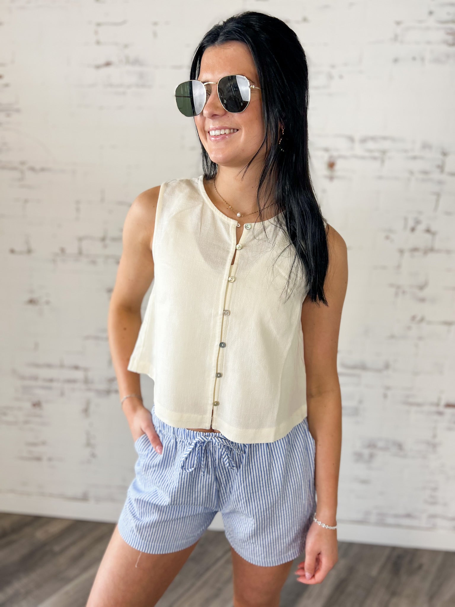 The Coastal Linen Blend Button Tank features a soft linen blend fabric, functional front buttons and a relaxed, slightly flowy fit that flatters without clinging. The natural texture gives it that elevated everyday feel, making it perfect for spring break trips, patio lunches, farmers markets or busy Saturdays running around town. Style it with striped shorts, denim, wide leg pants or layer it under a lightweight cardigan. It’s timeless, on trend and incredibly easy to wear.