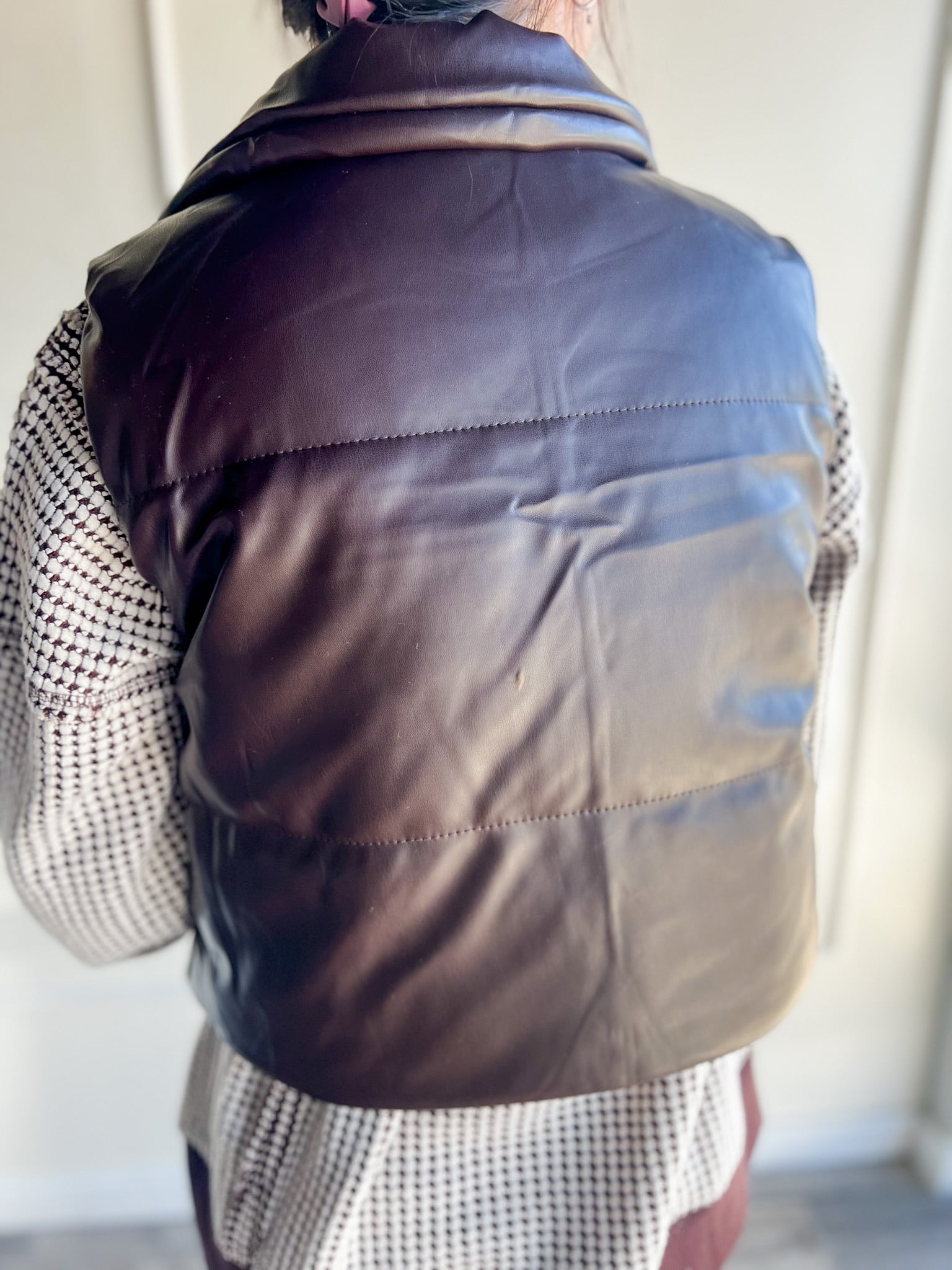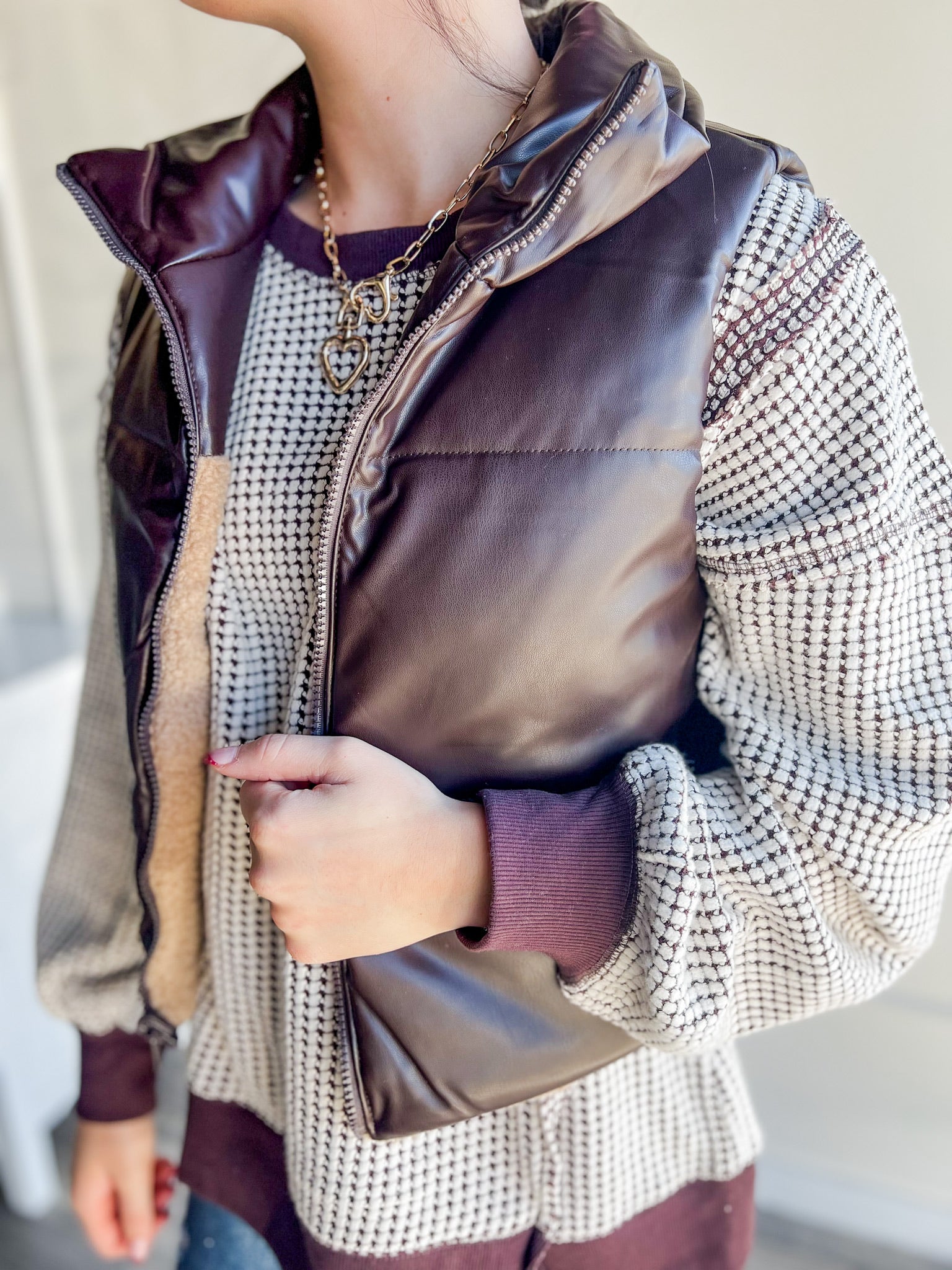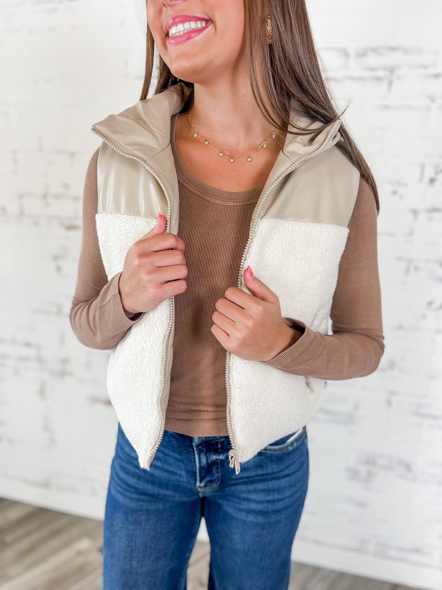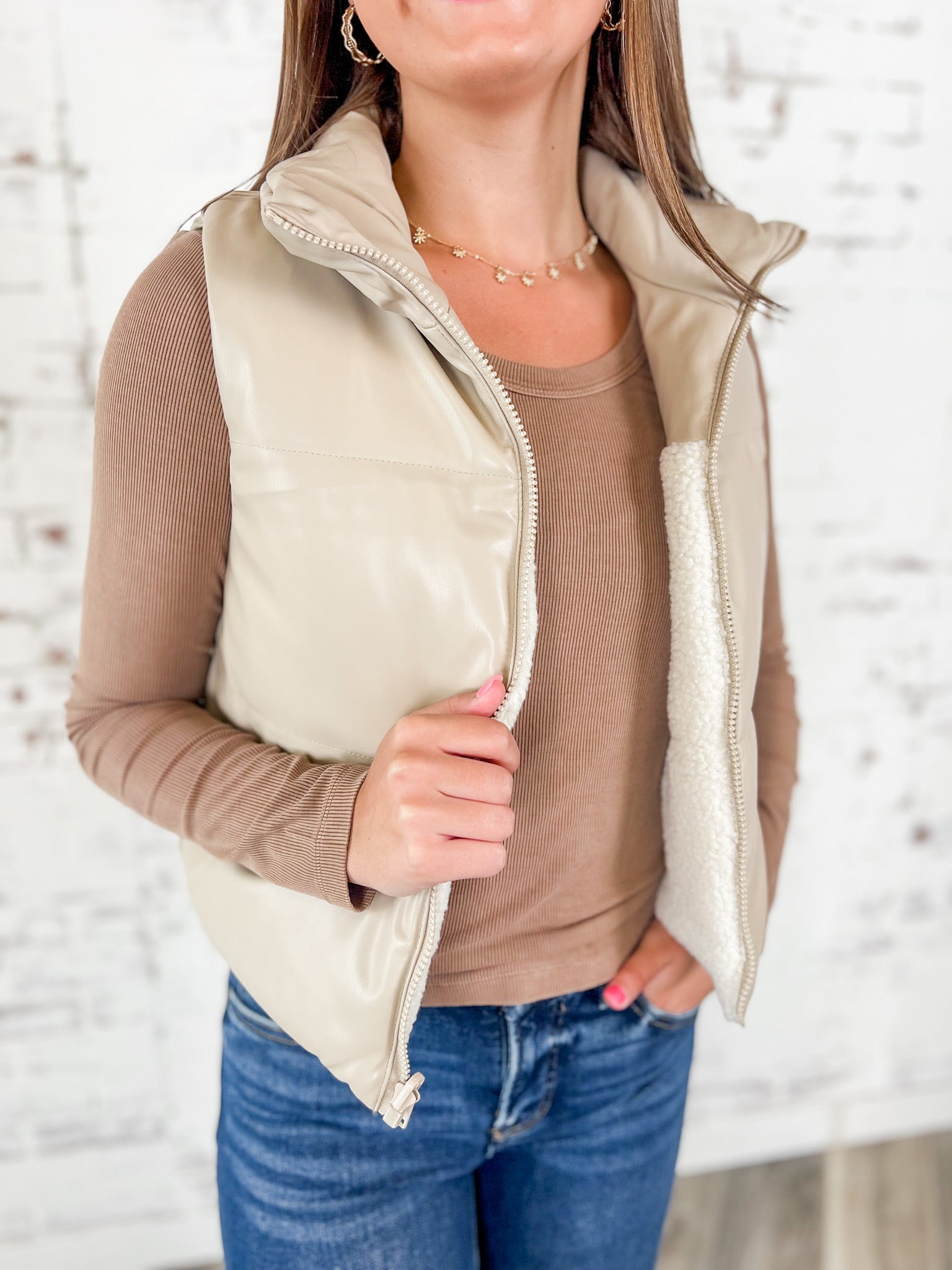 Meet the Reversible Puffer Vest — the versatile piece your fall wardrobe’s been waiting for. One side features a sleek, neutral faux leather finish for that polished look, while the other side brings the cozy with soft sherpa that feels like a warm hug.
