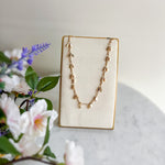 A gold tone chain necklace detailed with small leaf charms spaced throughout. Lightweight and delicate, this piece adds a subtle nature-inspired detail while keeping the look clean and easy to style.