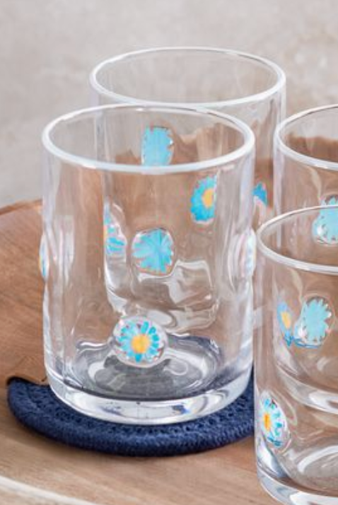 This petite floral glass tumbler brings a fresh, cheerful feel to everyday spaces. The blue floral accents offer a light pop of color that feels clean and classic, making it an easy addition to kitchens, coffee bars, or styled shelves. Its small scale makes it perfect for morning juice, espresso drinks, or repurposed as a decorative holder.
