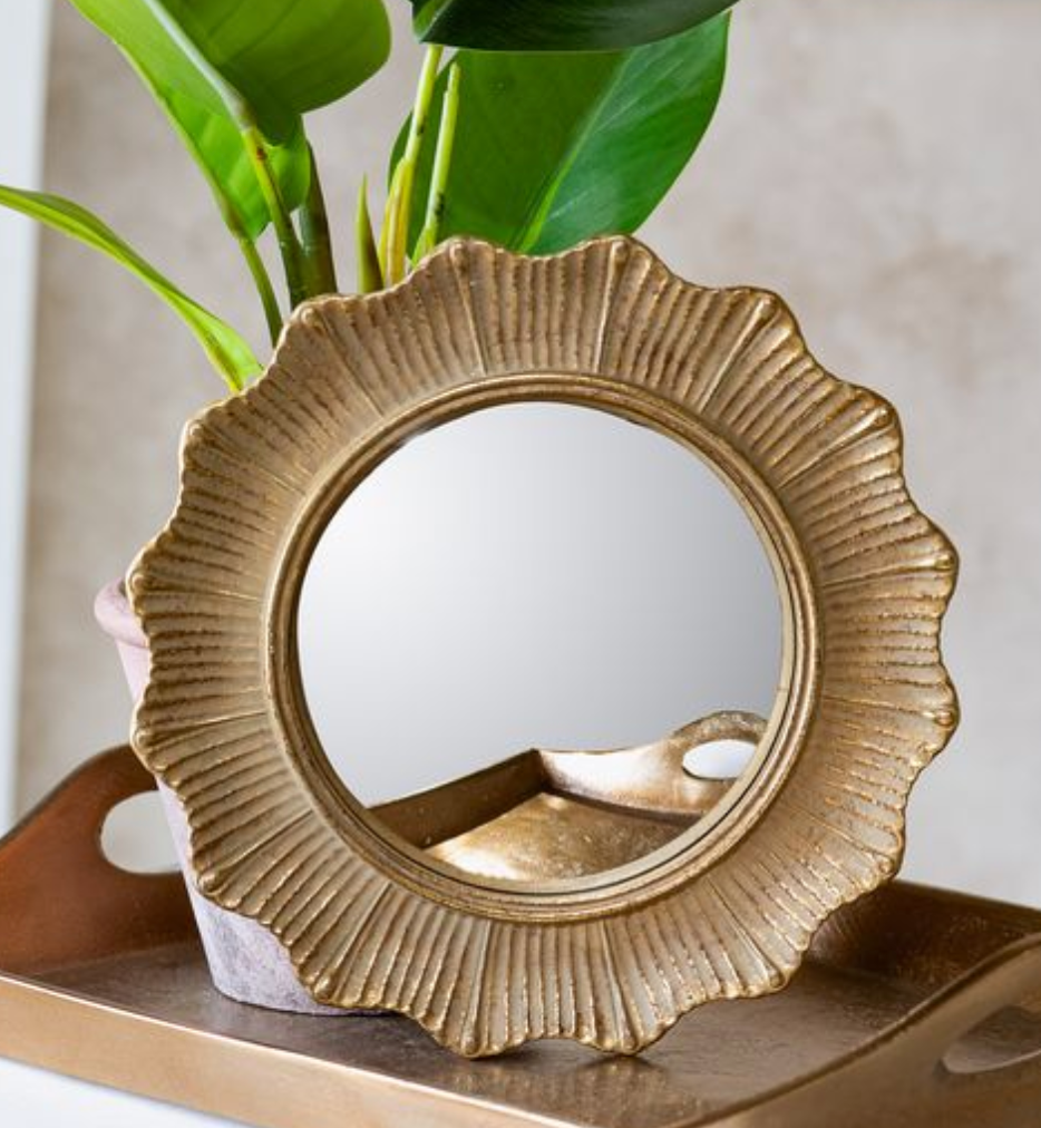 This petite scalloped mirror is the kind of detail that instantly elevates a space. The softly textured gold frame adds warmth and dimension while the round shape keeps it feeling timeless and approachable. At just the right size, it’s perfect for layering into styled shelves, trays, or bathroom countertops where a little shine goes a long way.