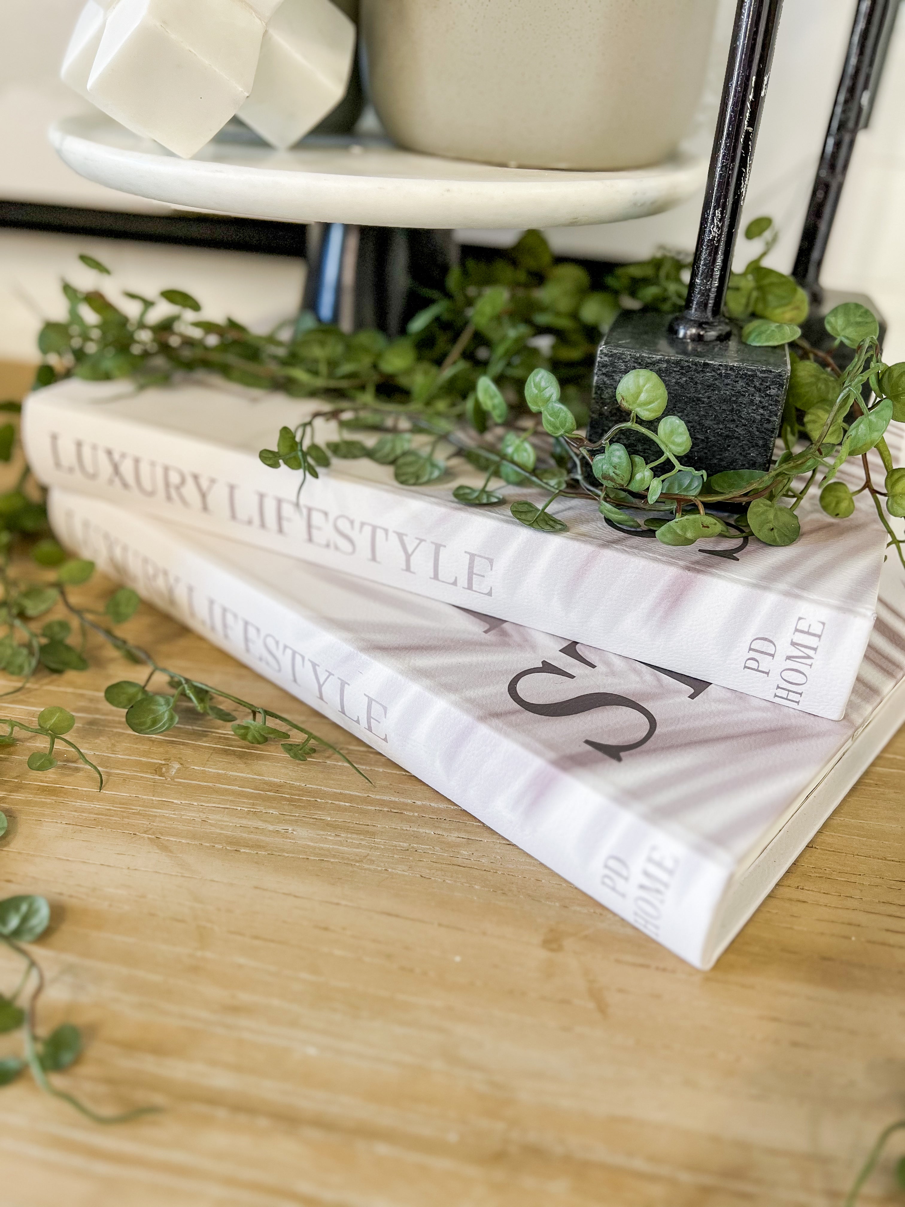 These decorative coffee table books can be displayed horizontally with additional stacked books, a candle or vase on top; or, vertically with a fun bookend for your built-ins.