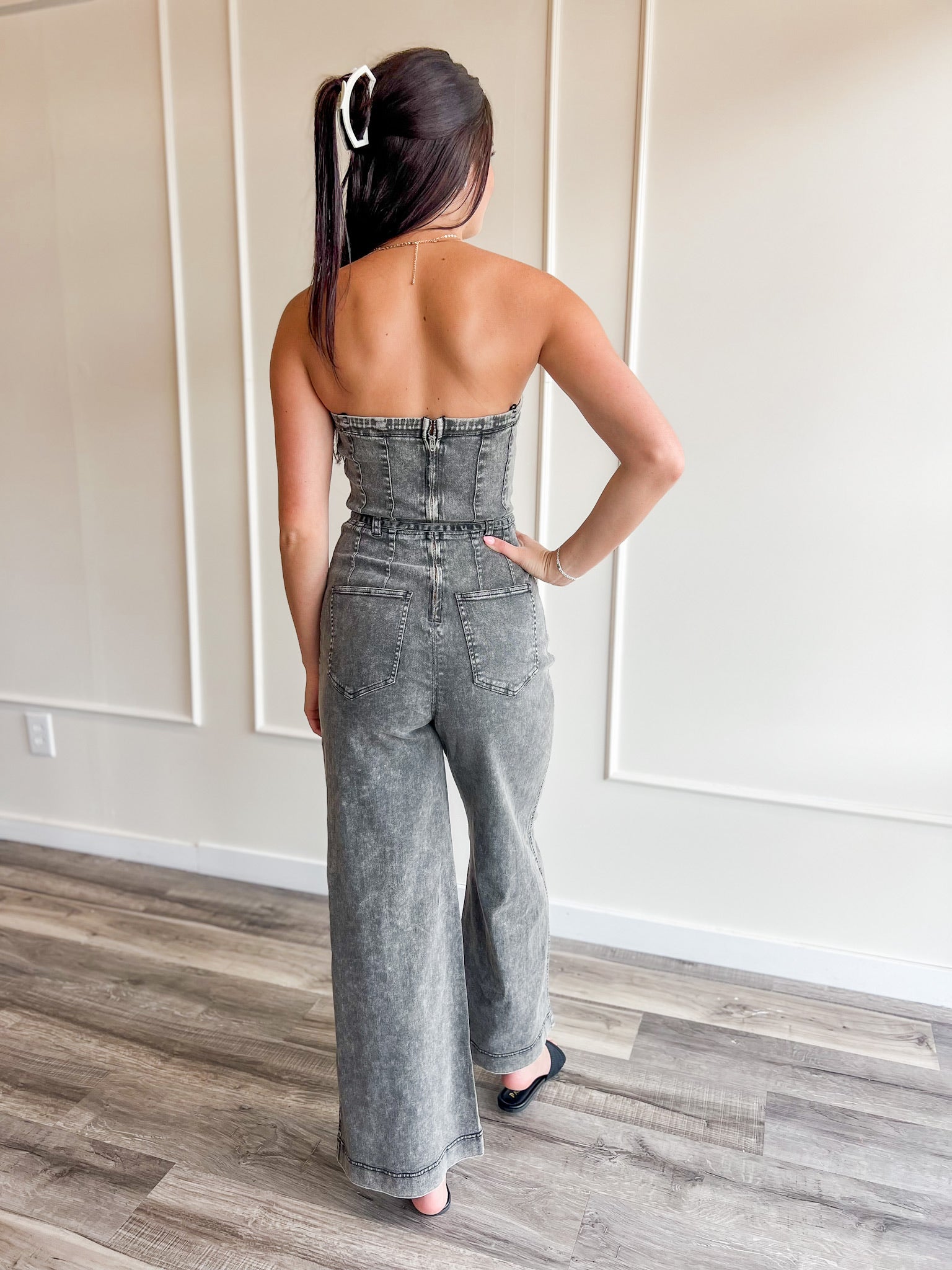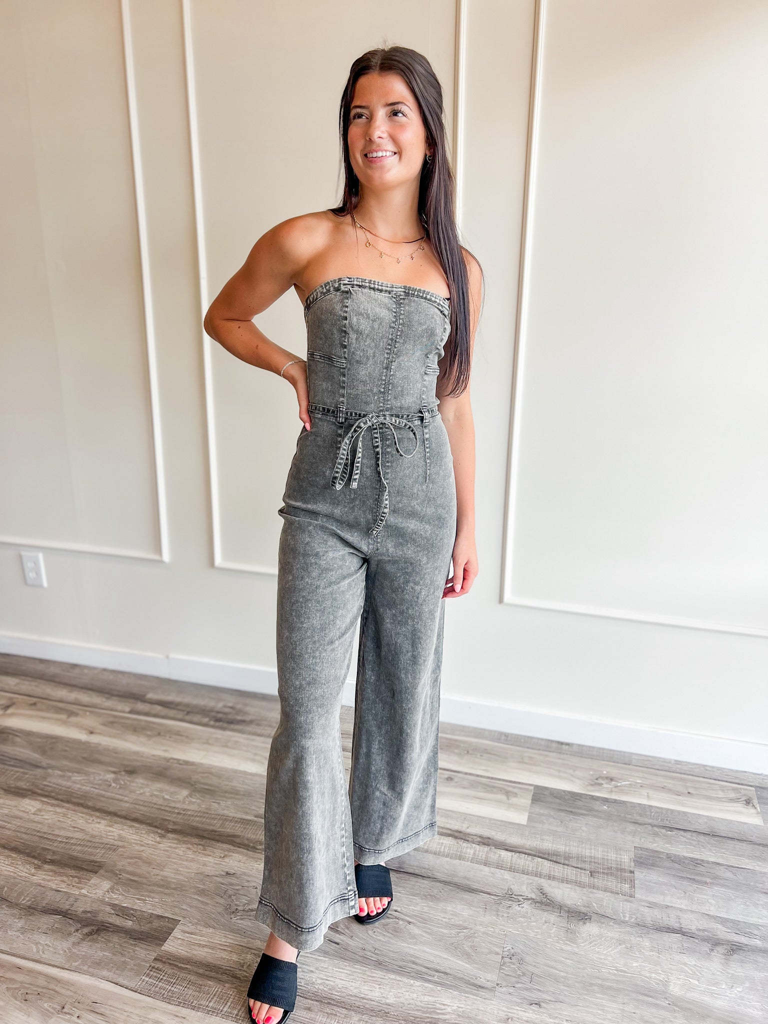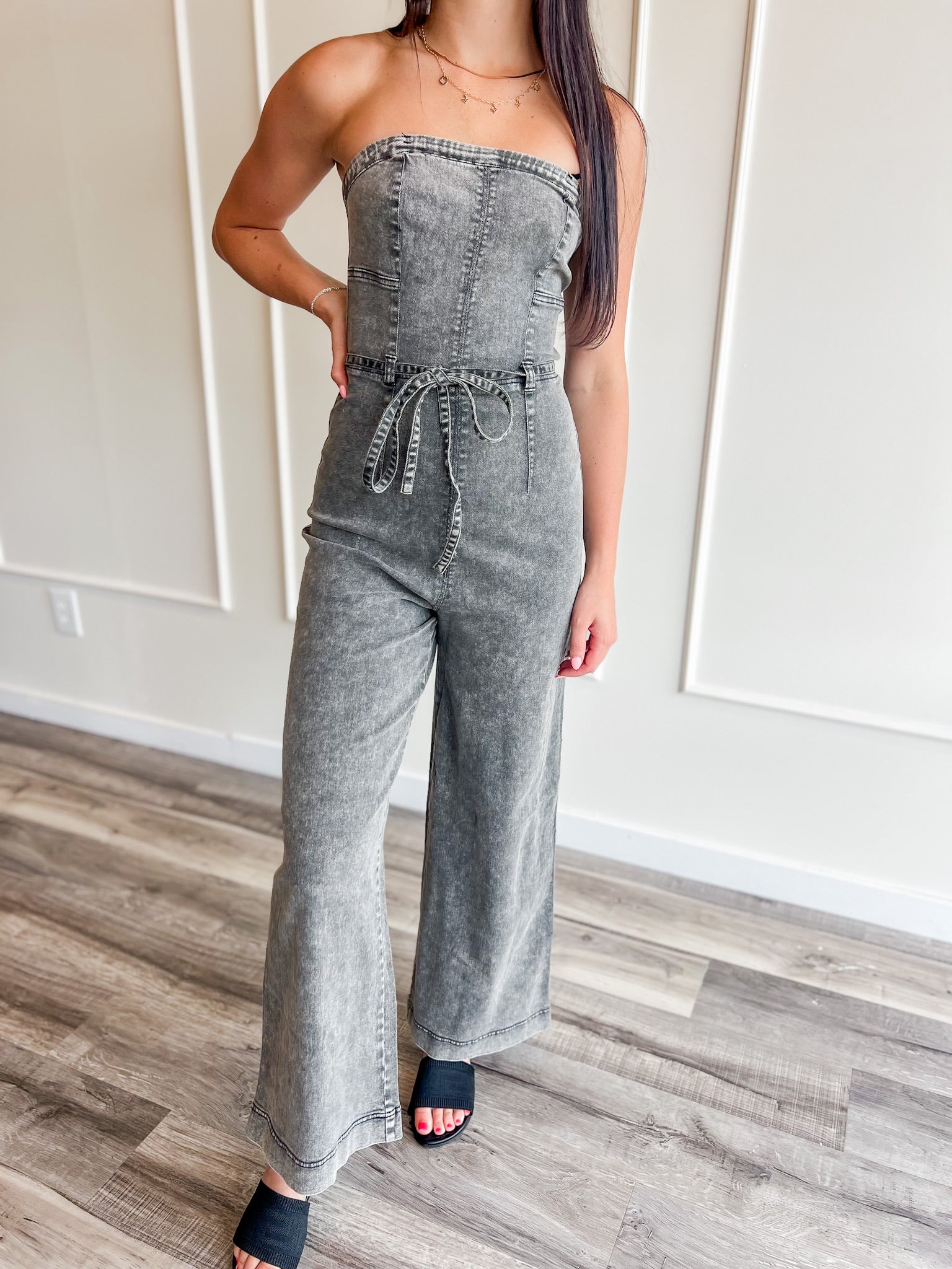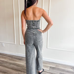 Cue the double takes—this acid wash strapless jumpsuit is bringing all the attitude. With a structured bodice, tie waist, and wide leg silhouette, it’s made for rooftop nights, concerts, and girls who don’t do boring.