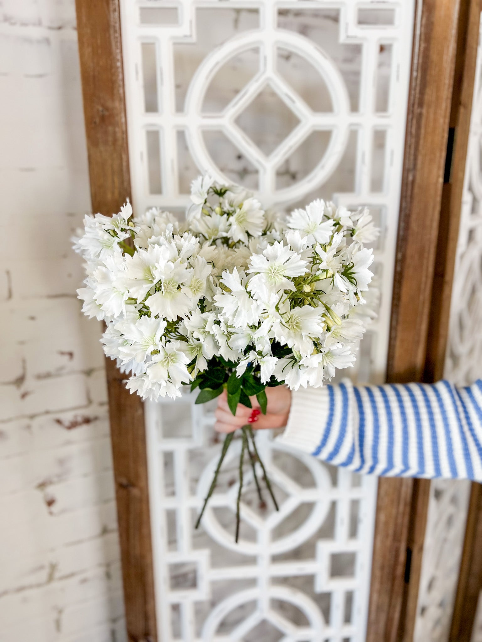 Full, soft and beautifully detailed, the Diathus Faux Spray features layered white blooms with delicate texture and natural movement. Designed to mimic freshly gathered florals, this faux spray adds fullness and a clean, classic look to any space. Faux botanicals like this one bring lightness and charm indoors — with the bonus of staying perfectly pretty season after season.
