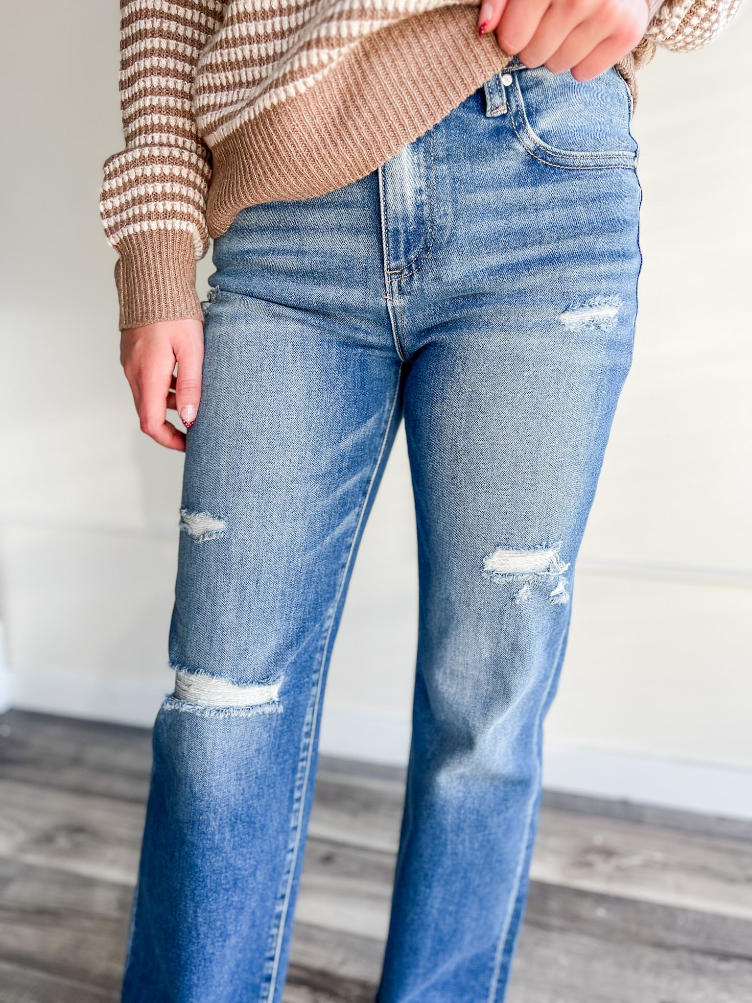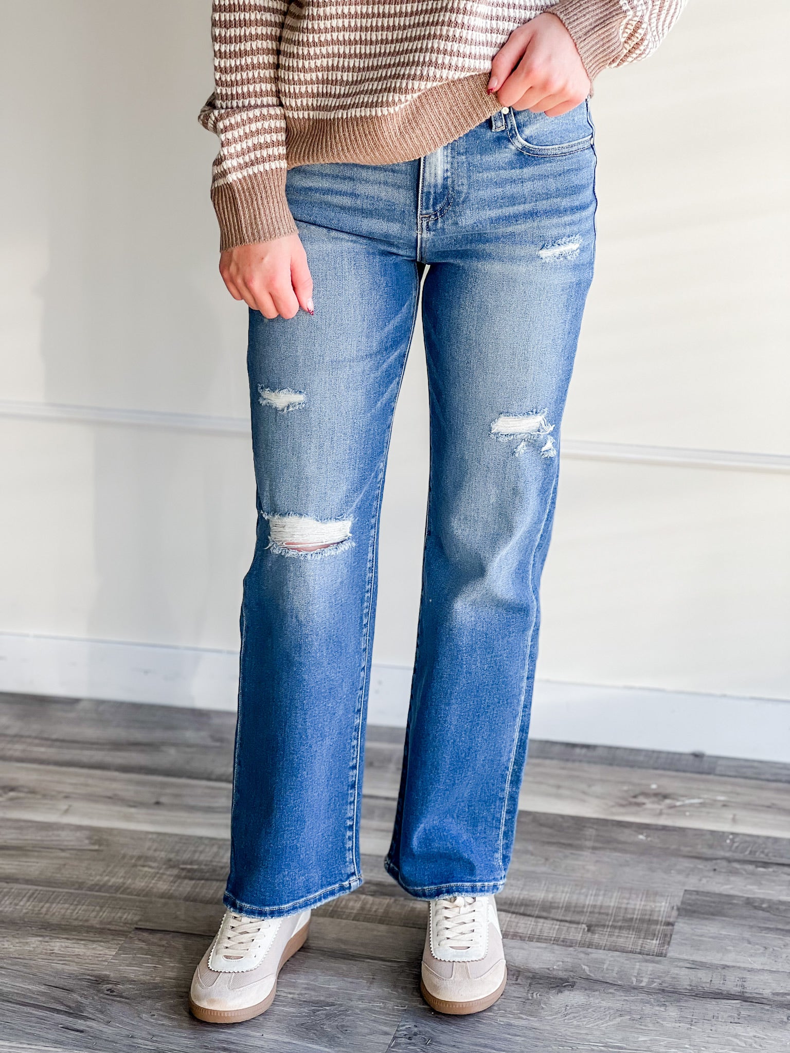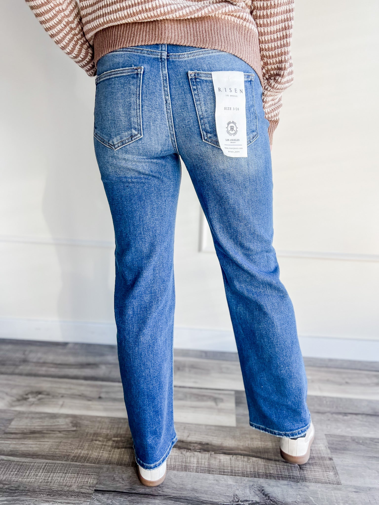 Easy, flattering, and full of laid-back charm — the Risen Medium Wash Distressed Straight Denim is your everyday go-to with just the right amount of edge. The high-rise waist smooths and flatters while light distressing keeps things casual and cool. The soft stretch denim makes them feel broken-in from day one — perfect for moms on the move and women who want comfort with style.