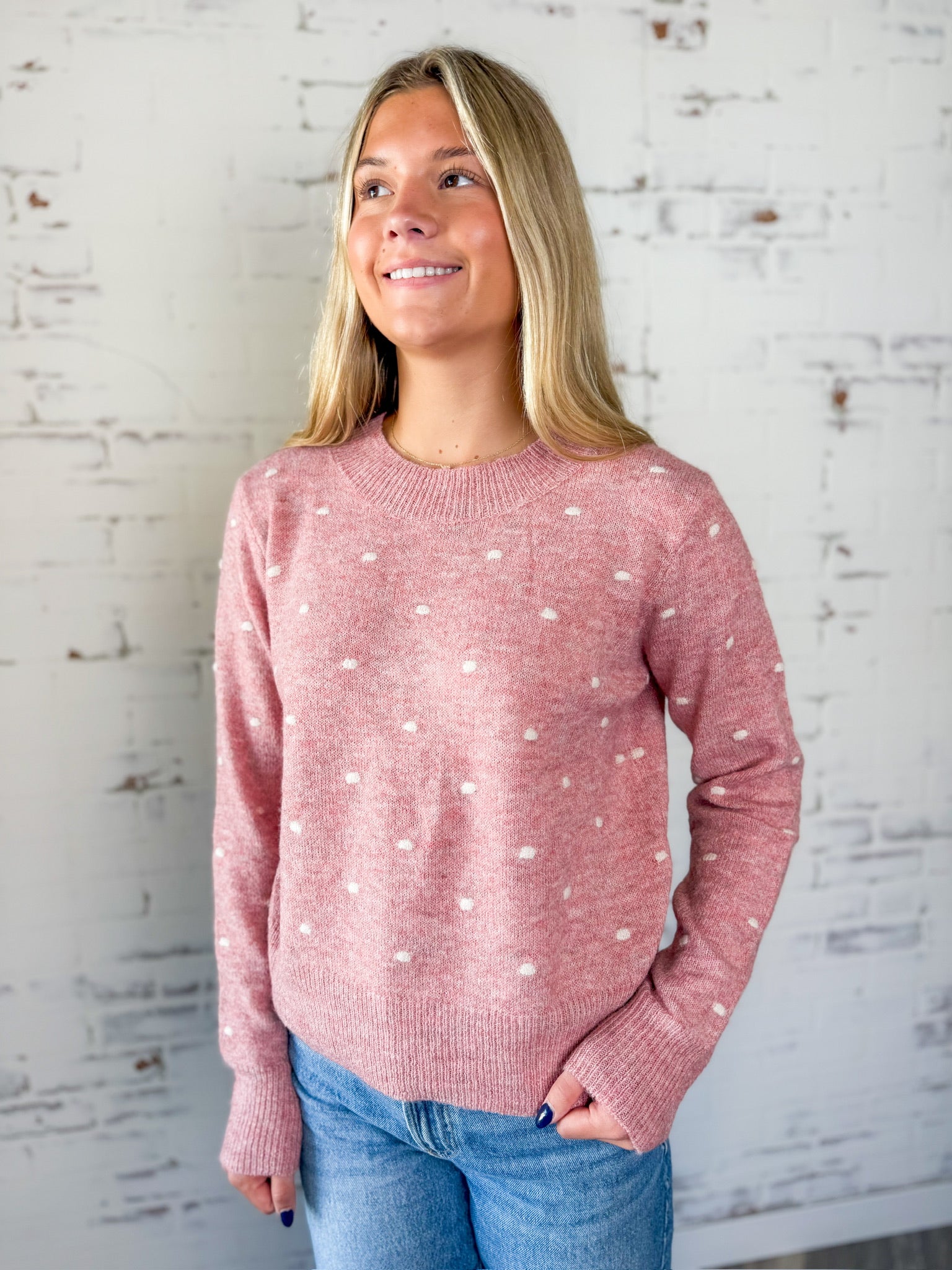 Sweet, soft, and ready for sweater weather—this blush pink knit with tiny white polka dots adds the perfect playful touch to your cold-weather lineup.