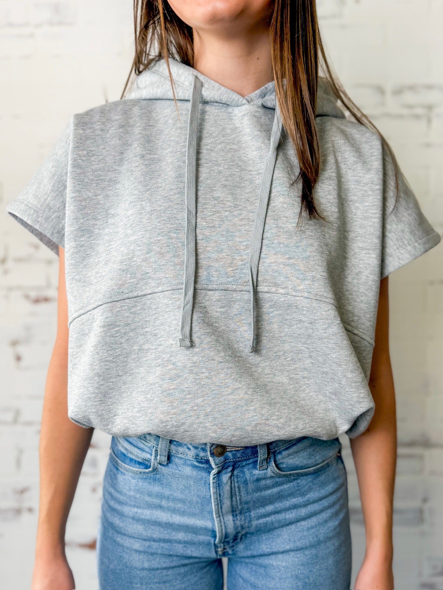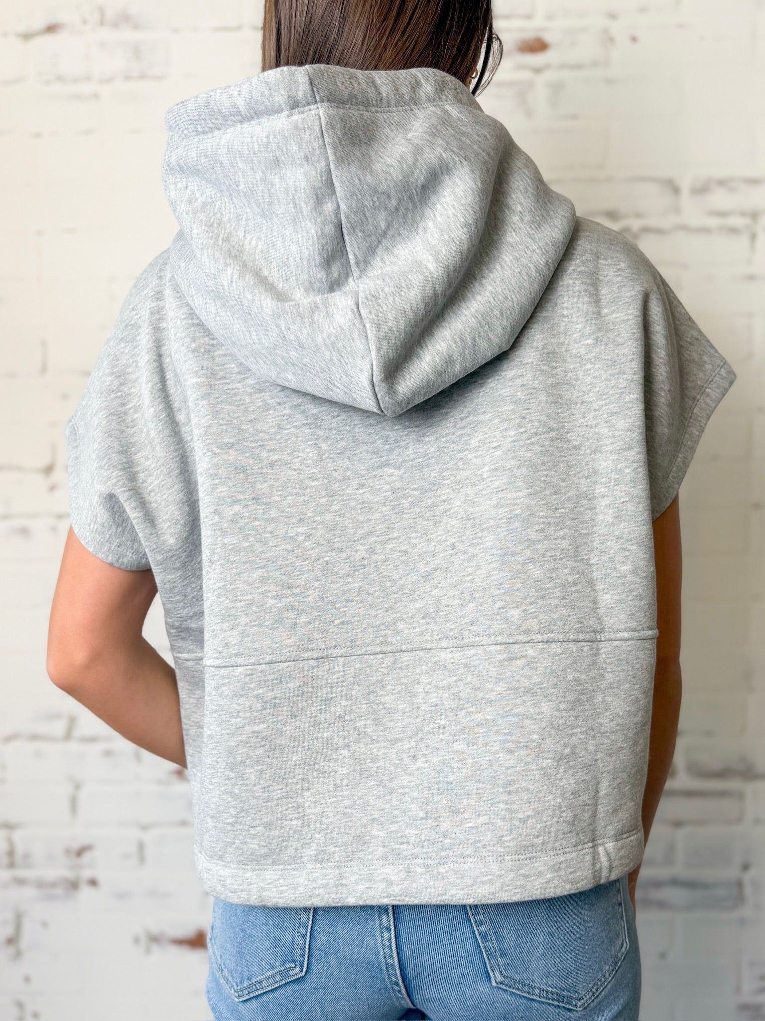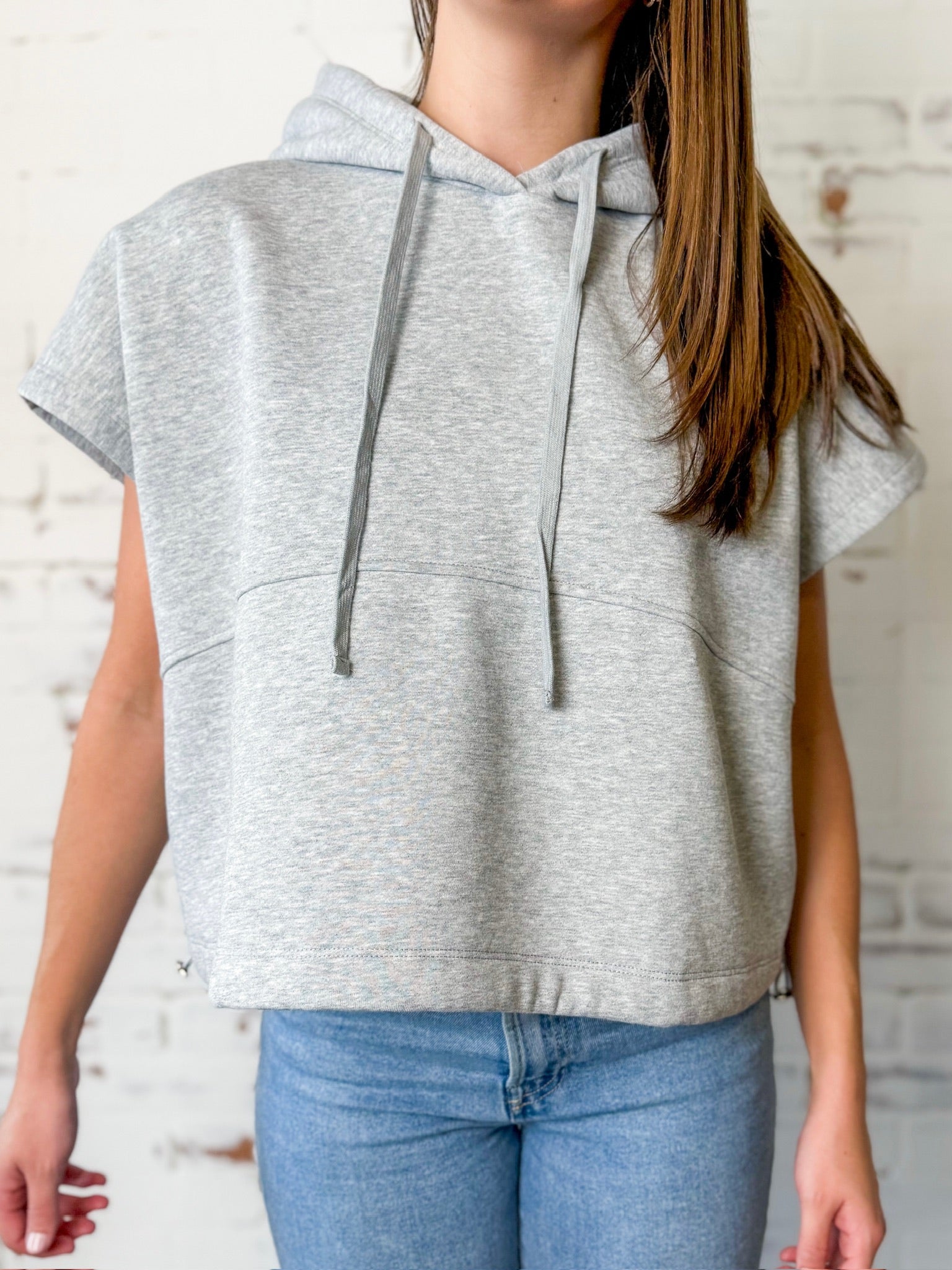 Athleisure meets everyday style with this laid-back sleeveless hoodie. Designed in a soft heather grey knit, it’s perfect for layering over tanks and tees or wearing solo with jeans and sneakers. The relaxed fit and drawstring hood make it both sporty and chic — an easy grab-and-go piece for coffee runs, errands, or casual weekends.