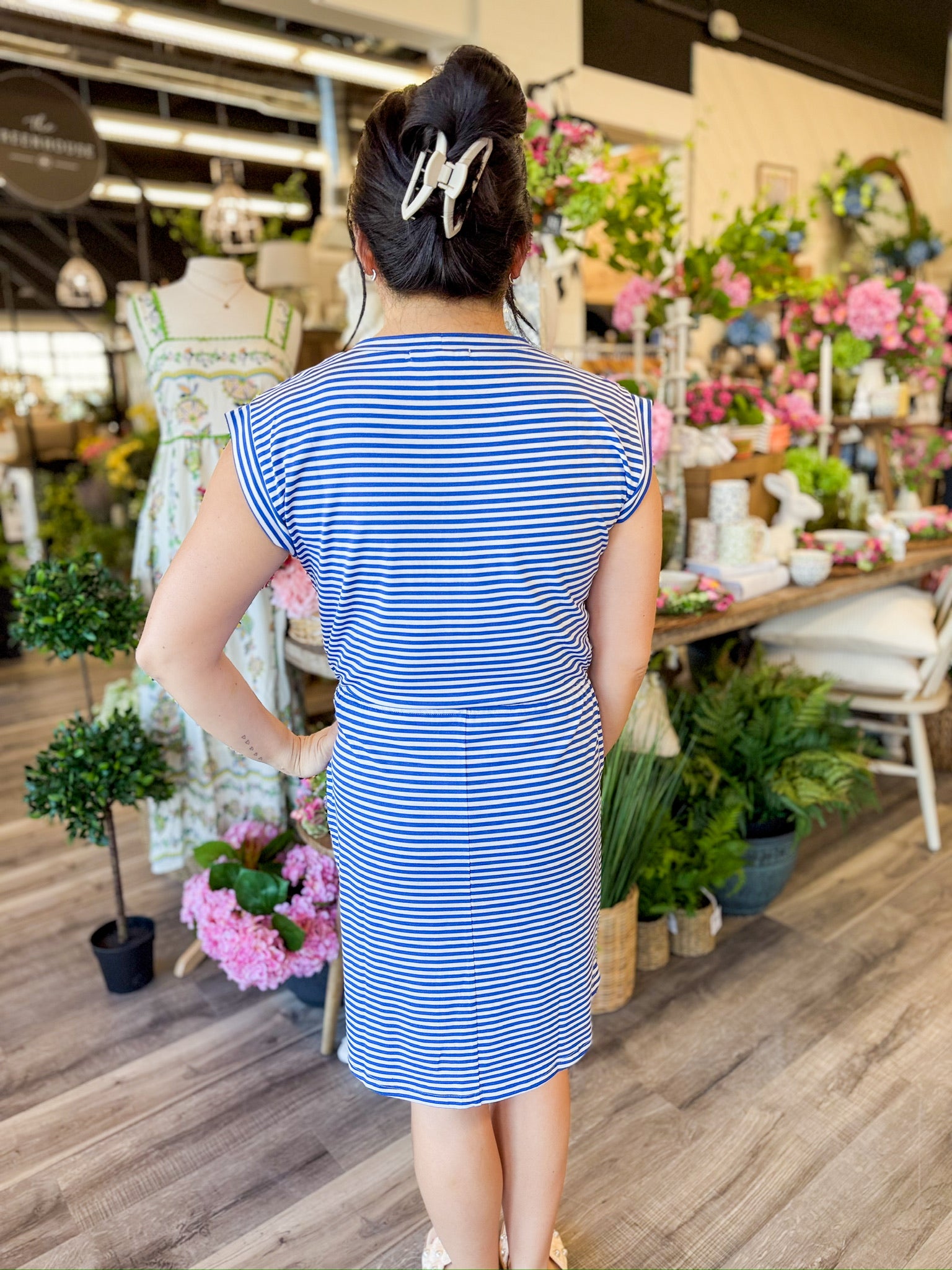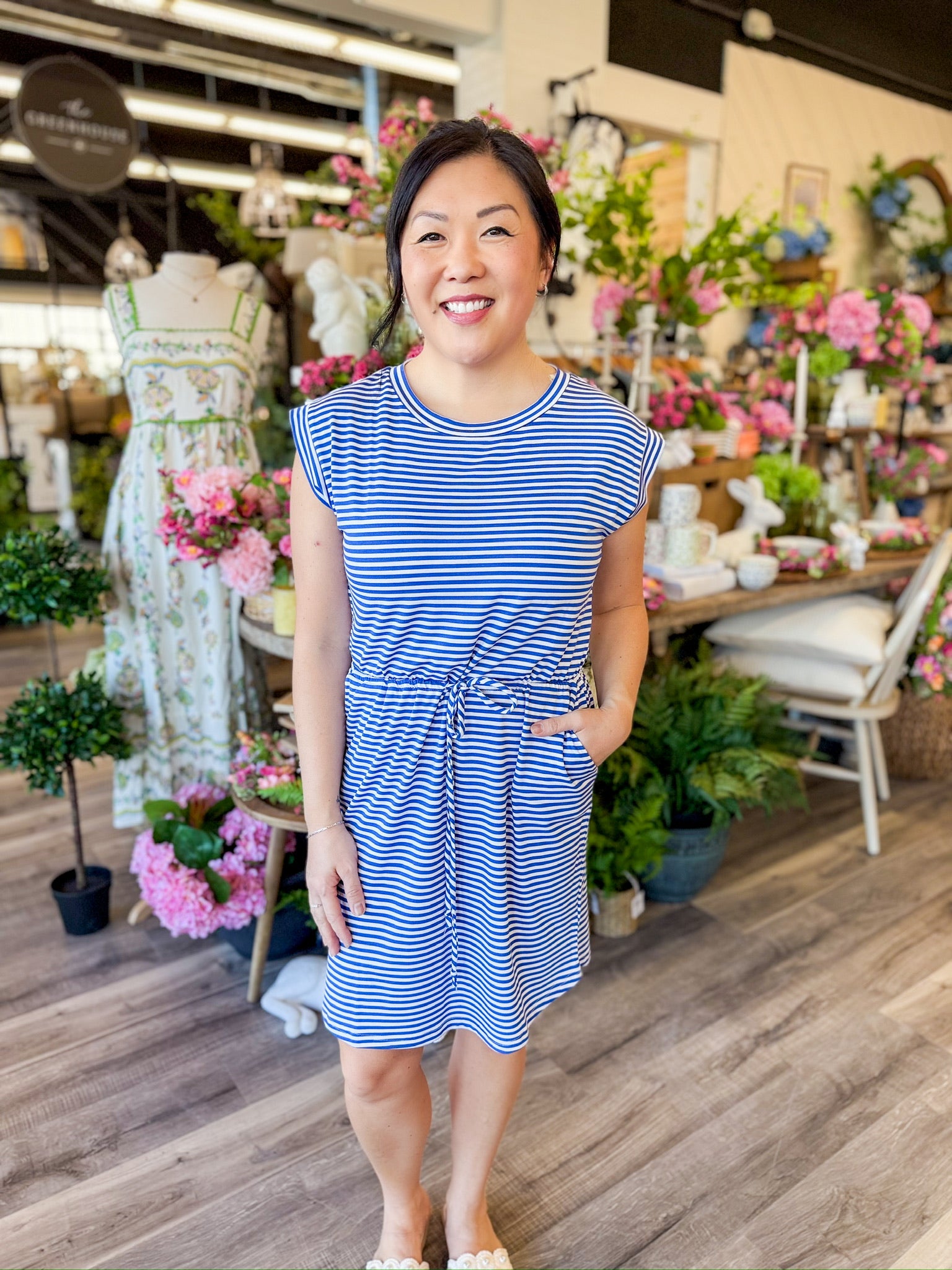 Classic stripes meet everyday comfort in this easy, throw-on-and-go dress. The Coastal Stripe Tie-Waist Dress features a soft crew neckline, cap sleeves and an adjustable drawstring waist that flatters without feeling restrictive. The lightweight fabric drapes beautifully while keeping things breathable and comfortable for all-day wear.
