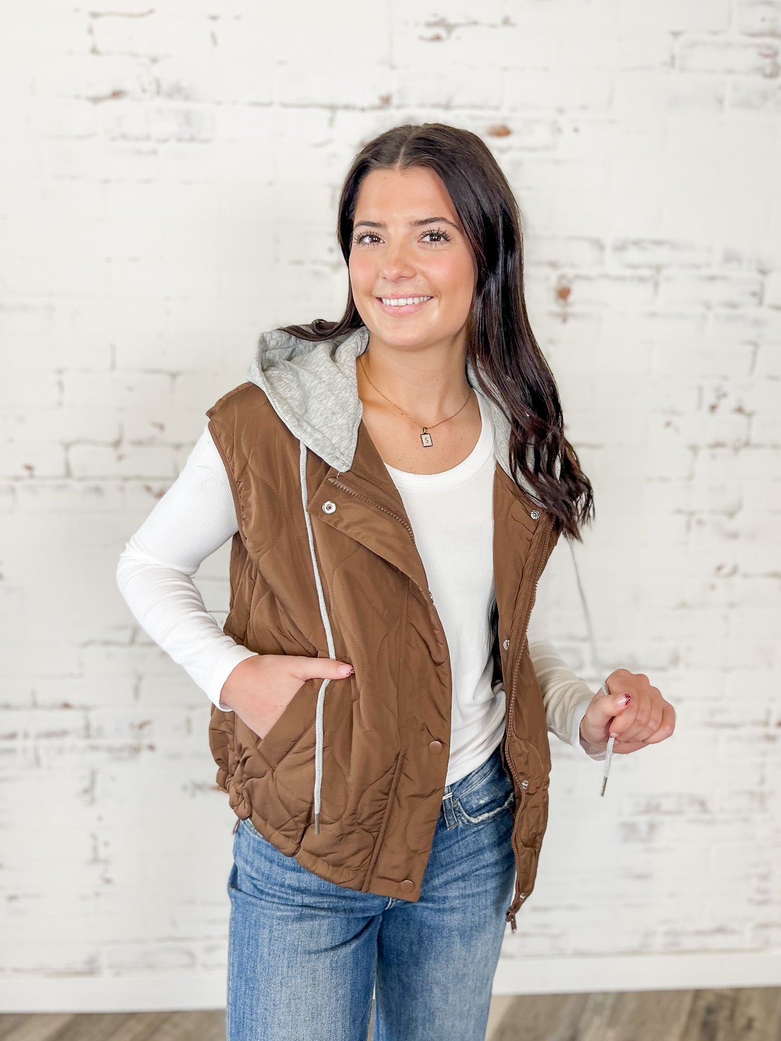 This quilted hooded vest is the perfect lightweight layer for days when you want to be comfy but still look put together. With its soft quilted texture, relaxed fit, and cozy hoodie lining, it brings that effortless “cool-girl fall” vibe to jeans, leggings, and long sleeves alike.