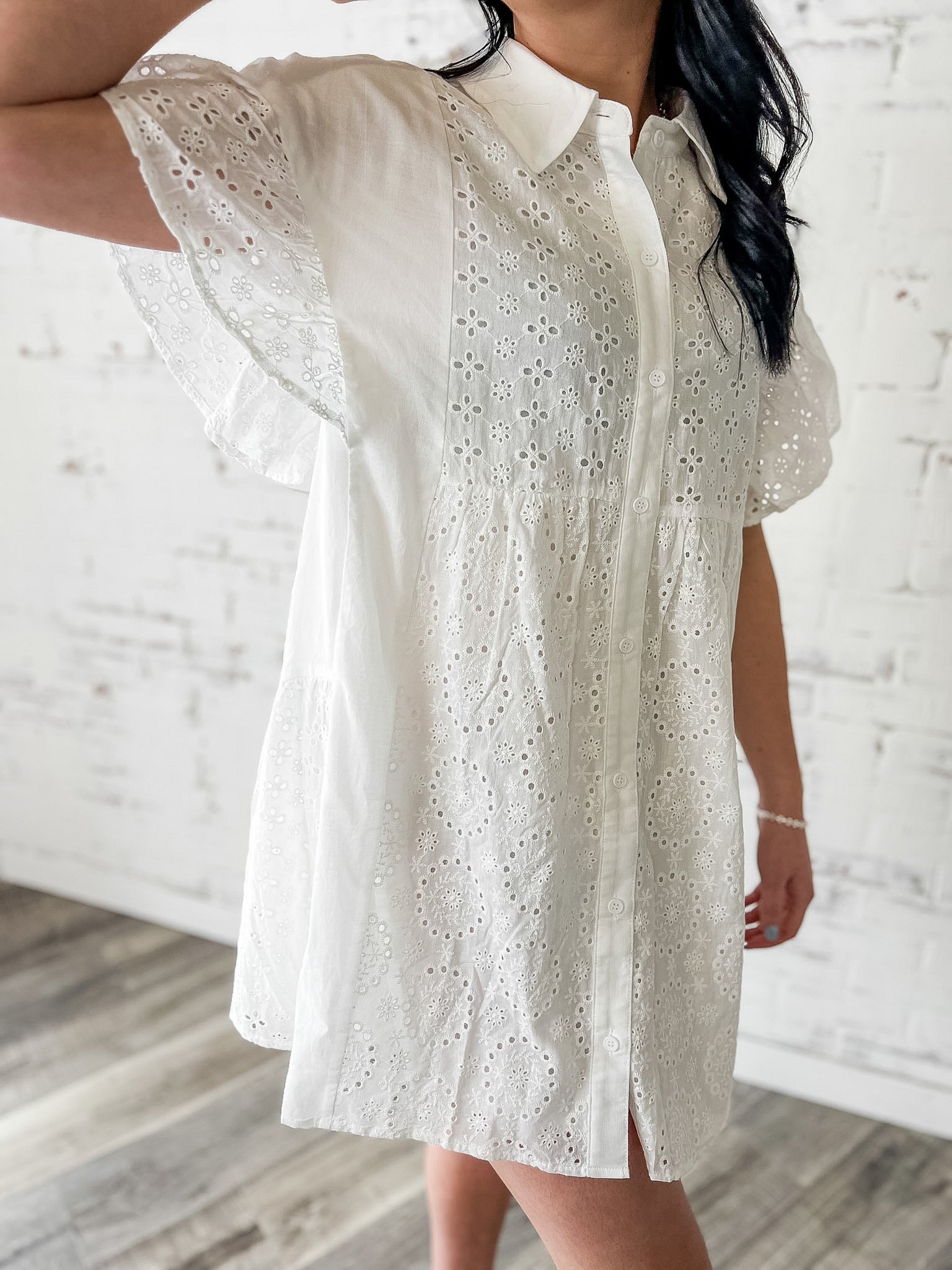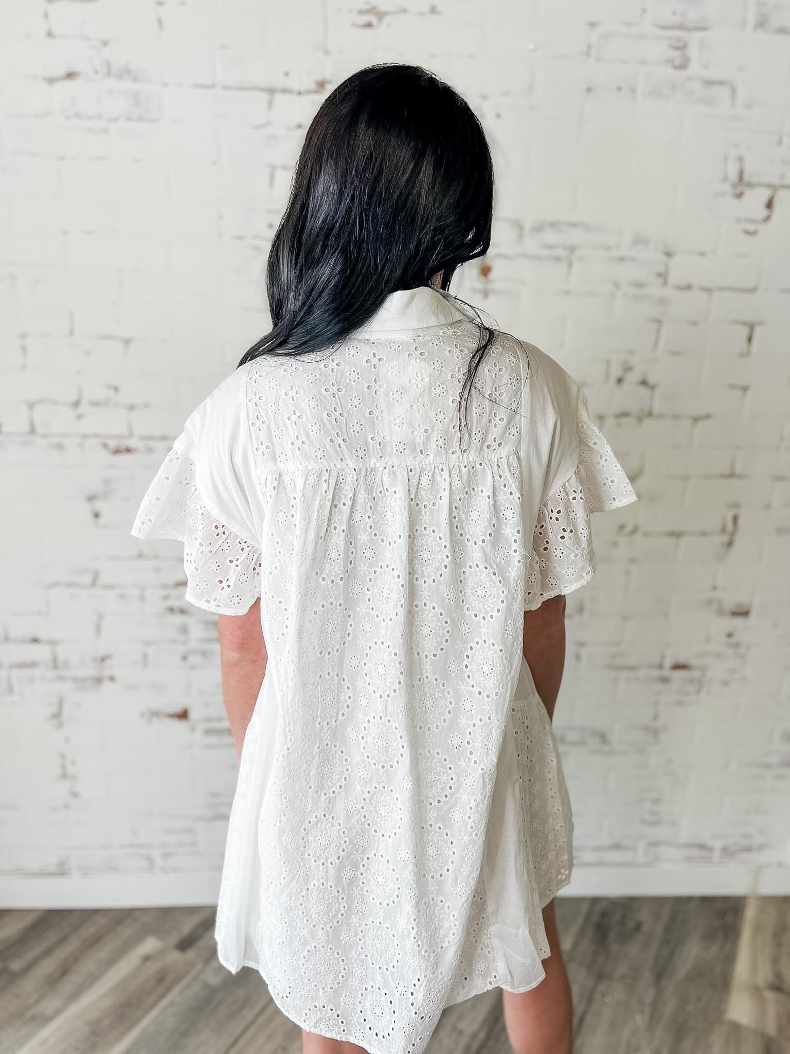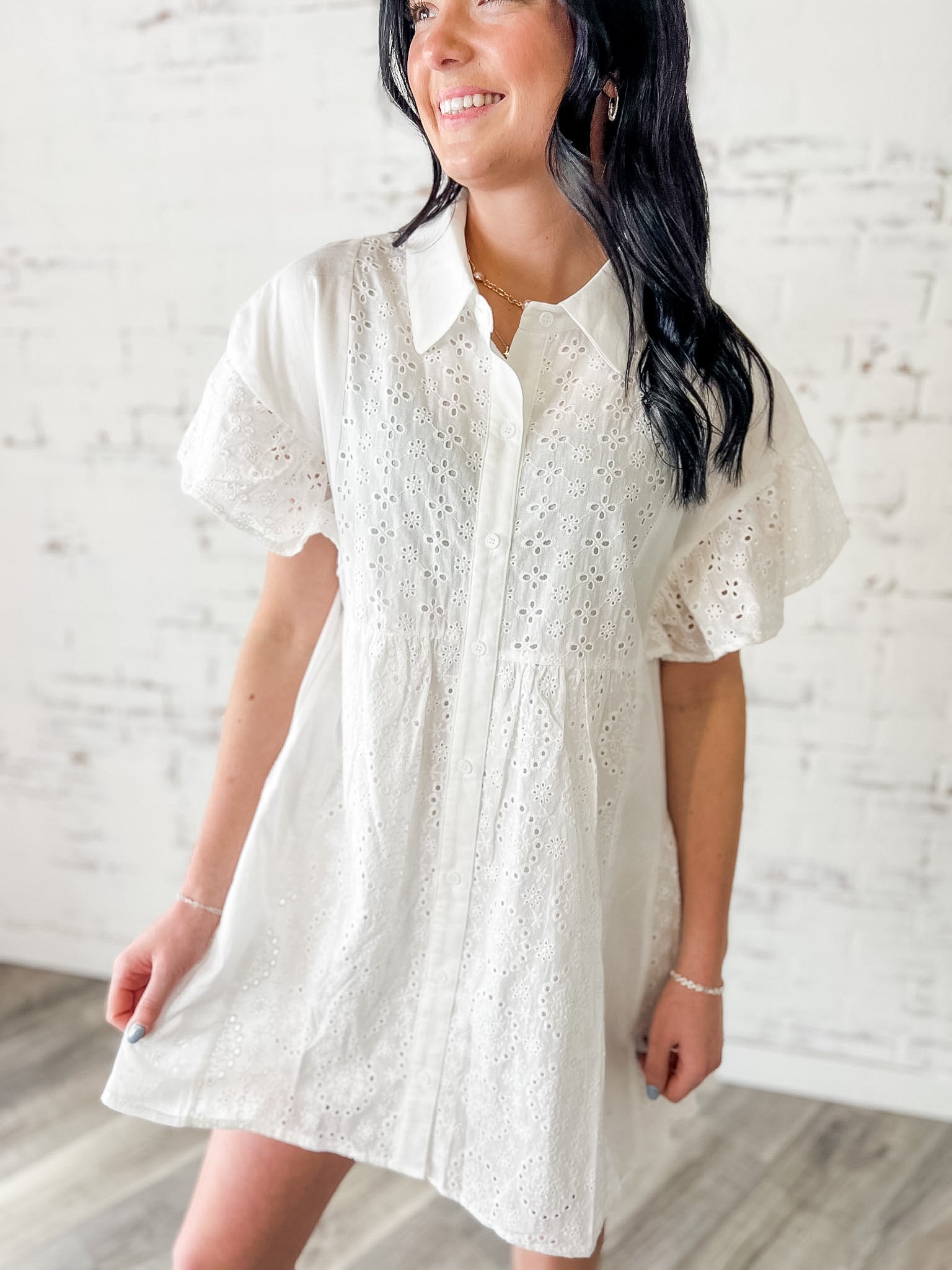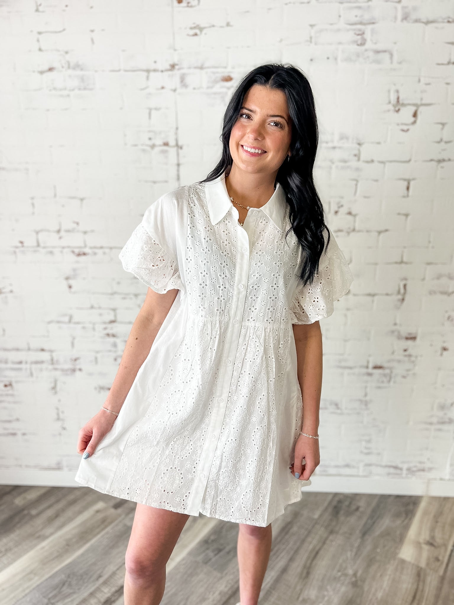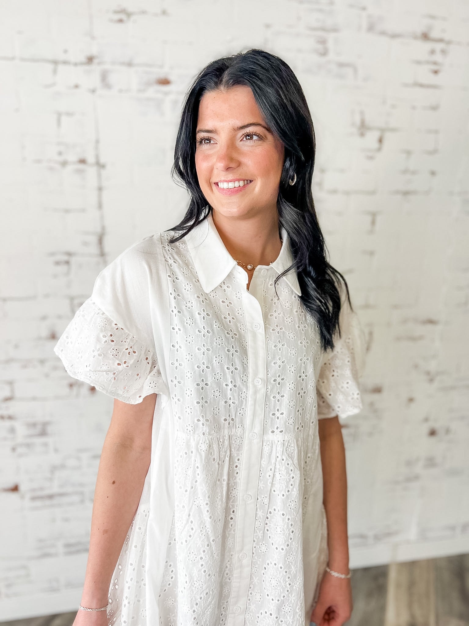 Light, airy and effortlessly feminine, the Sweet Eyelet Button Front Dress is the kind of piece that instantly feels like spring. The delicate eyelet embroidery adds beautiful texture while the relaxed silhouette keeps the look soft, comfortable and easy to wear.