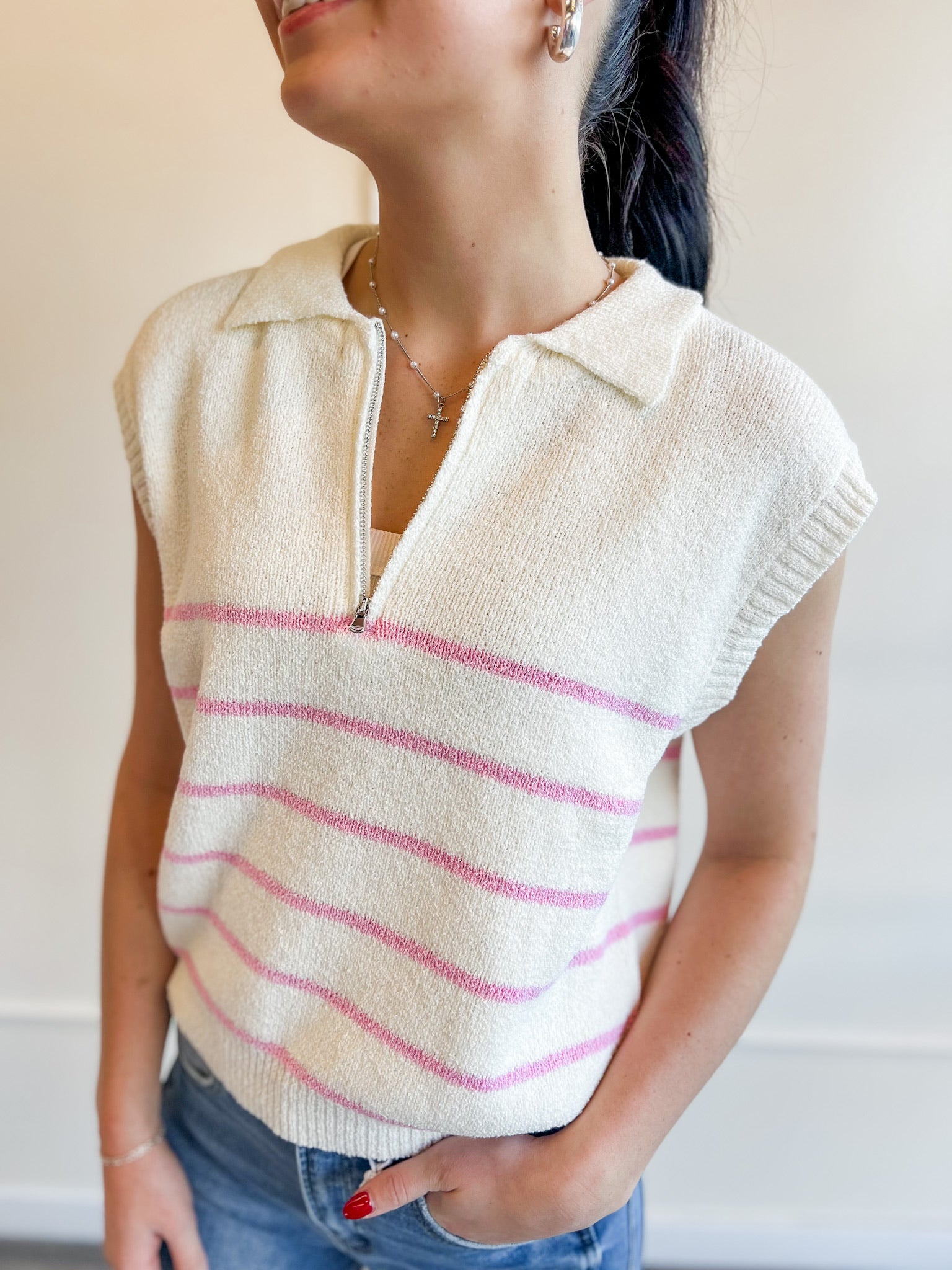 Available in green stripe and pink stripe, this sleeveless sweater vest is a fresh way to add color while keeping your outfit clean and classic. Pair it with denim, layer it over a fitted tank or tee, or style it with tailored trousers for a sporty-chic moment that works all season long.