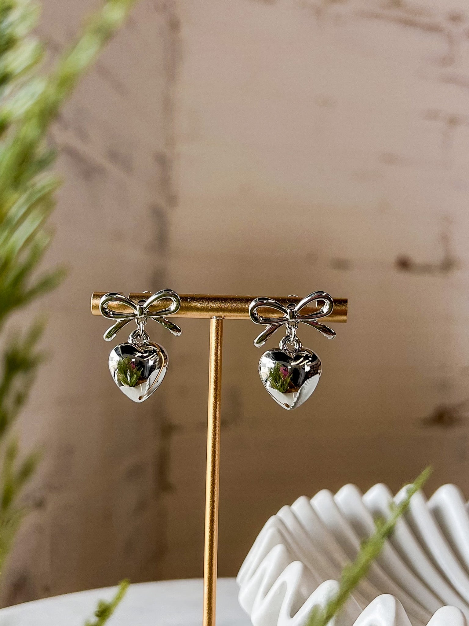 weet meets chic. These dainty bow studs with puffed heart drops bring just the right mix of playful charm and timeless elegance. Available in both gold and silver finishes, they’re lightweight, easy to wear, and perfect for dressing up your everyday look or adding a feminine touch to special occasions.