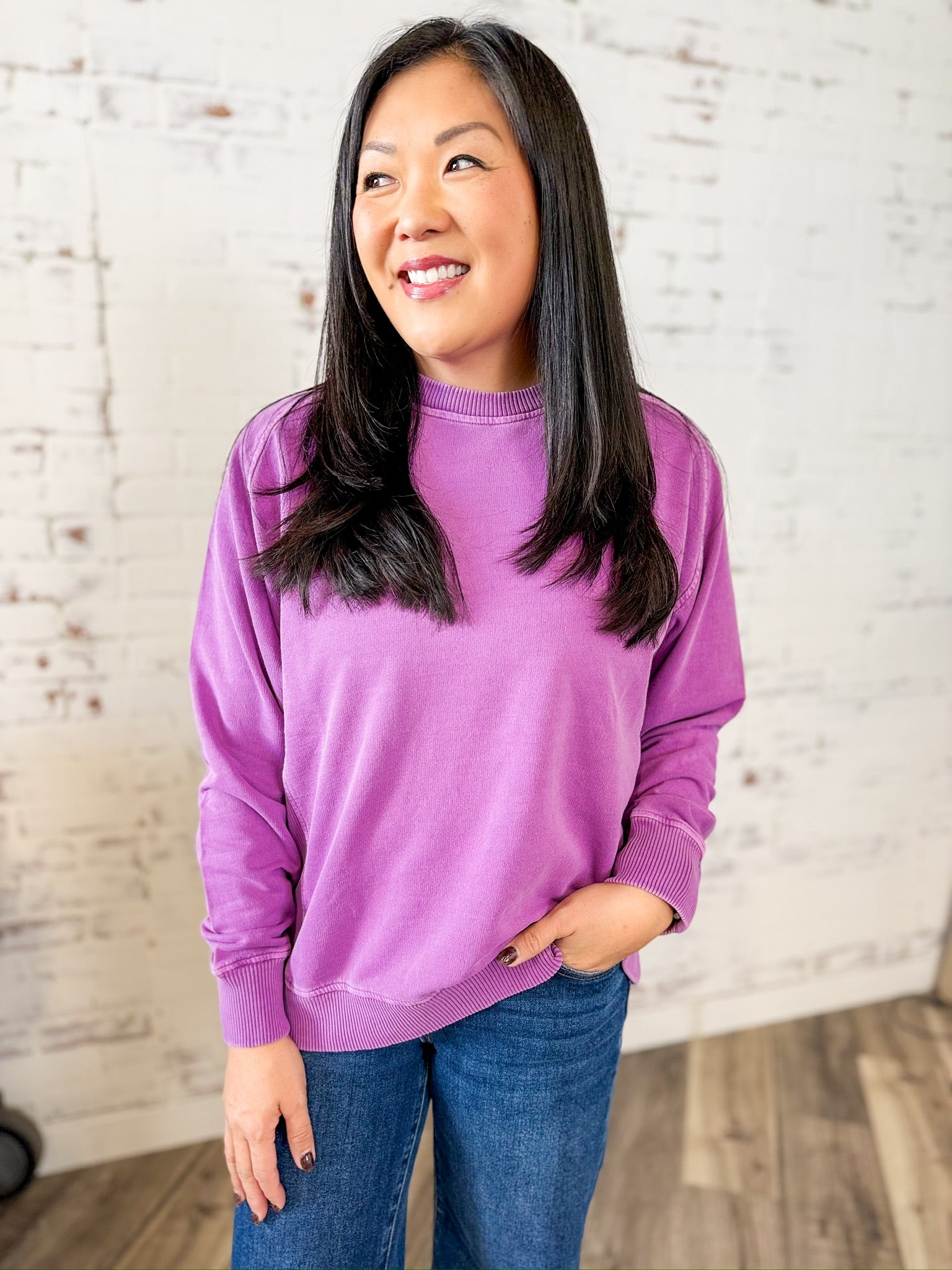 Soft, simple, and seriously comfy — this washed cotton crewneck is the definition of everyday ease. The relaxed fit, ribbed trim, and lived-in finish make it a grab-and-go favorite for layering or lounging. Pair it with denim, leggings, or joggers for that effortlessly put-together look we all love.