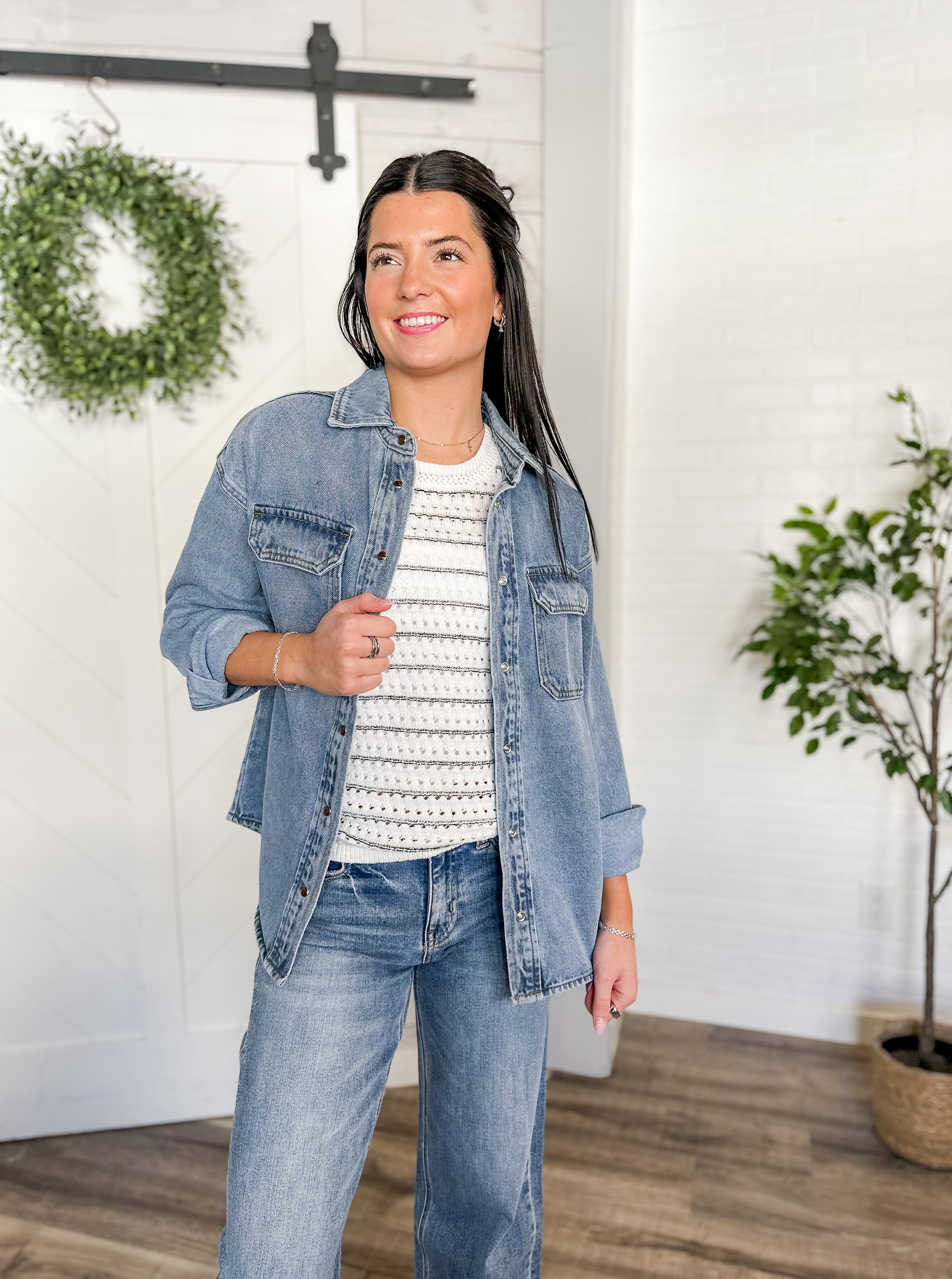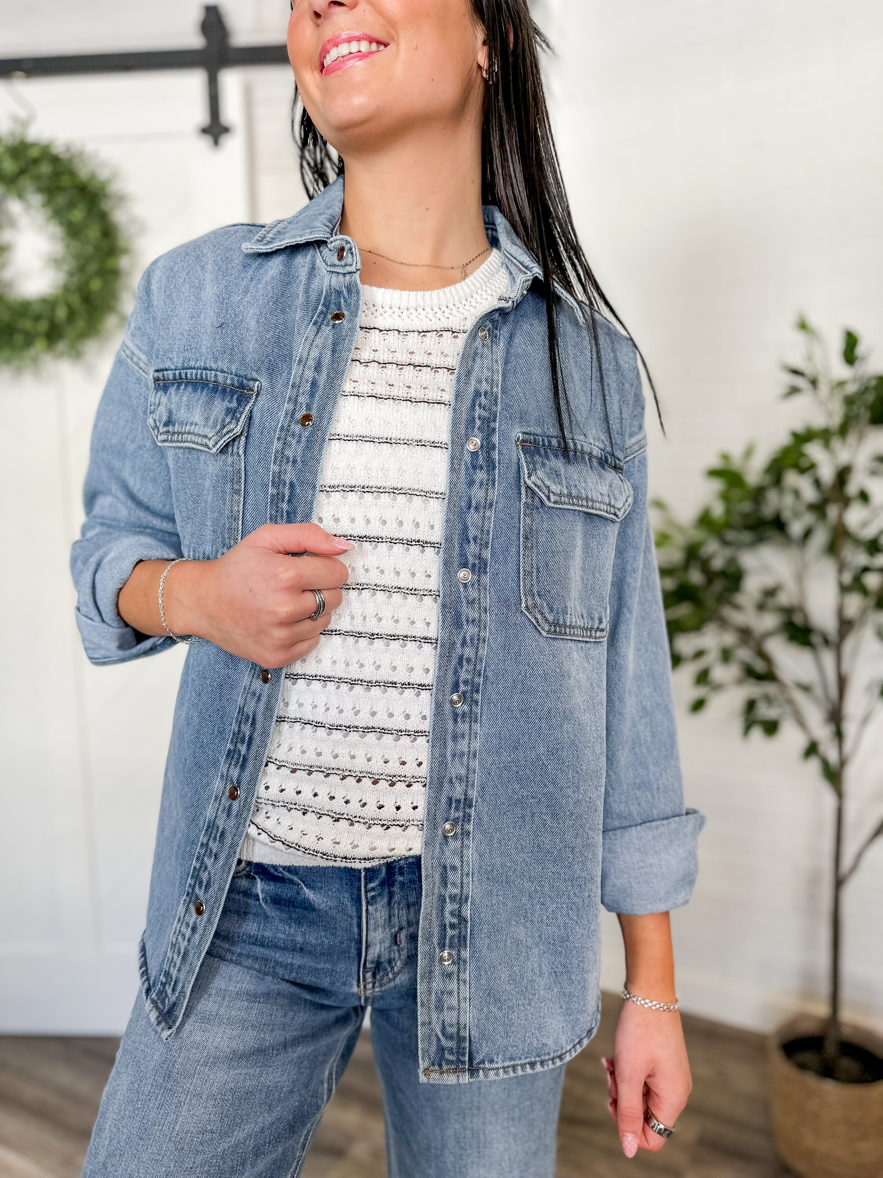 Throw it over a lightweight knit, a graphic tee or a dress for instant structure without feeling stiff. Wear it open with wide leg jeans for an easy denim-on-denim look or layer it over a tank and shorts on cool summer nights. This is the kind of jacket you’ll keep by the door because it goes with everything.