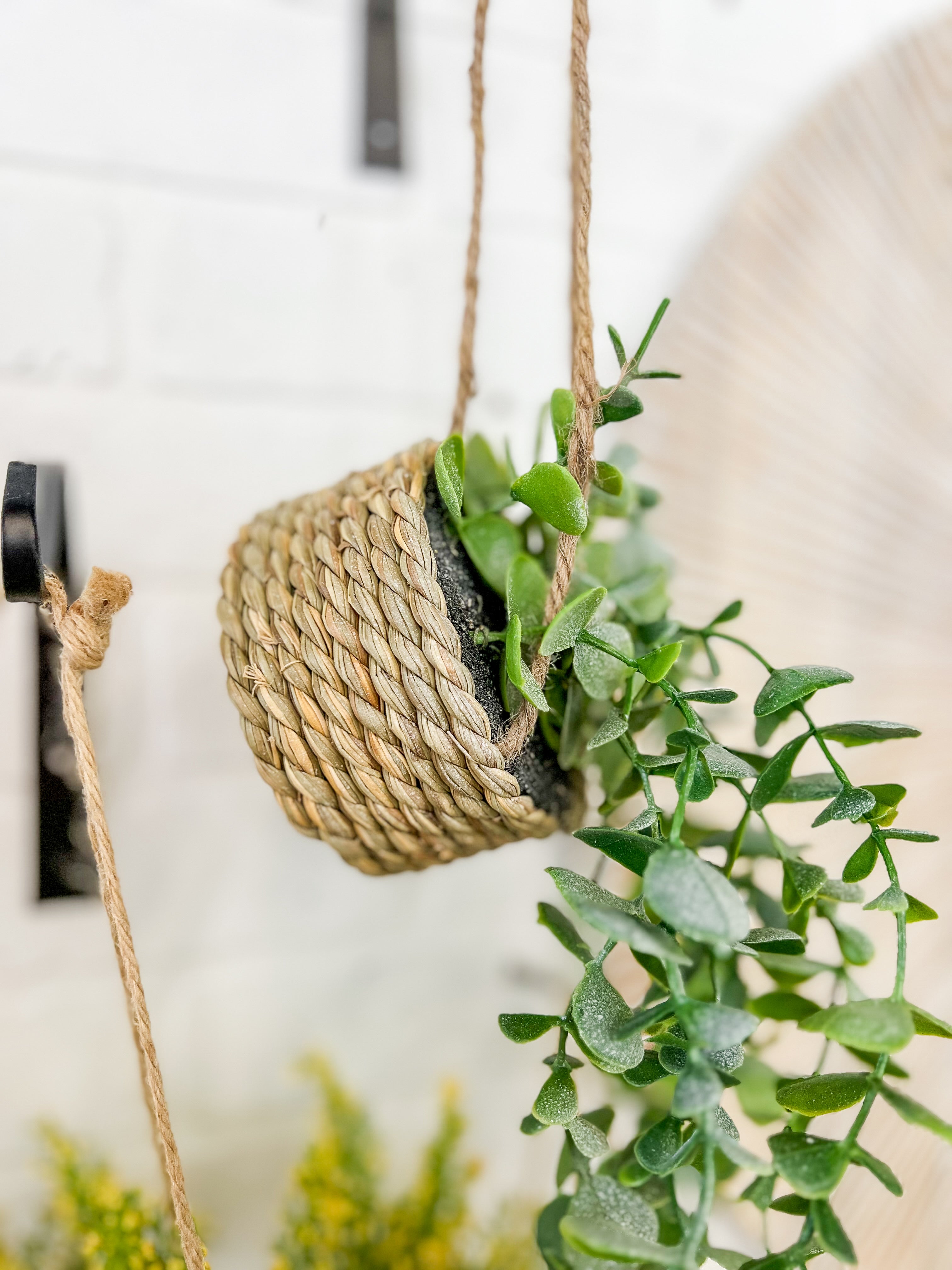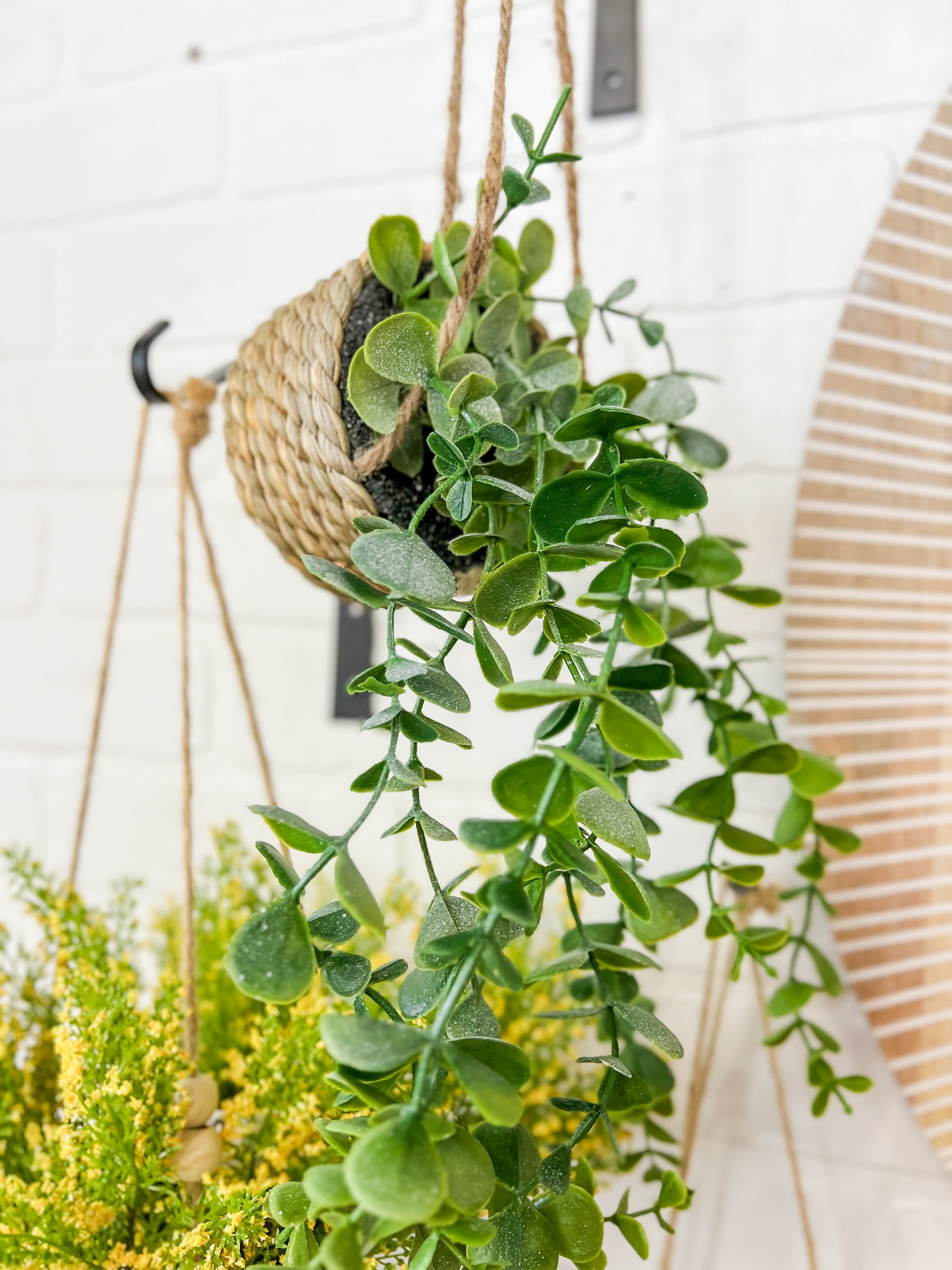 Add a boho touch to your home with these eucalyptus hanging planters. We love the basket detail, twine string hangers and soft green eucalyptus leaves. Can be used on its own or dropped in a different pot. Measures 18" in total length.