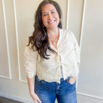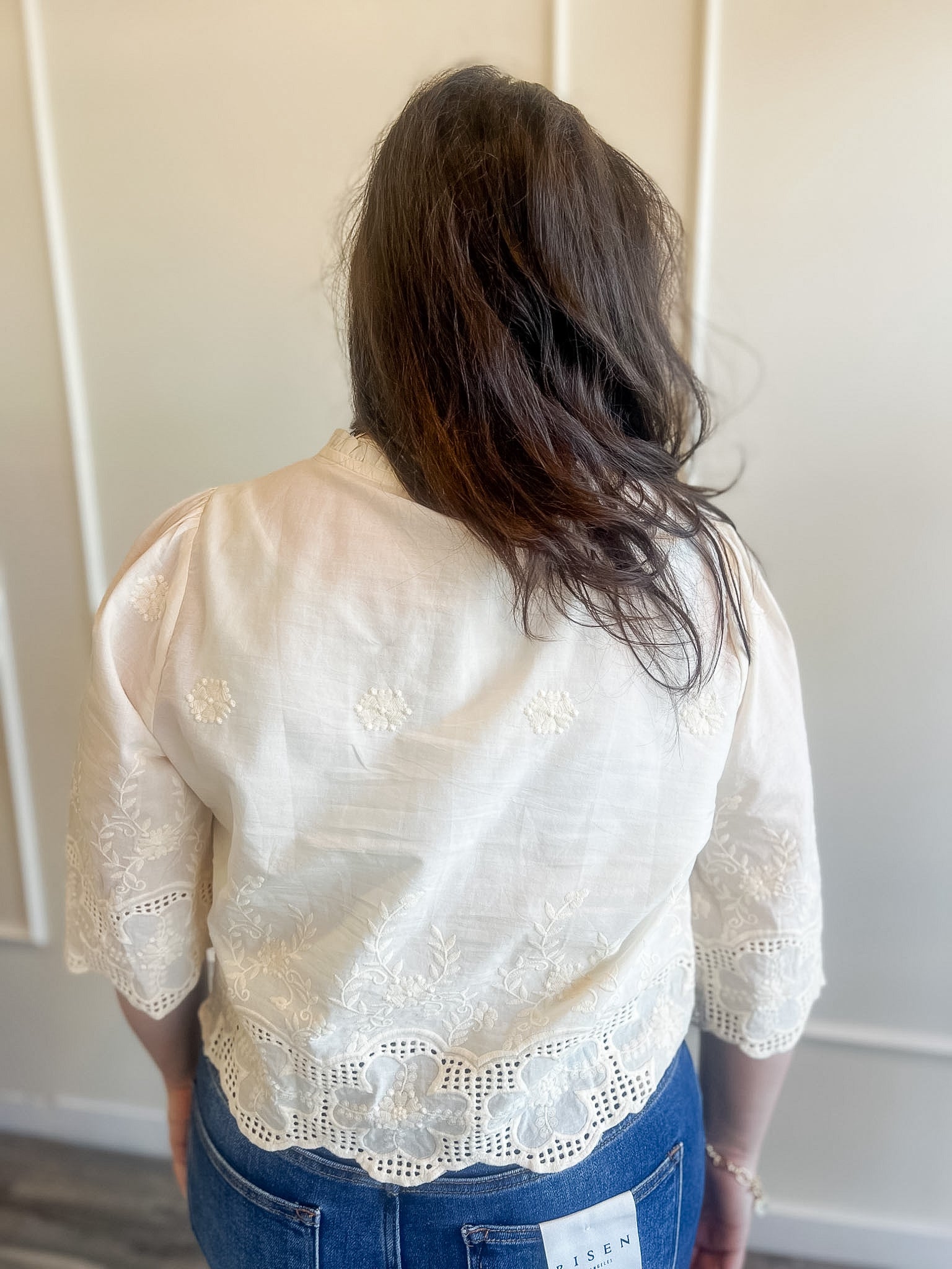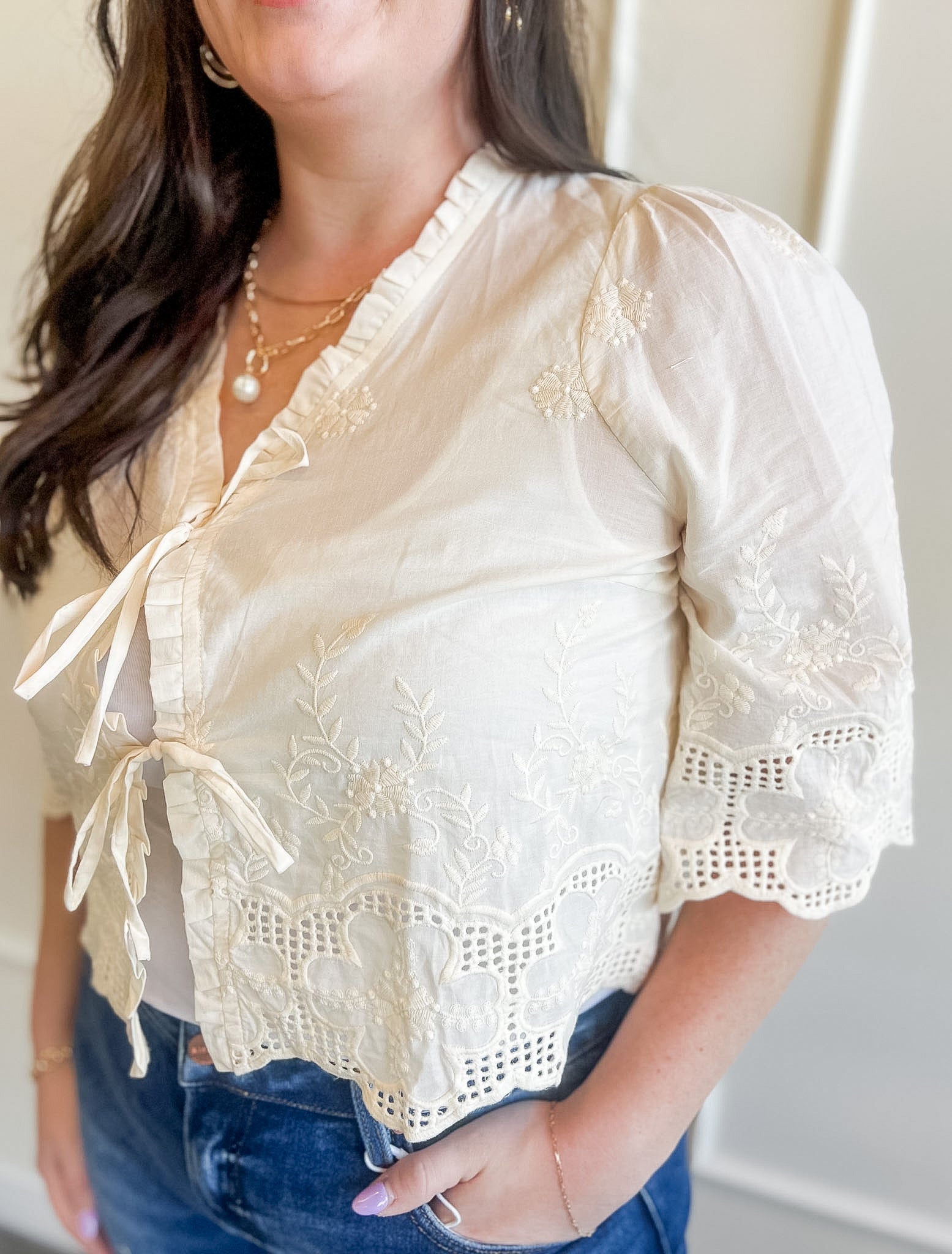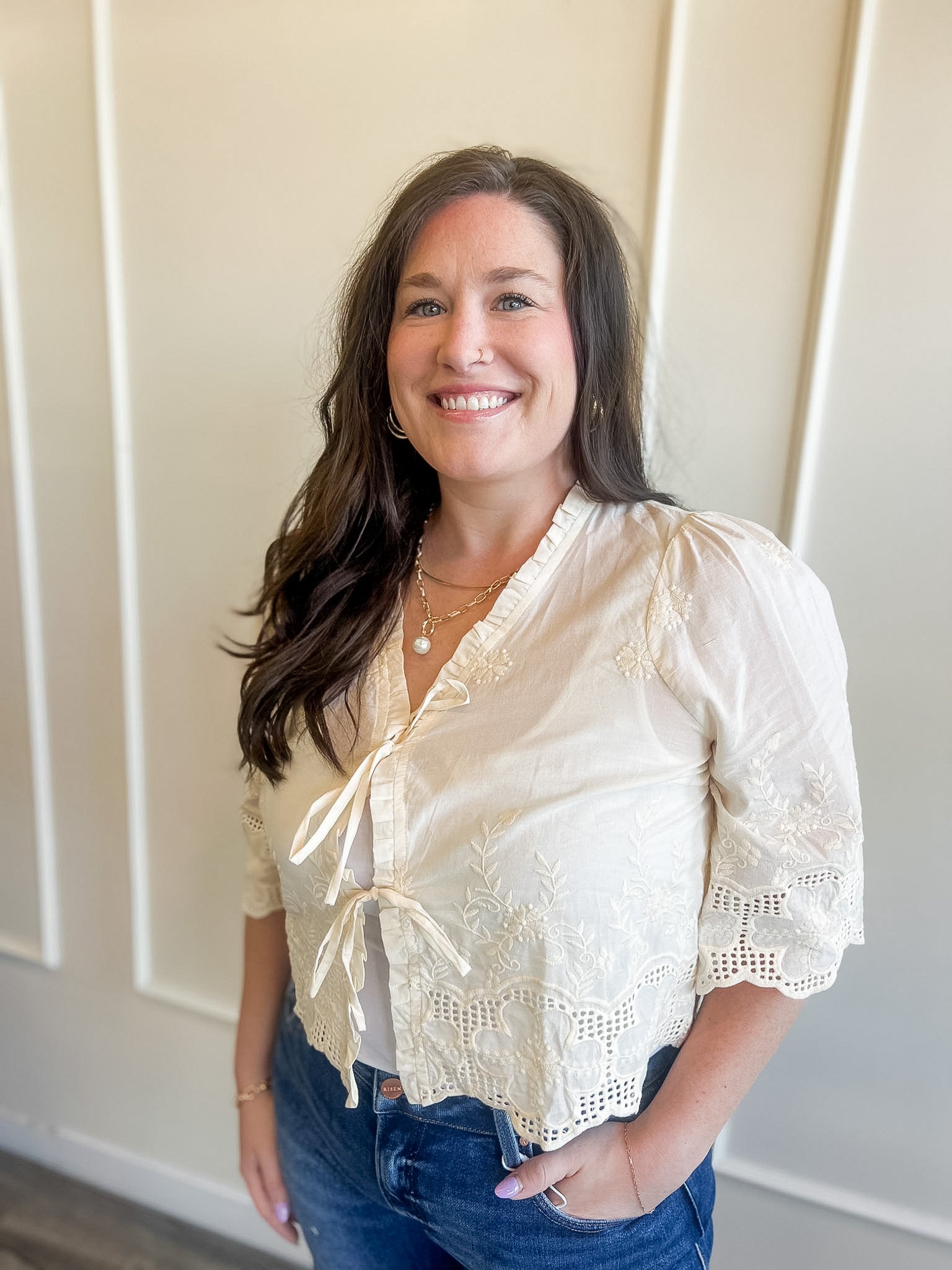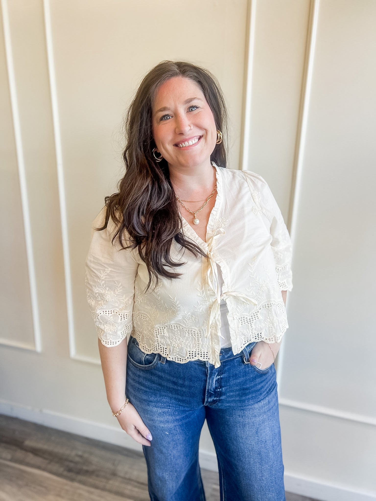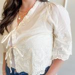 This is one of those tops that feels extra special the second you put it on. The delicate lace details and soft cotton fabric give it that vintage-inspired charm, while the tie front keeps it relaxed and easy to style. It’s feminine without feeling fussy and adds instant interest to even your most basic outfits.