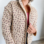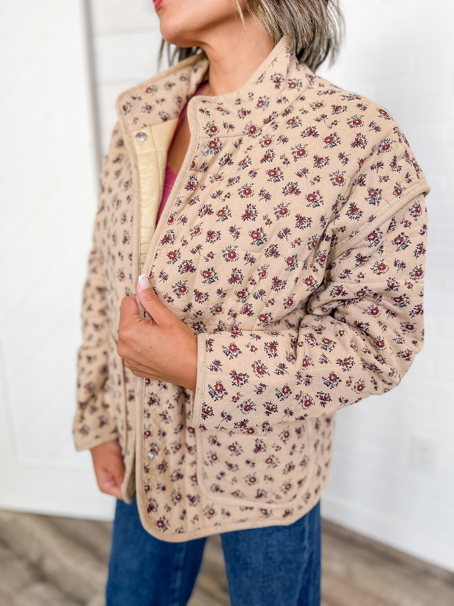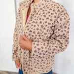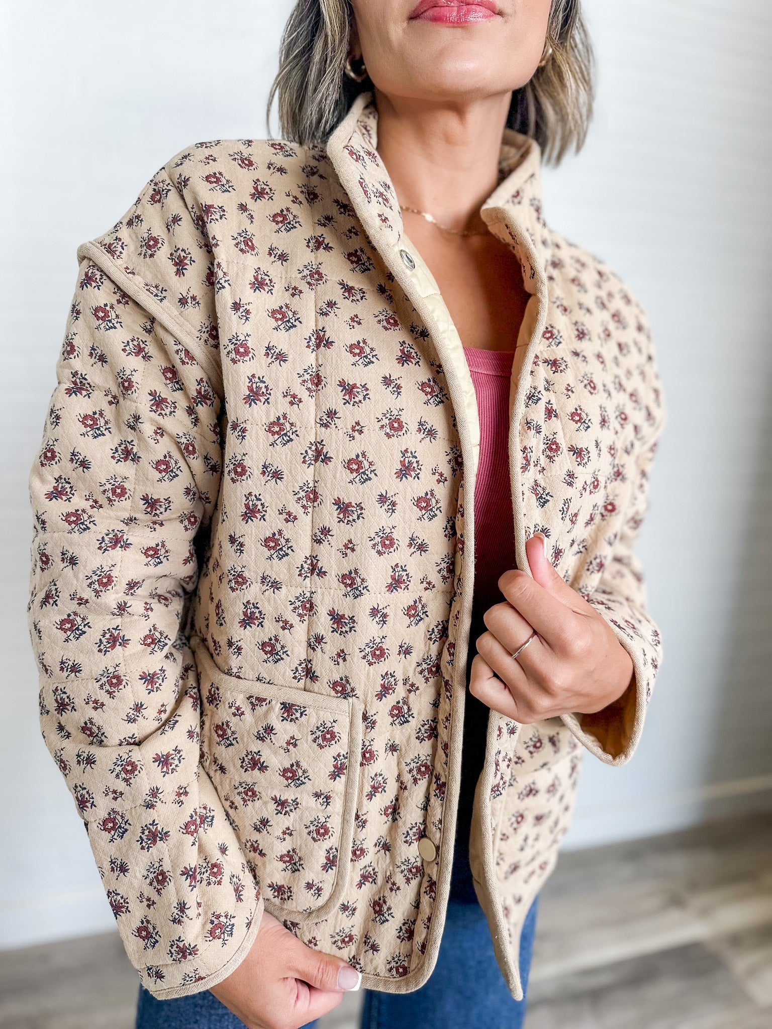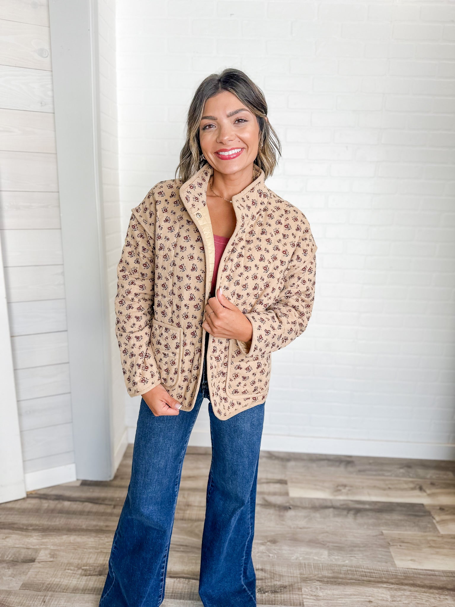 Vintage charm meets everyday comfort. This cream quilted jacket features a dainty floral print, soft lining, and an easy snap-front design. Perfect for layering over basics or dresses when the air turns crisp. Rachel is 5’2” and wearing a size small.