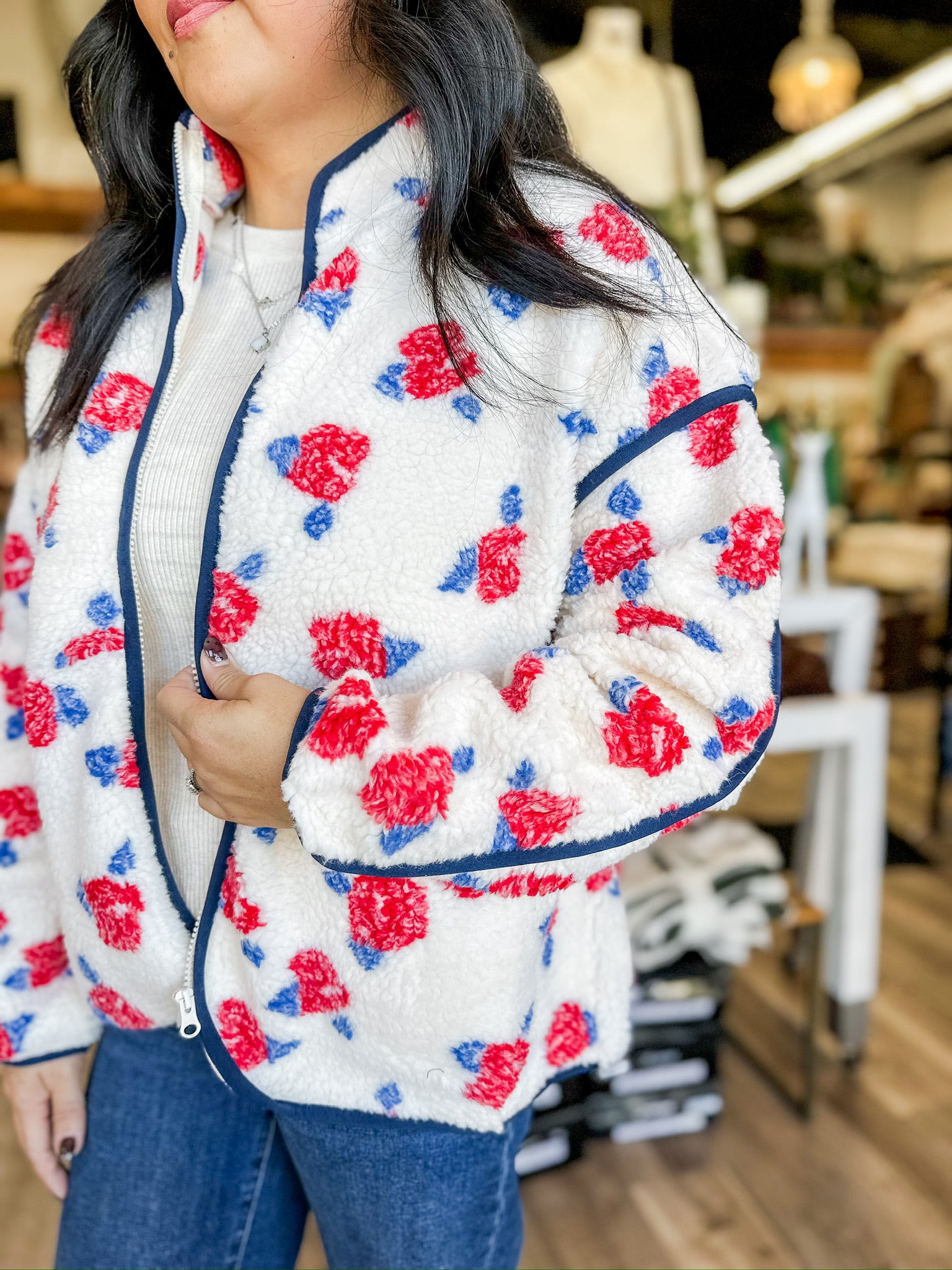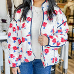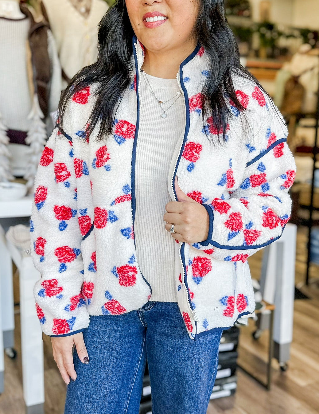 The Ivory & Red Flower Fleece Jacket features a full-zip front, contrast trim, and a relaxed fit that makes layering effortless. Colbie is 5'4 wearing size small, showing just how easy it pairs with denim or leggings for a cute, comfy, and practical cold-weather outfit.