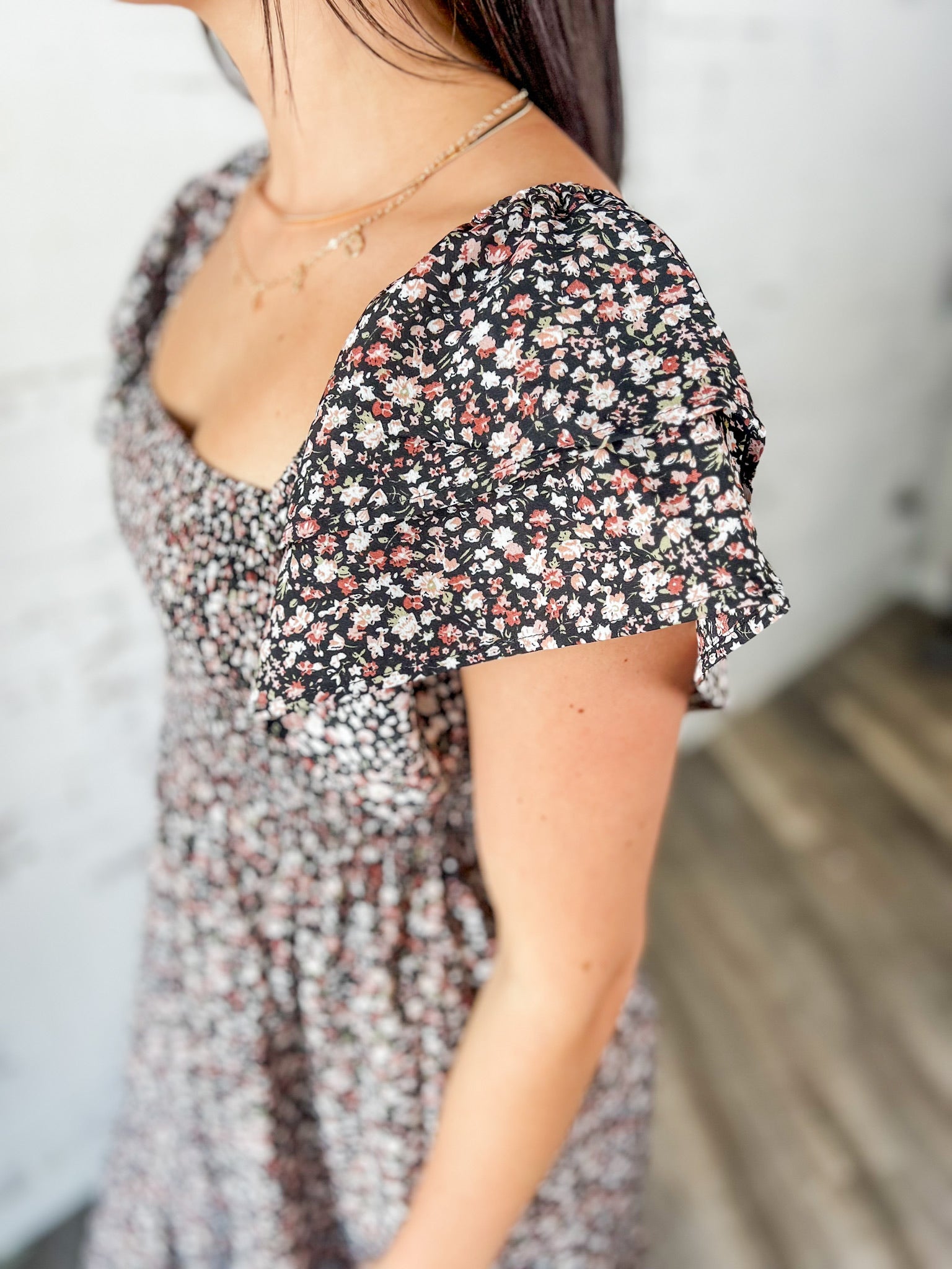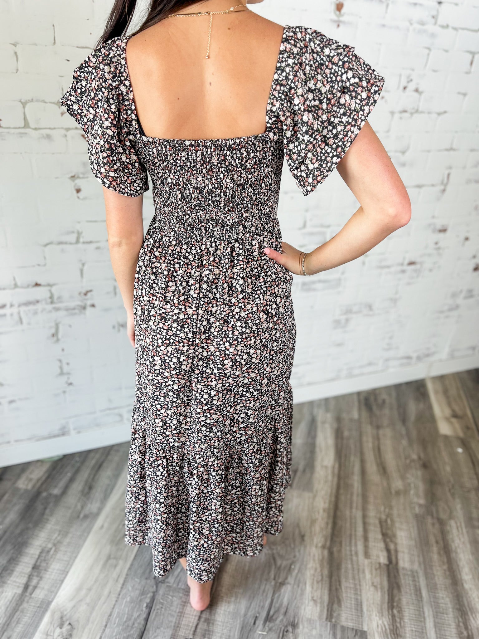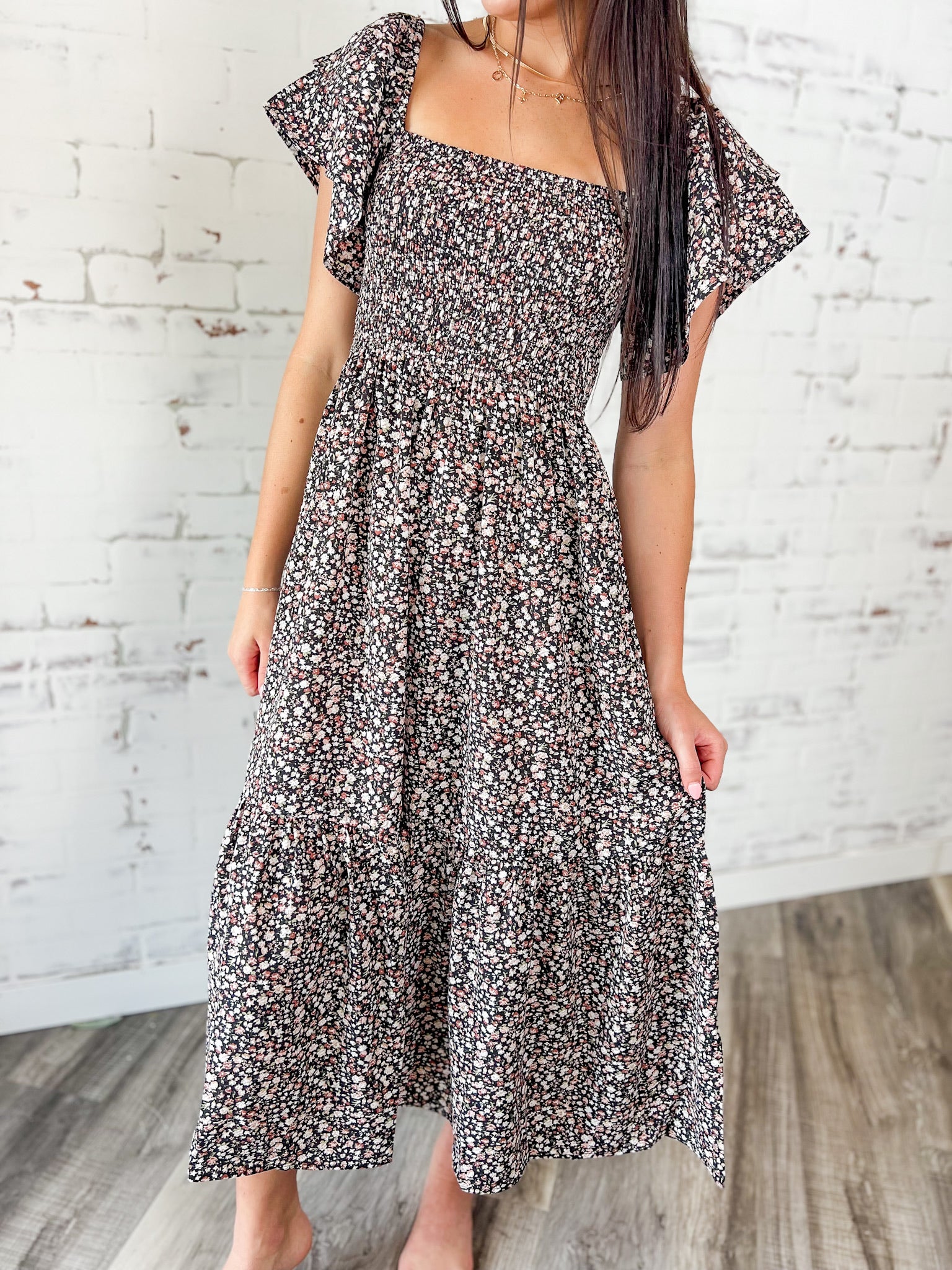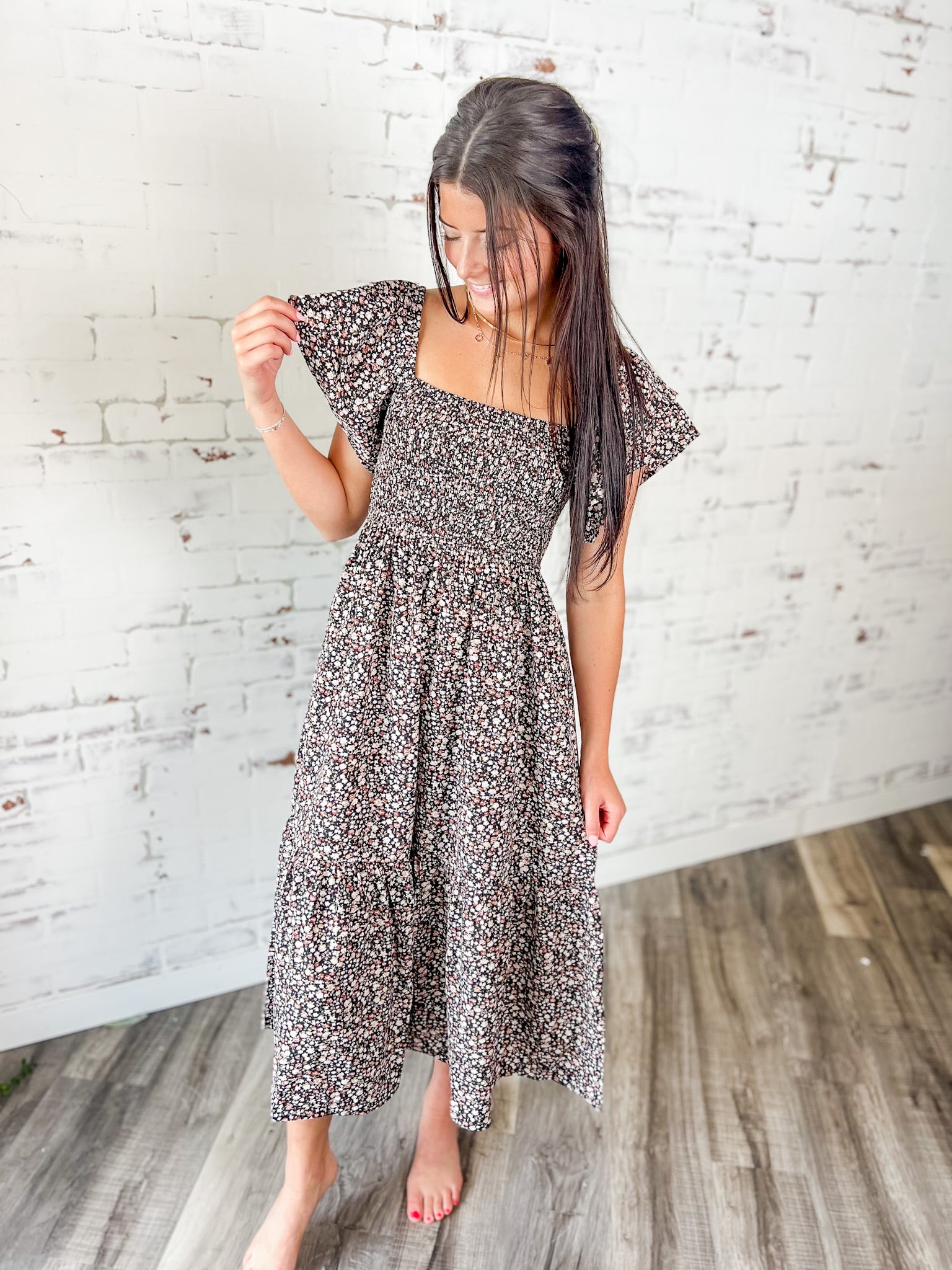 Flirty, flowy, and effortlessly sweet—this smocked floral midi dress is everything your autumn wardrobe’s been waiting for. The flutter sleeves and stretchy bodice make it ultra flattering, whether you’re apple picking or heading to a fall bridal shower.