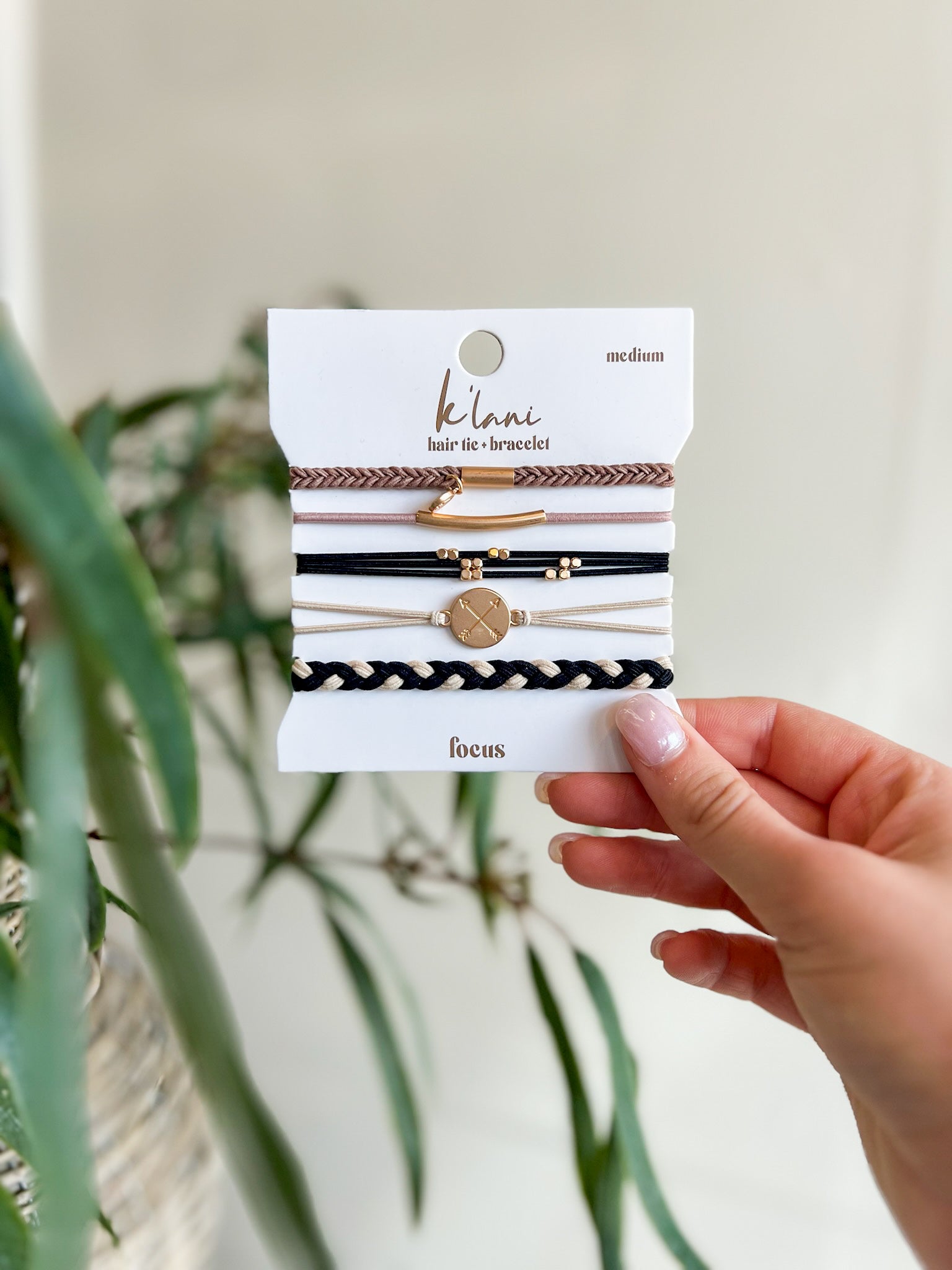 Double duty never looked so chic. These K’lani hair ties are pretty enough to stack as bracelets and strong enough to keep your messy bun in place. The Focus set features neutral tones, gold accents, and braided textures you’ll reach for daily.
