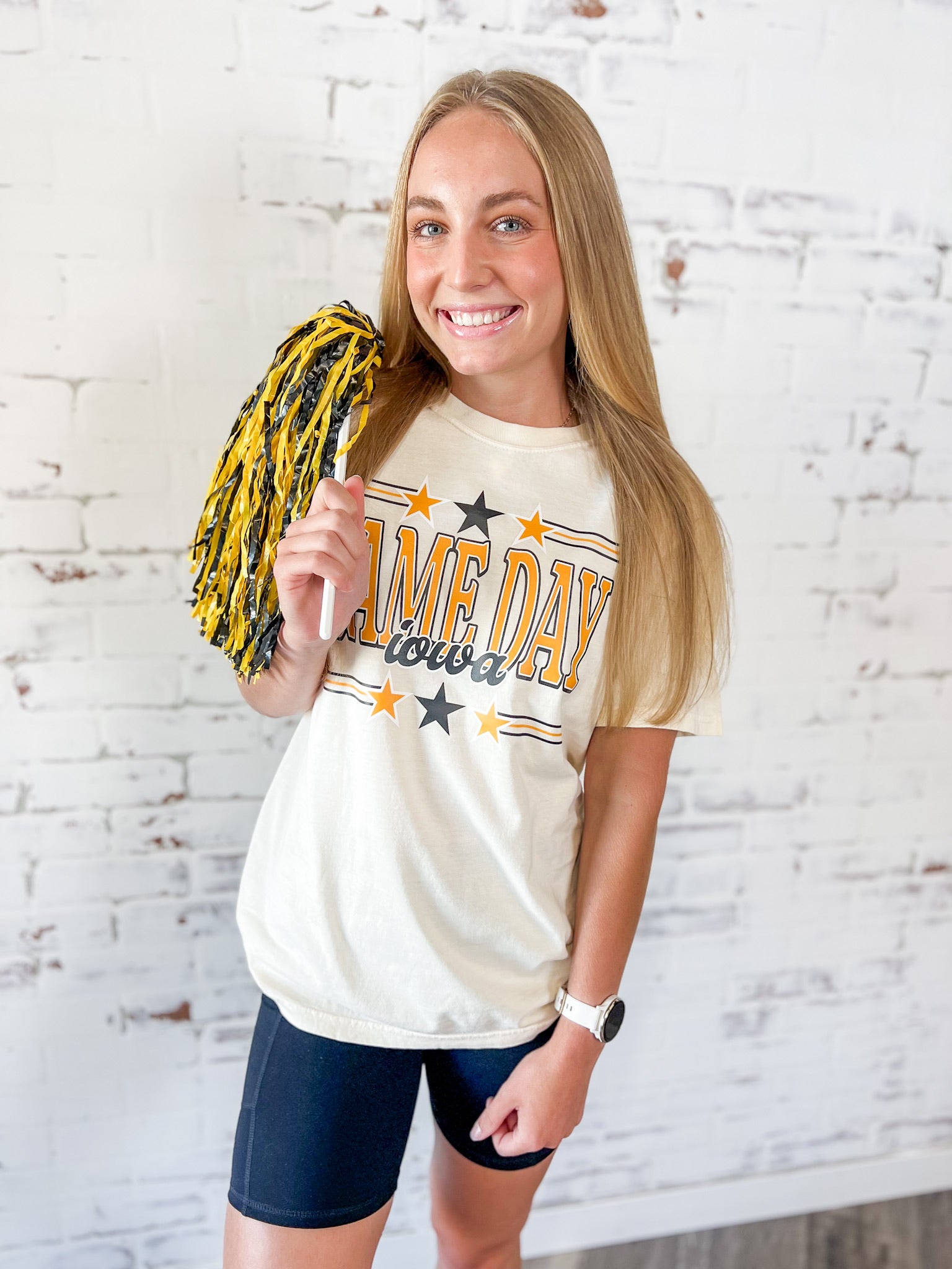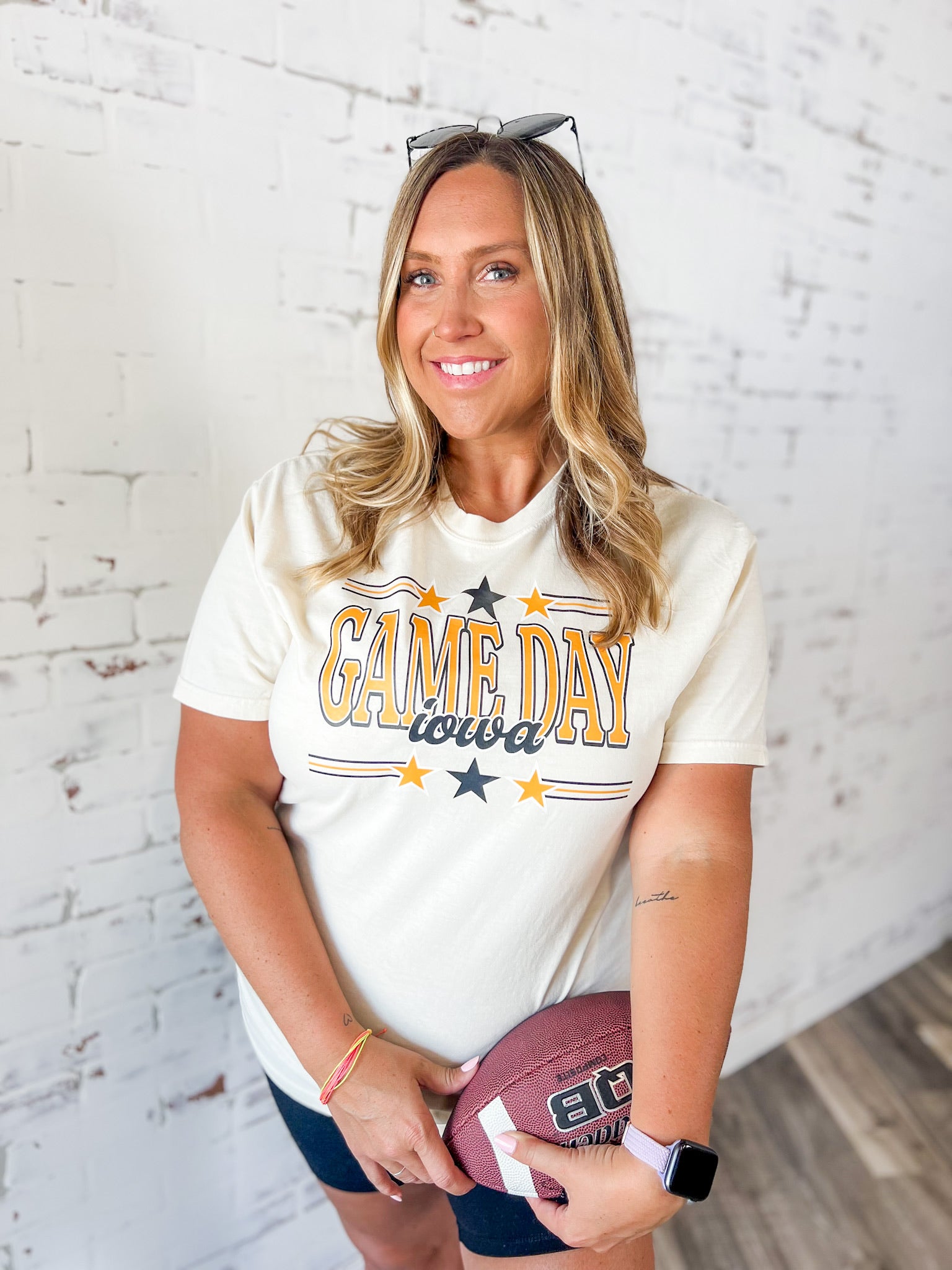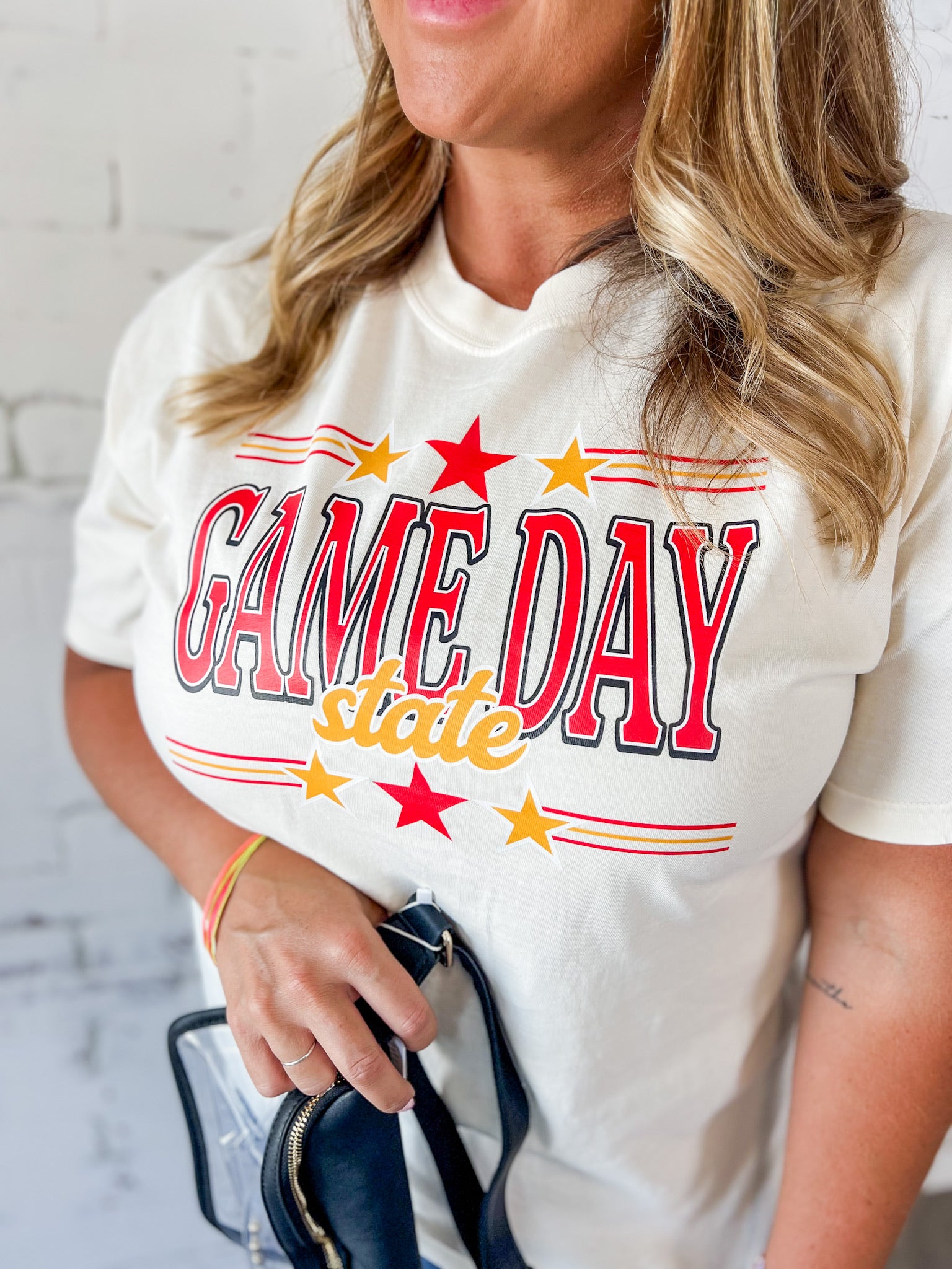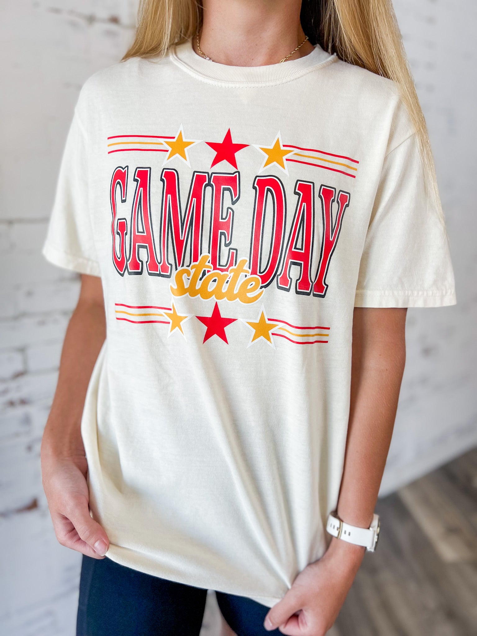 Show your team pride from the first whistle to the last play in our Game Day 3-Star Tee. Featuring bold “Game Day” lettering and a triple-star design in spirited red, gold, and black, this cream tee is an instant touchdown for your football-season wardrobe.