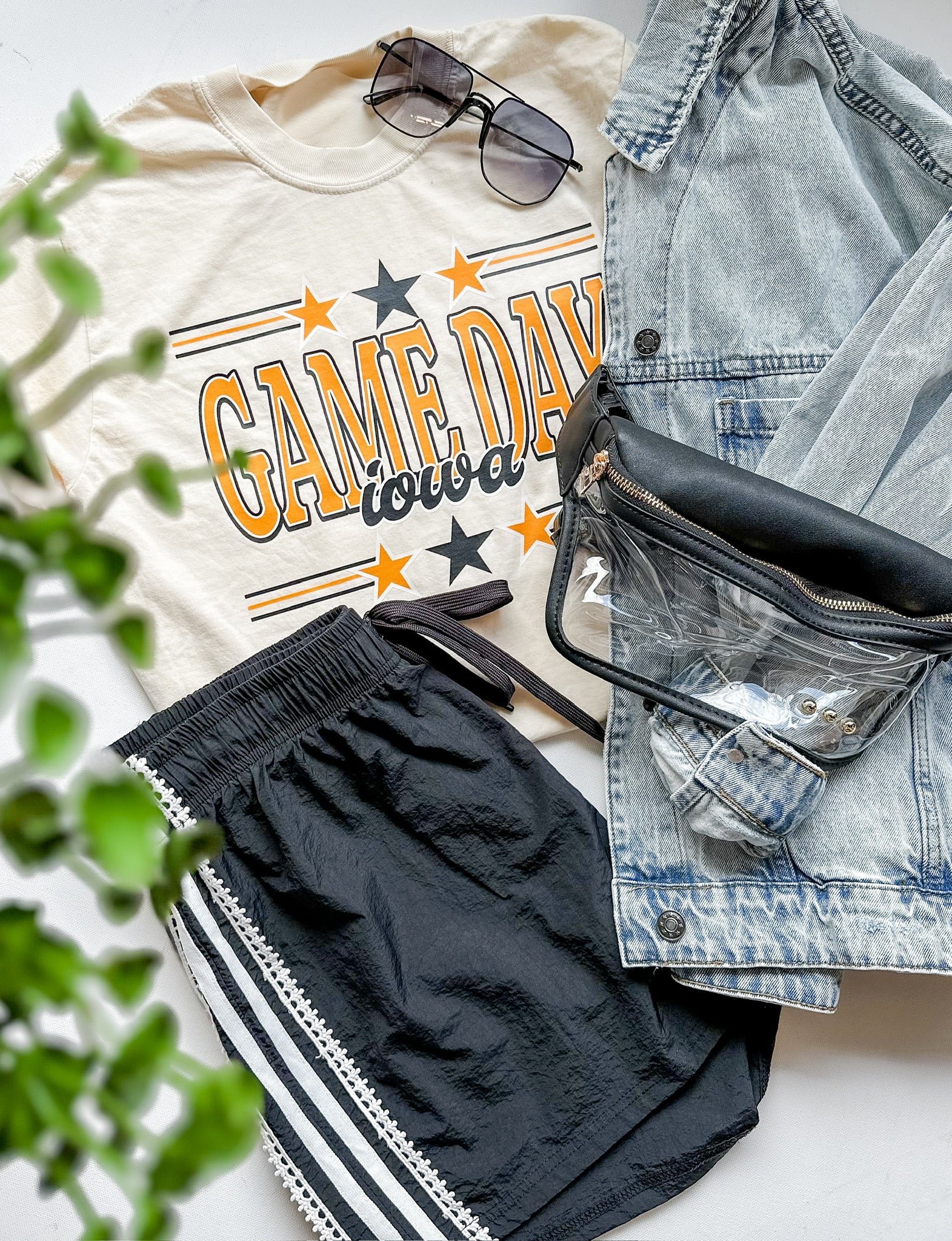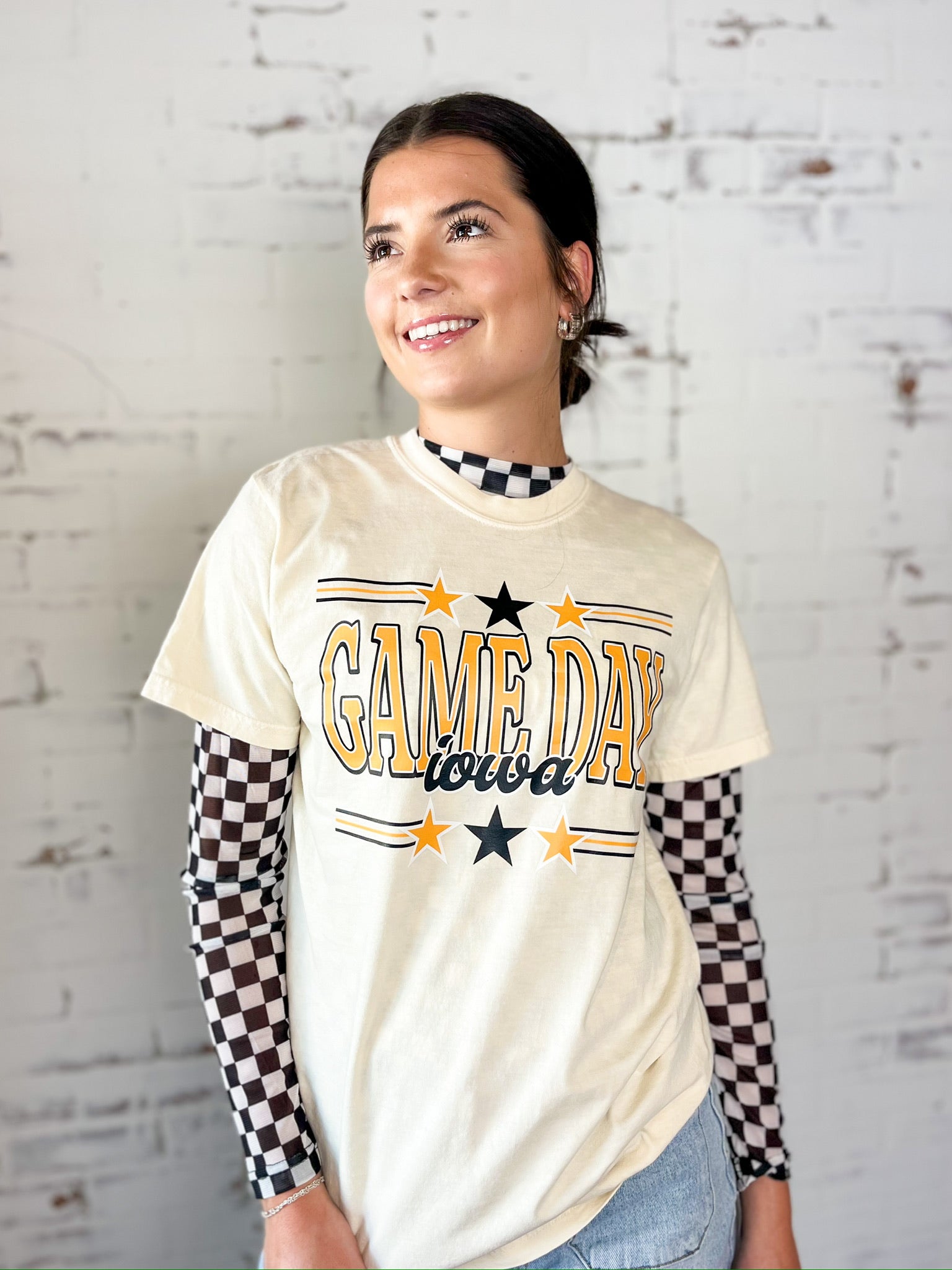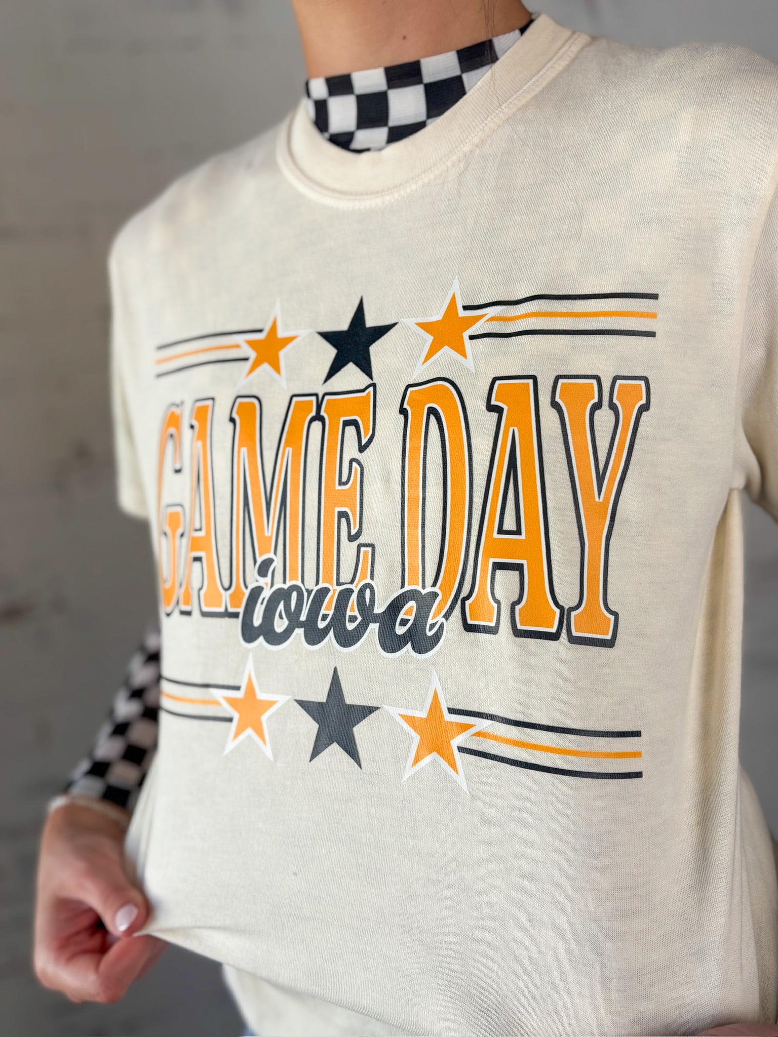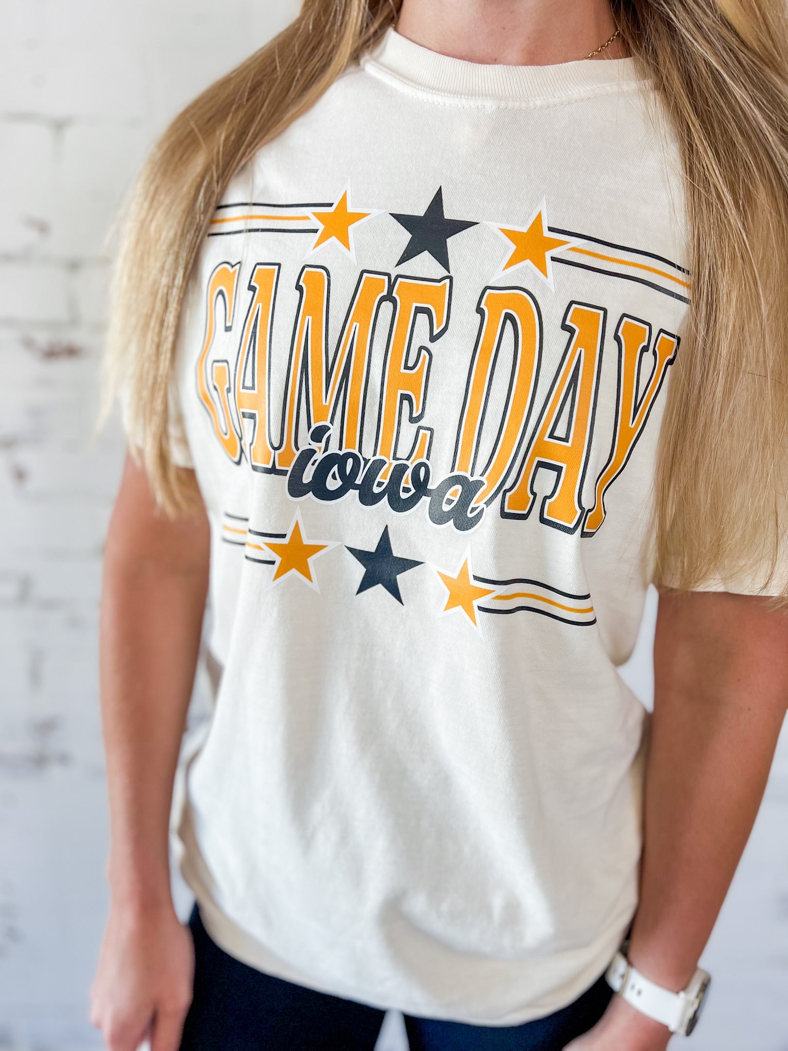 Show your team pride from the first whistle to the last play in our Game Day 3-Star Tee. Featuring bold “Game Day” lettering and a triple-star design in spirited red, gold, and black, this cream tee is an instant touchdown for your football-season wardrobe.