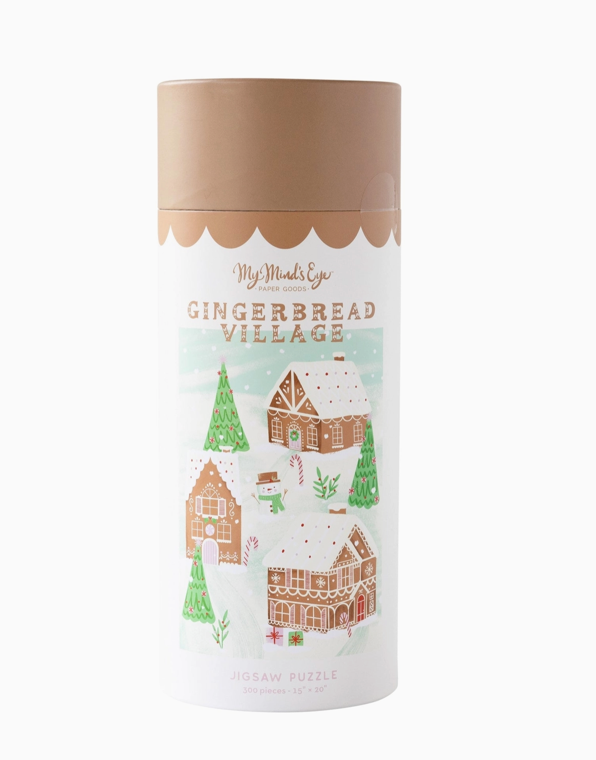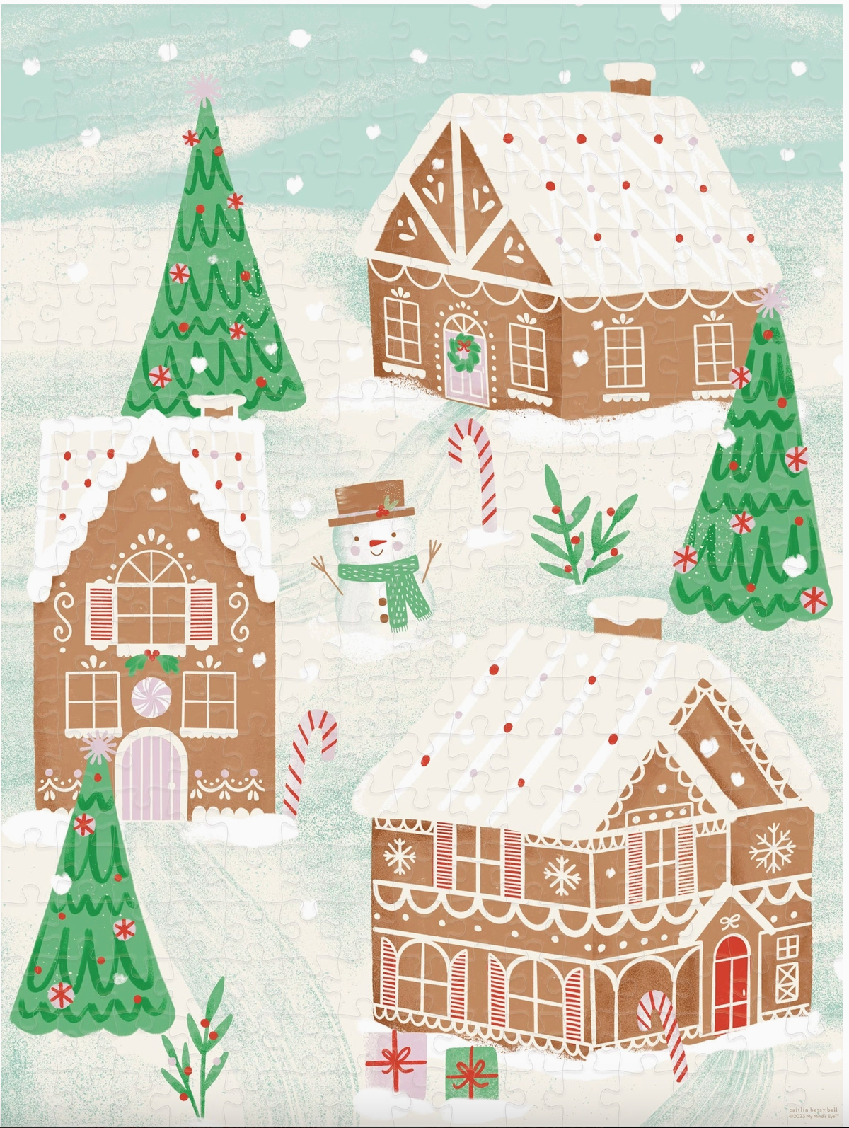Keep the holiday magic going this December with this charming gingerbread winter scene puzzle. This puzzle features a beautiful winter scene, and is perfect to hand out as a neighbor gift or to include in an advent celebration so that you and your loved ones can spend cozy Christmas nights together by the fire! • chipboard jigsaw puzzle • 300 pieces • finished puzzle size is 15" x 20"