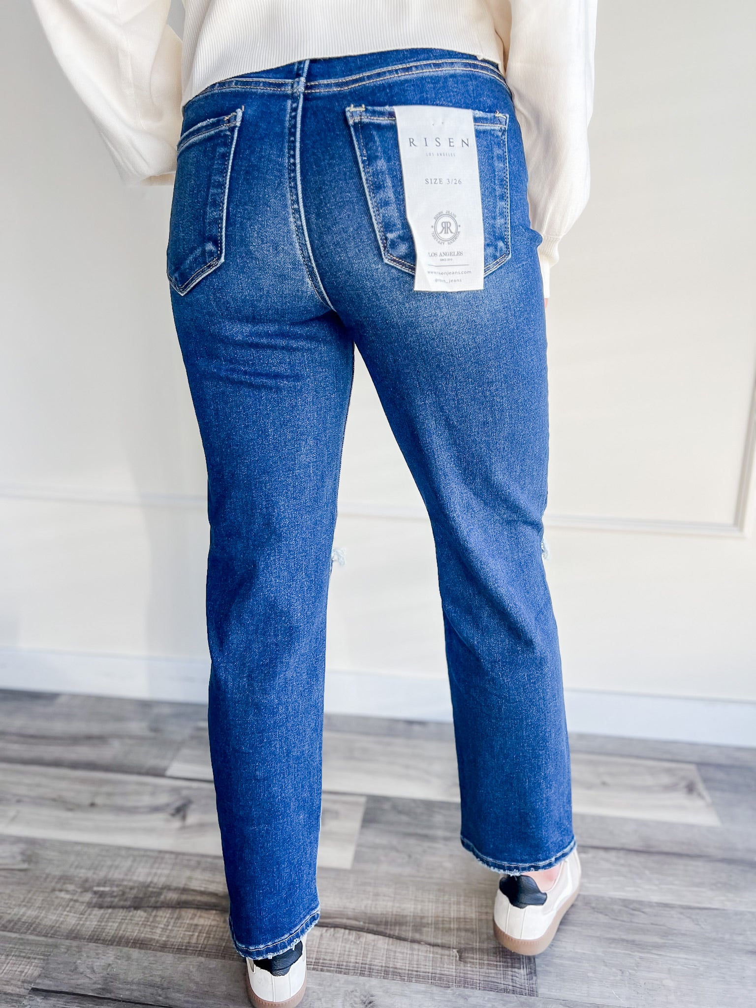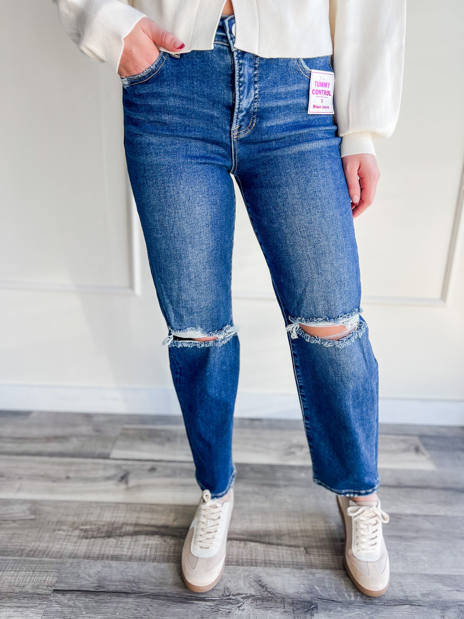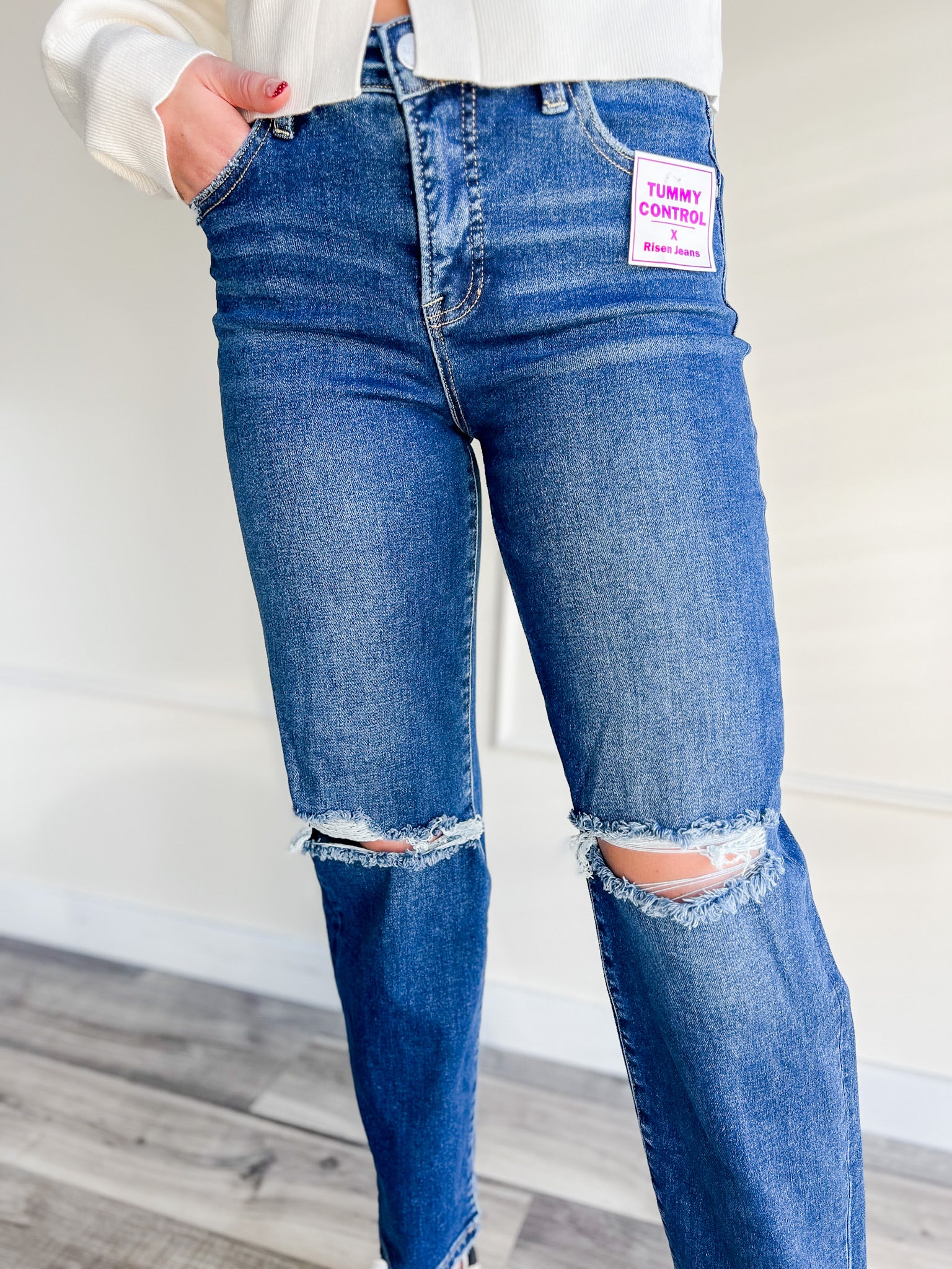 Meet the jeans that love you back. The Risen Tummy Control Distressed Denim blends classic style with everyday comfort thanks to its flattering high-rise fit and built-in tummy control panel that smooths without squeezing. The dark wash and distressed knees strike the perfect balance of chic and casual — ideal for busy days when you still want to feel put together.