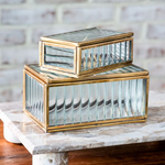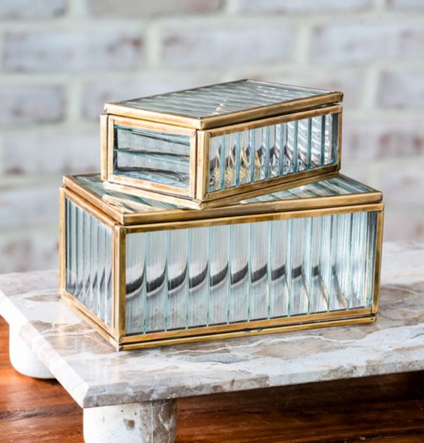A beautiful blend of vintage charm and modern detail, these ribbed glass keepsake boxes are framed in warm antique brass for a refined, collected look. The textured glass adds dimension while softly diffusing whatever you choose to display inside, from jewelry to handwritten notes to small treasures.