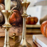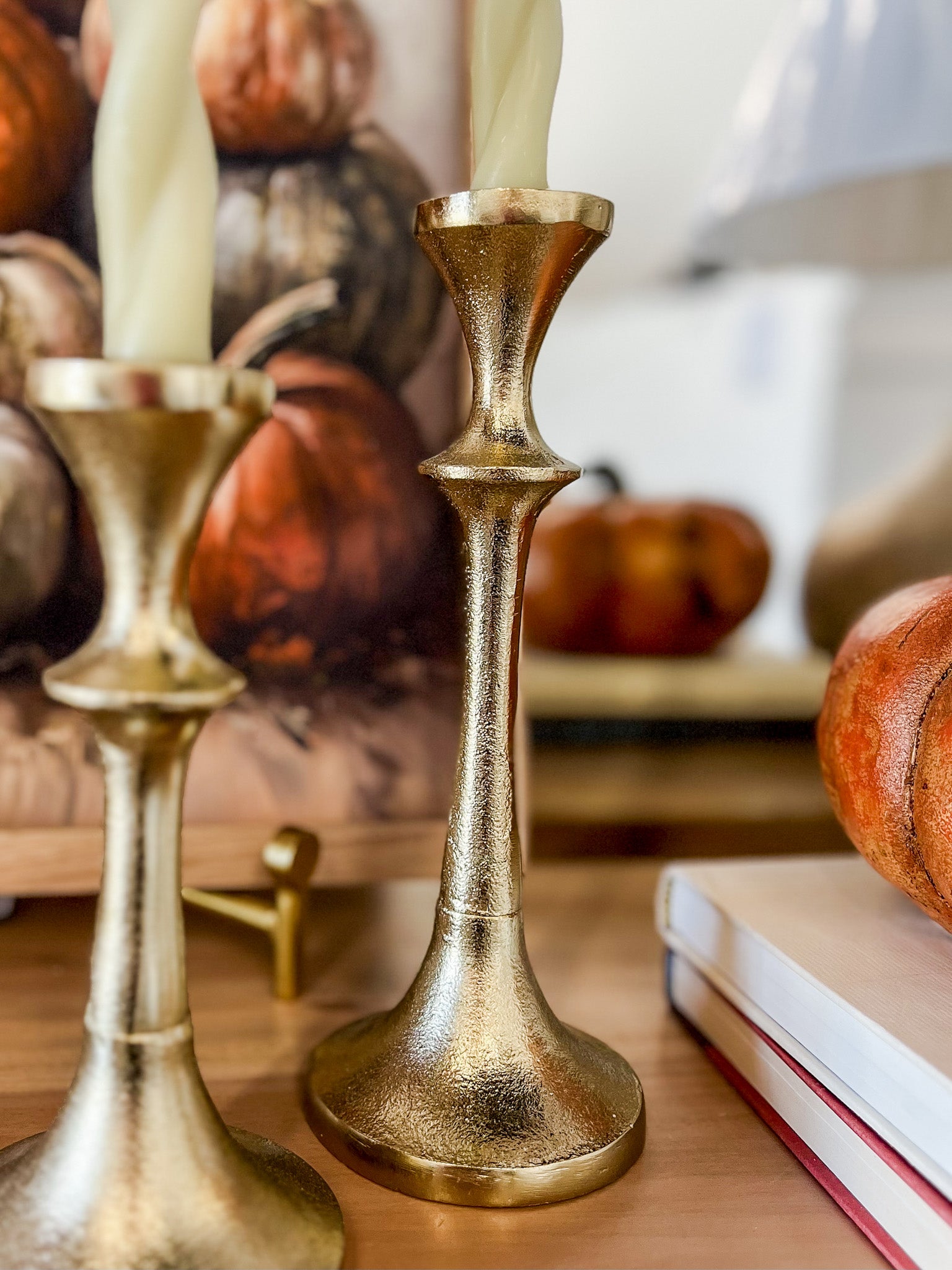 A touch of glam without the fuss. These Brushed Gold Taper Holders elevate any tablescape or shelf with their tall, sculpted silhouettes and textured finish. Just add your favorite seasonal tapers for an instant glow-up.
