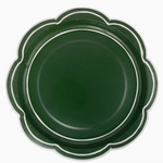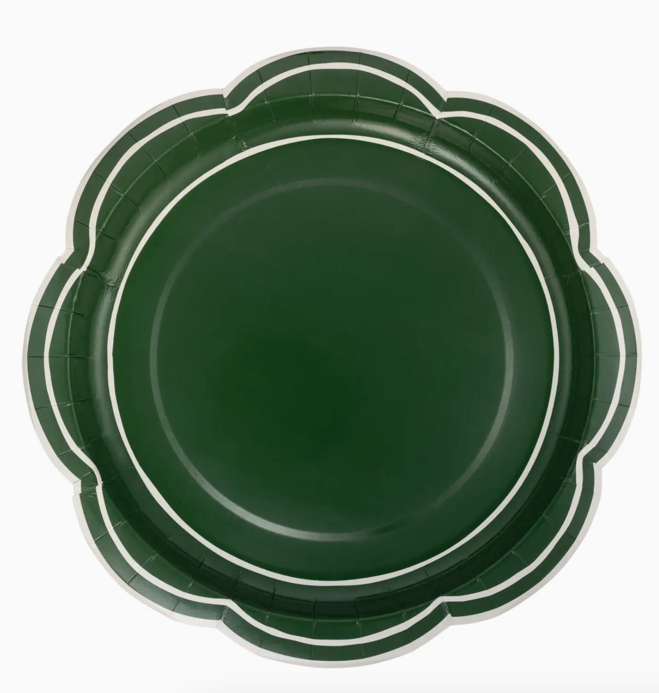 Add festive flair to your holiday table with our Green Scalloped Cream Lines Plate. Its elegant scalloped edge and subtle cream line detailing perfectly complement Christmas décor, creating a coordinated and cheerful setting for your party. • includes 8 shaped paper plates • 11 x 11 inches