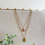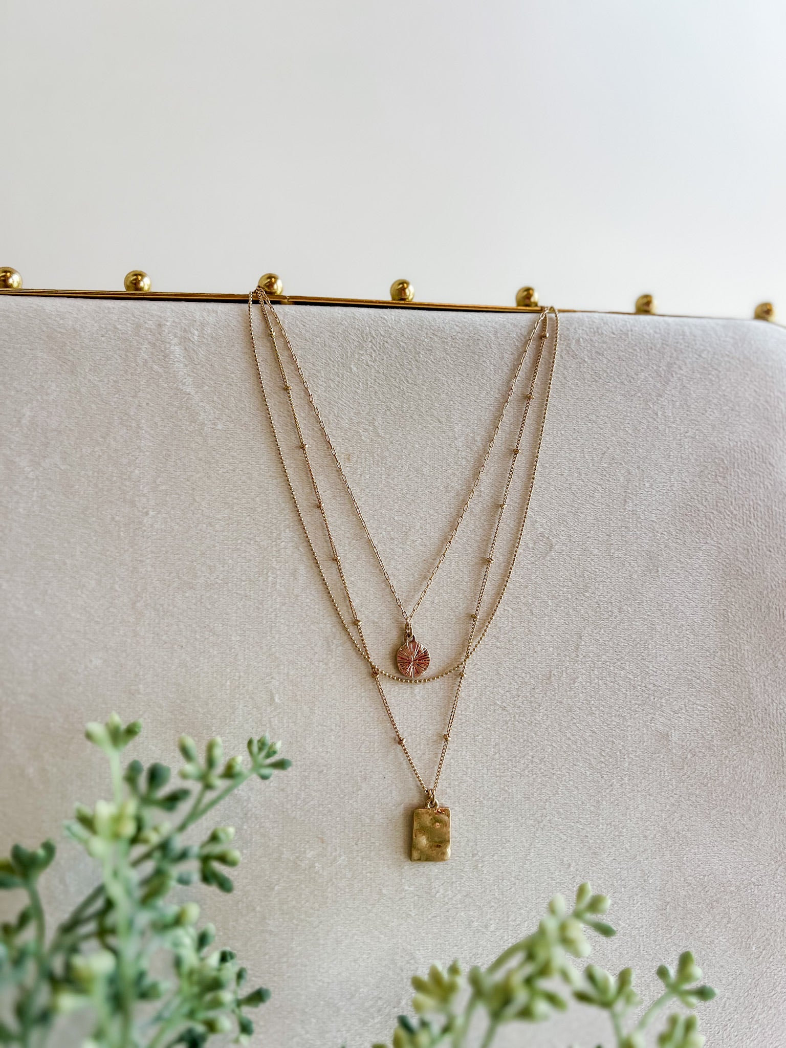 A gold tone necklace with three layered chains. Designed with a small sunburst-style charm on the top layer and a rectangular stone pendant on the longest layer for a balanced, dimensional look.