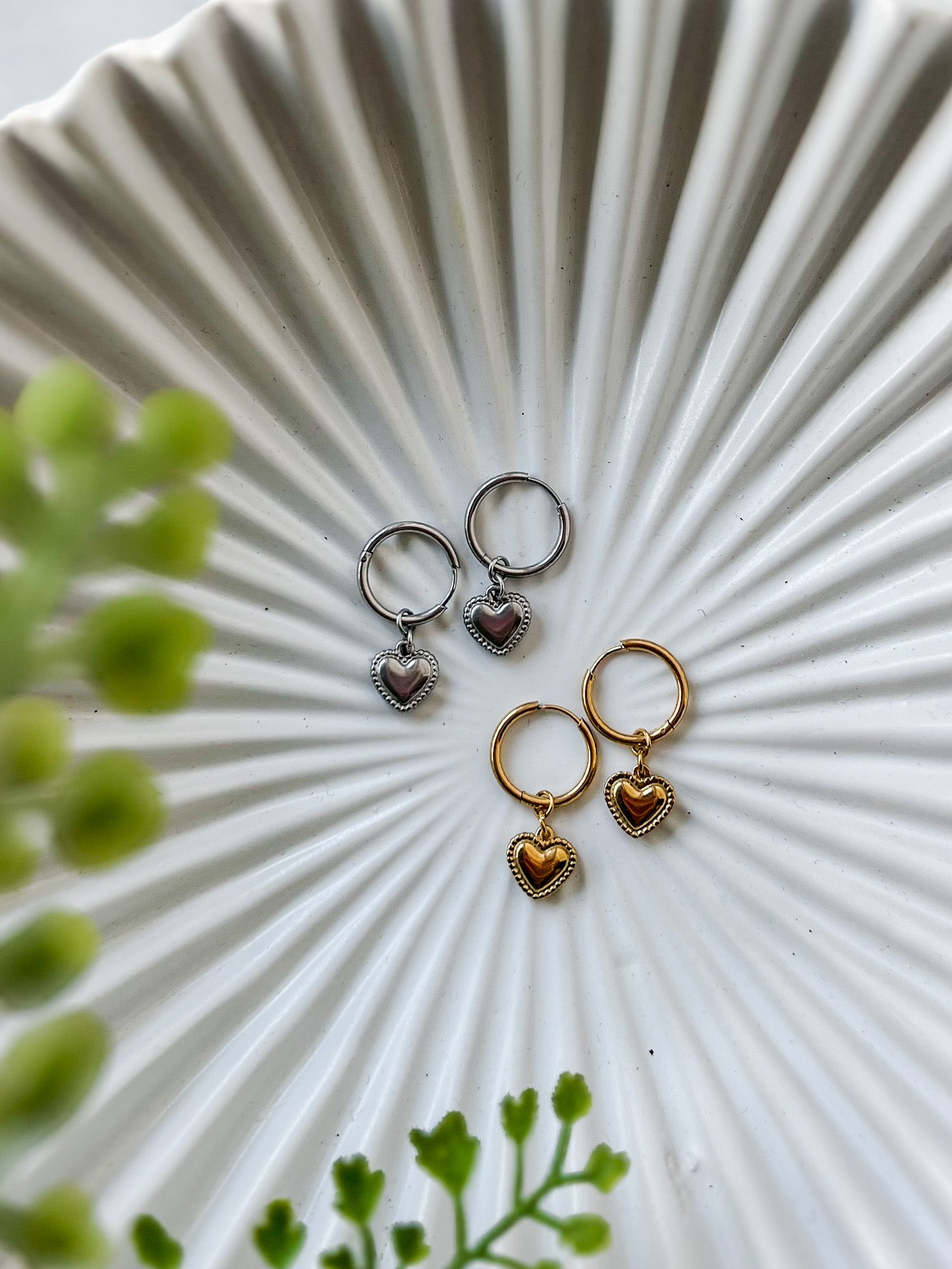 These huggie hoop earrings feature a dangling heart charm for a timeless, love-inspired look. Easy to dress up or down, they’re a go-to pair you’ll wear on repeat.