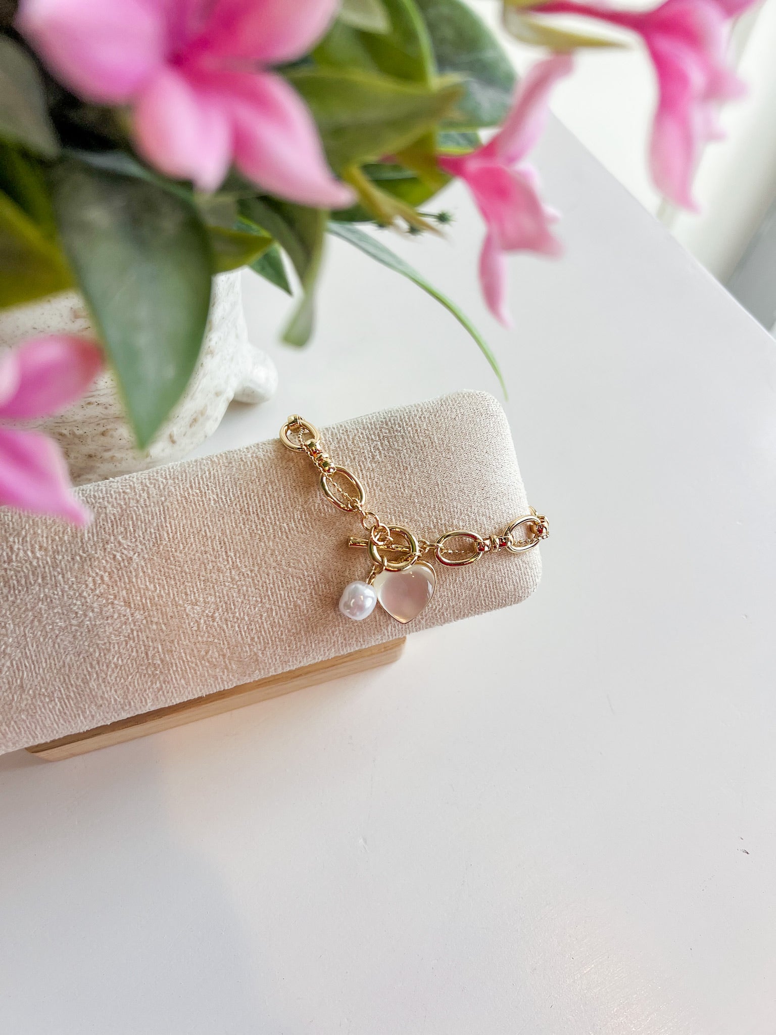 A link-style bracelet finished with a toggle closure, heart charm and small pearl accent. Balanced and easy to wear, this piece adds a soft statement while still feeling clean and neutral.