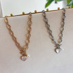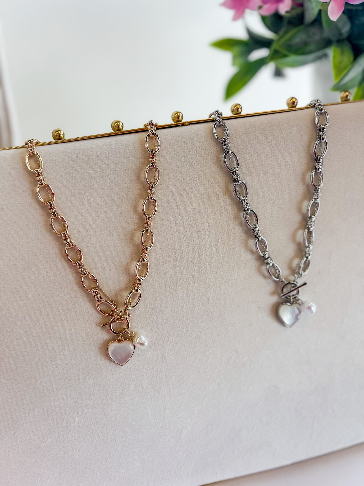 A link-style chain necklace finished with a toggle closure and heart charm at the center. Detailed with a small pearl accent, this piece balances bold links with a soft, feminine touch.