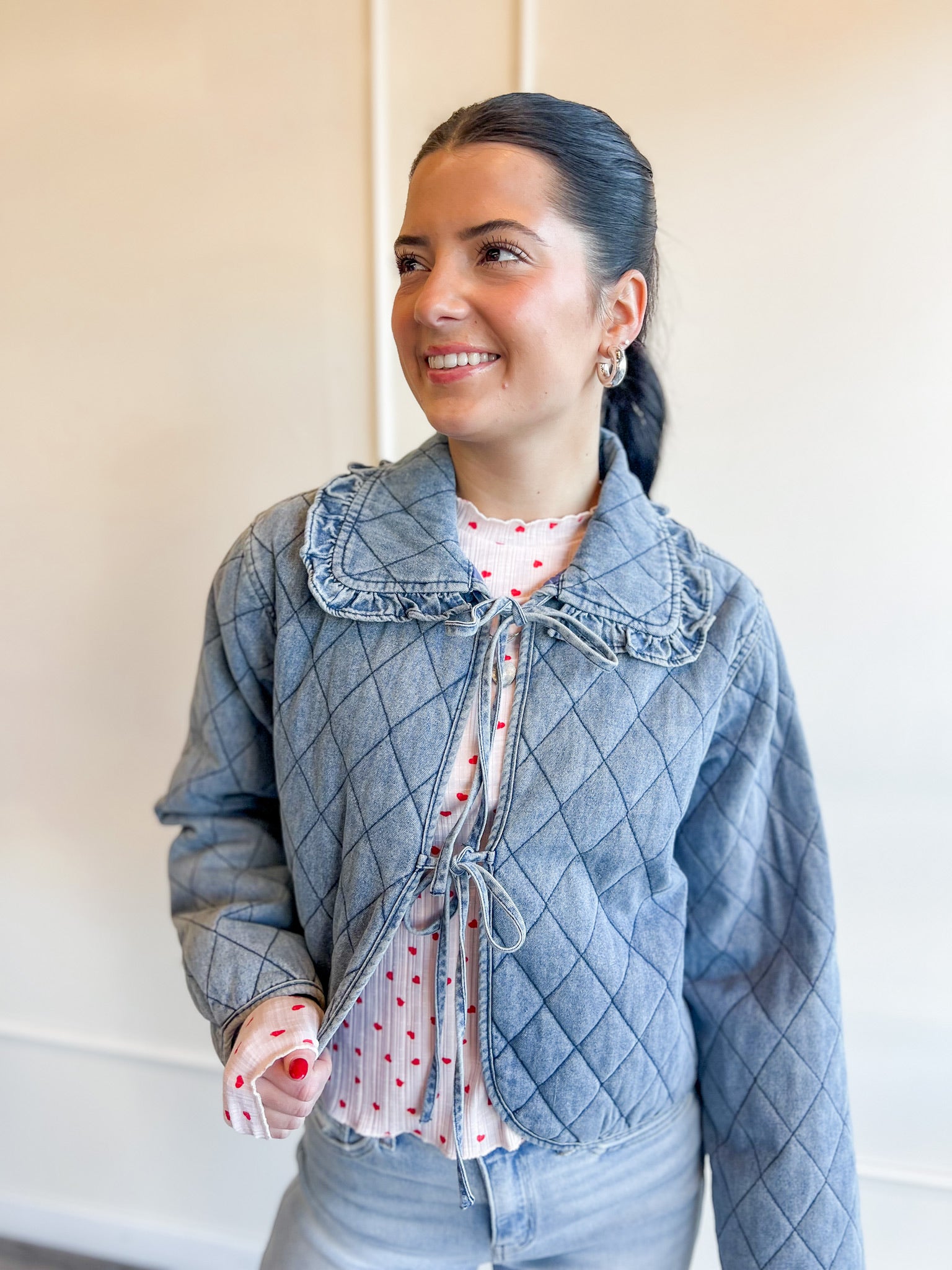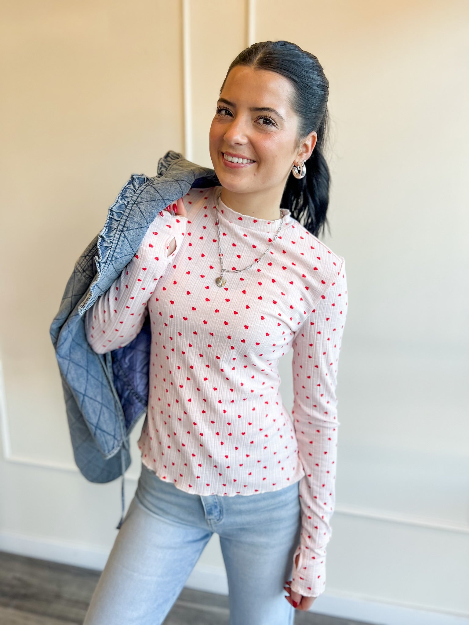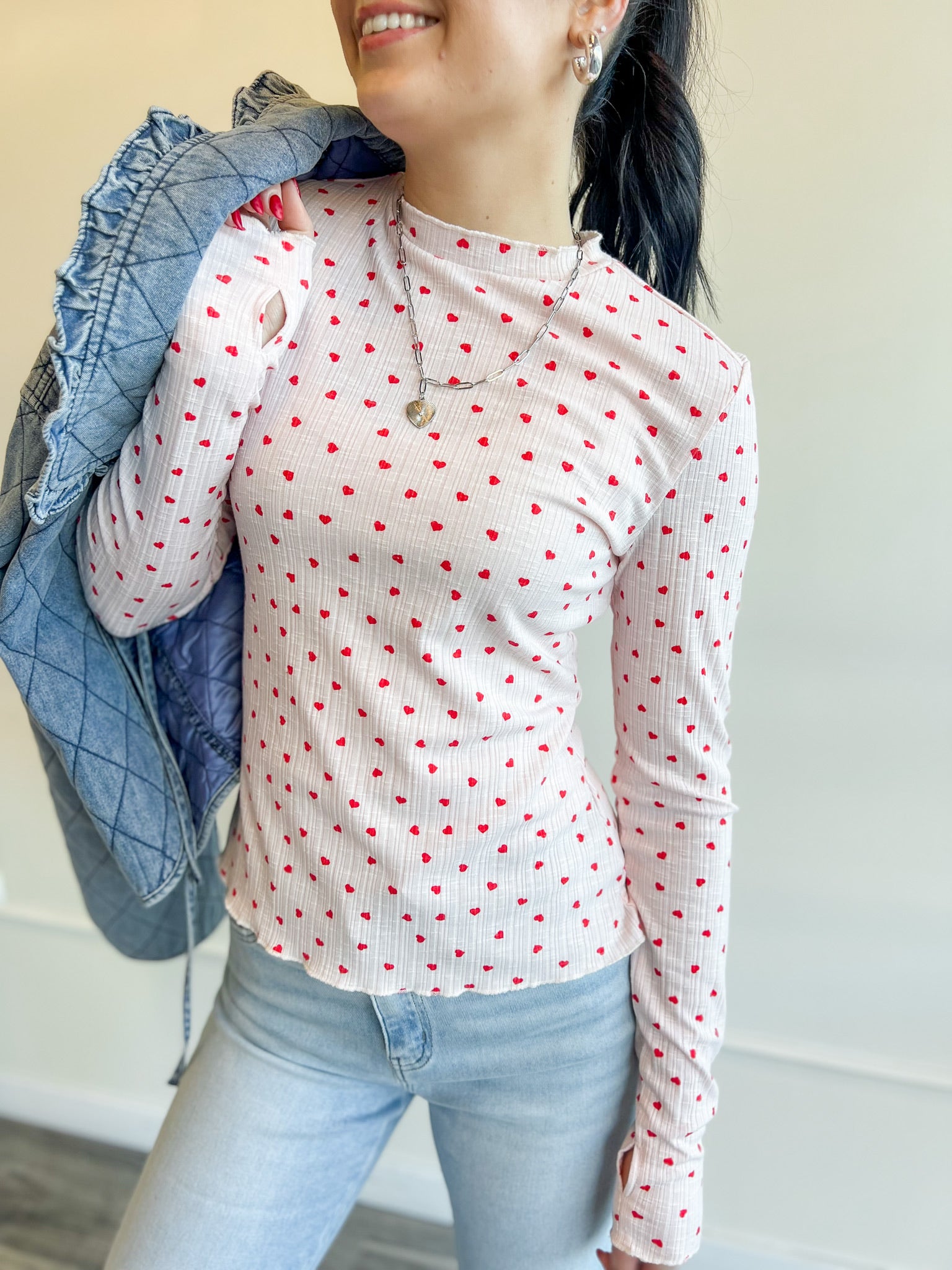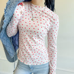 A fitted ribbed long sleeve sprinkled with tiny red hearts — the perfect layering tee for Valentine’s, Galentine’s or just adding a little love to your everyday look. Stretchy, feminine and so easy to wear.