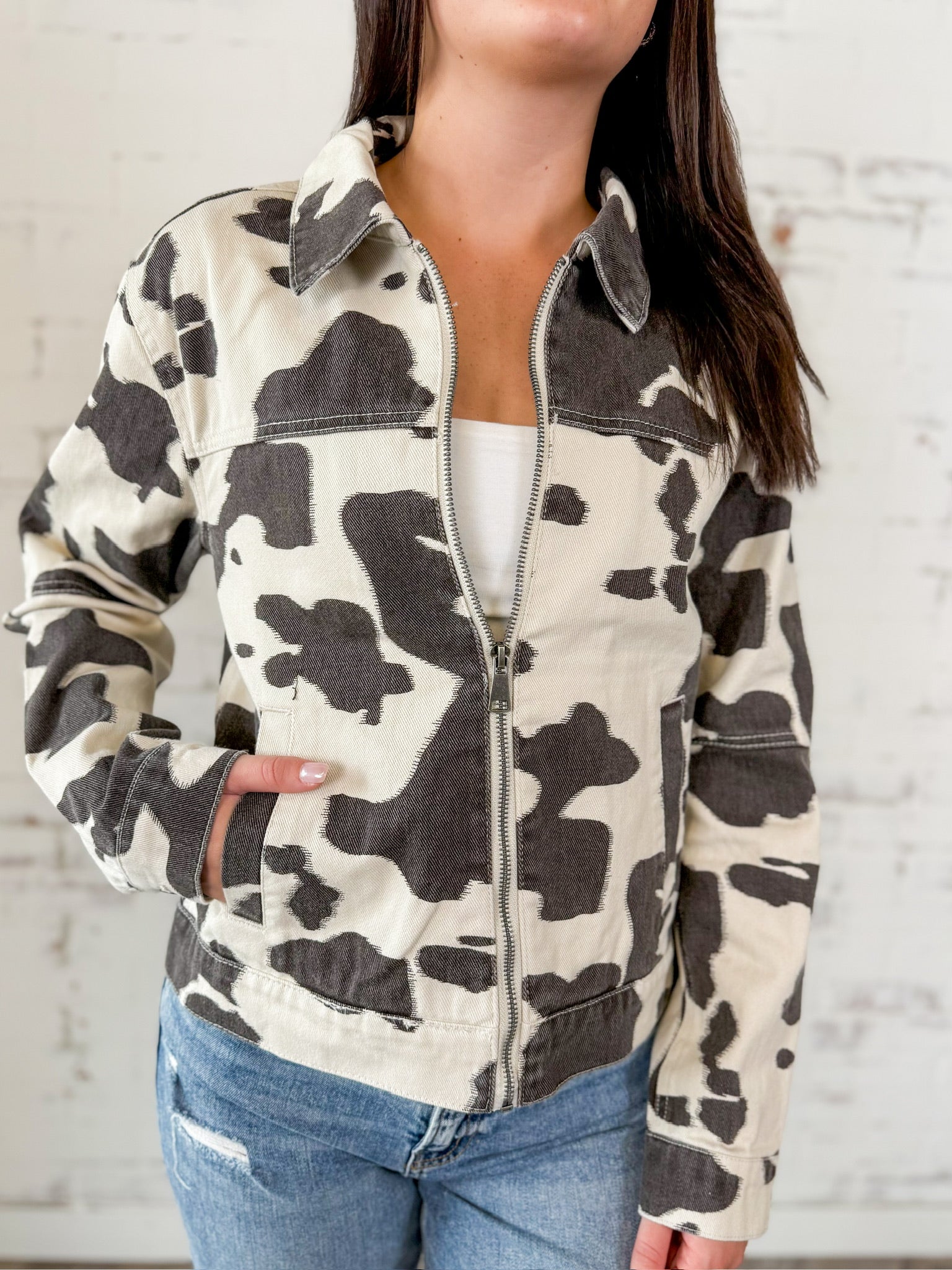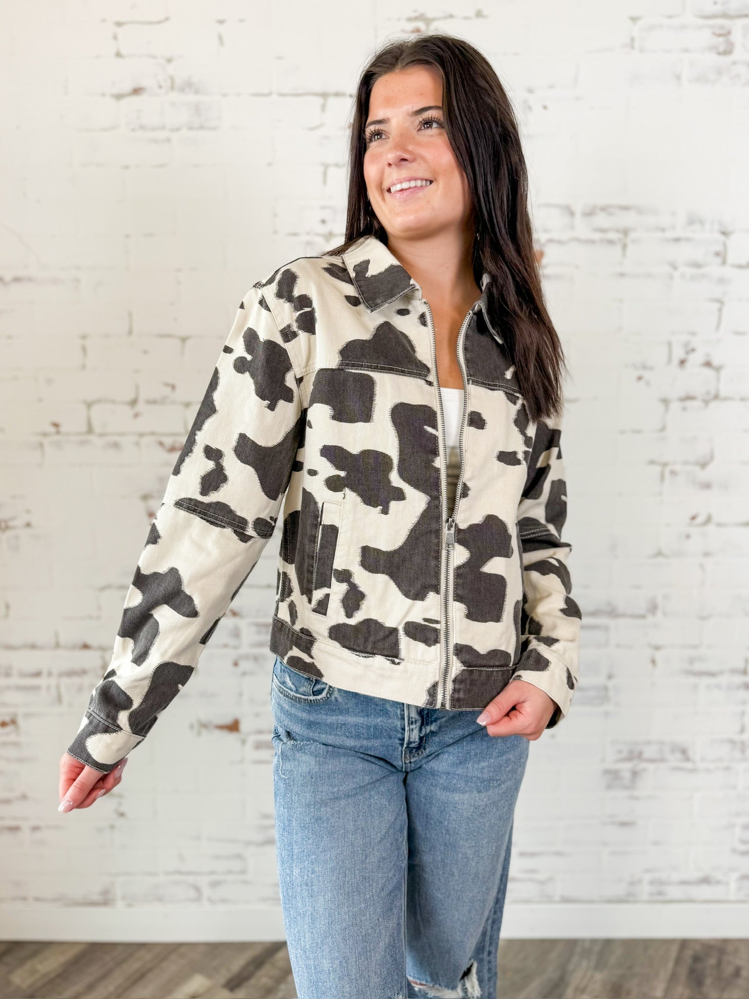 Make a bold statement with this cow-print zip jacket. Lightweight yet structured, it’s the perfect piece to throw on over denim or leggings for a standout casual look. Chloe is 5'7" wearing a size small, and the fit is true to size.