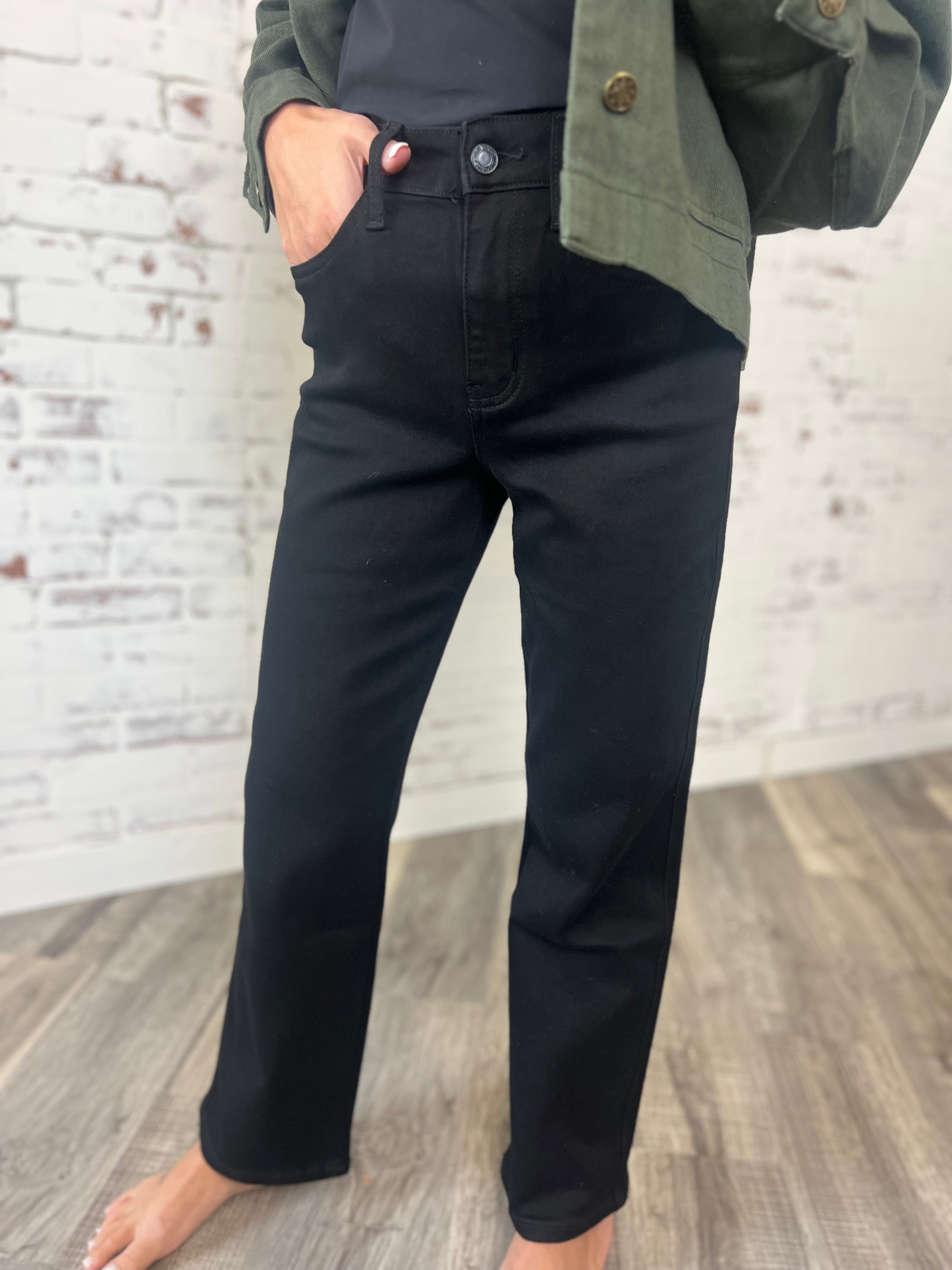These high rise straight leg jeans are the black denim staple every woman needs. Clean simple and endlessly wearable they offer all the comfort of stretch denim with a polished silhouette that works for work errands evenings out and everything between. The ankle length cut keeps them modern while the straight leg fit creates a timeless line that flatters every shape.