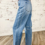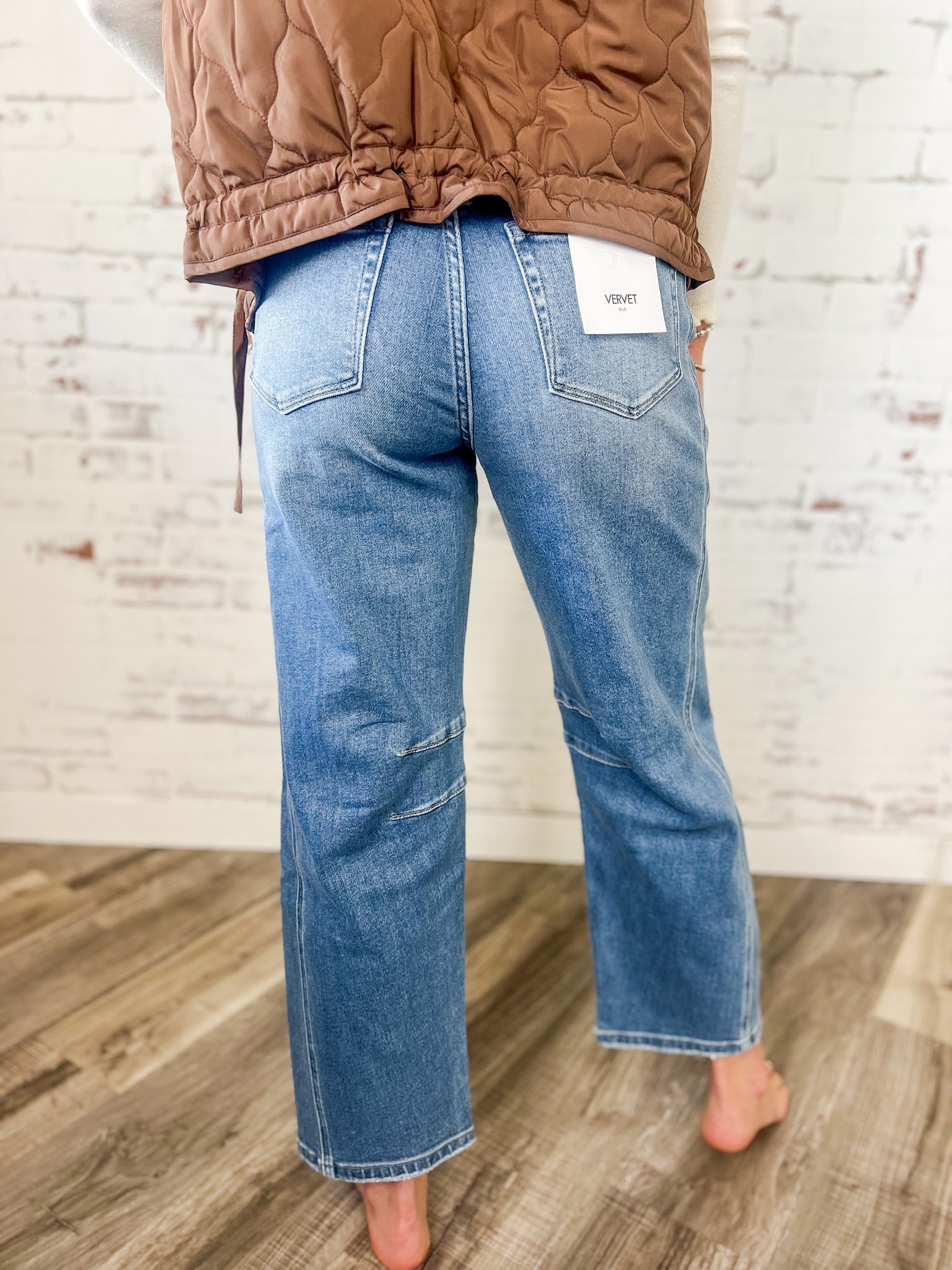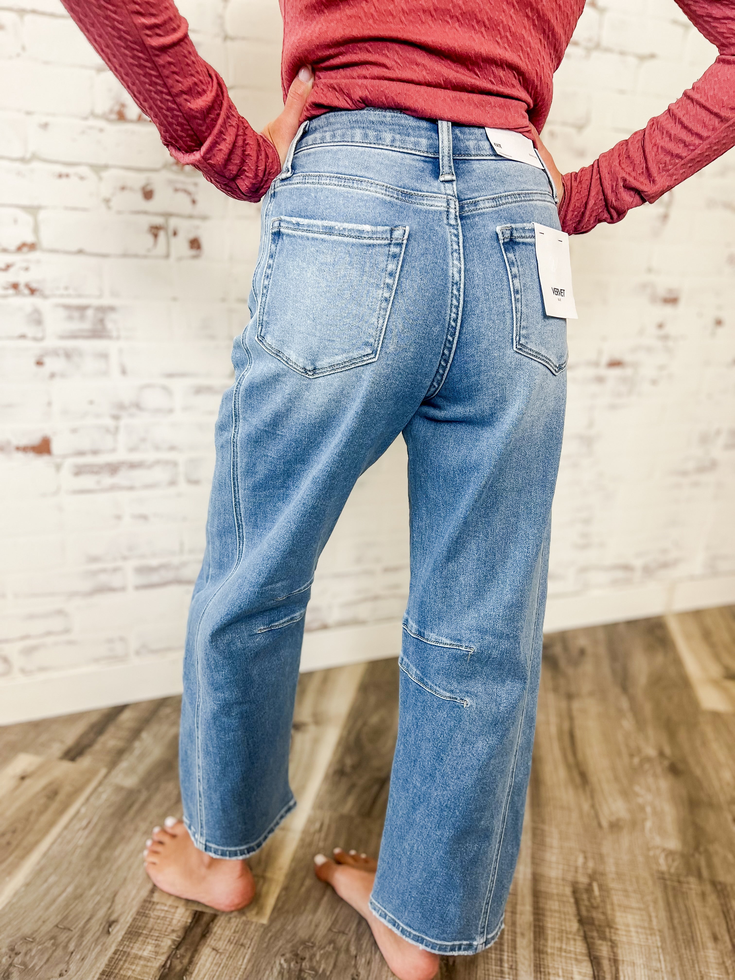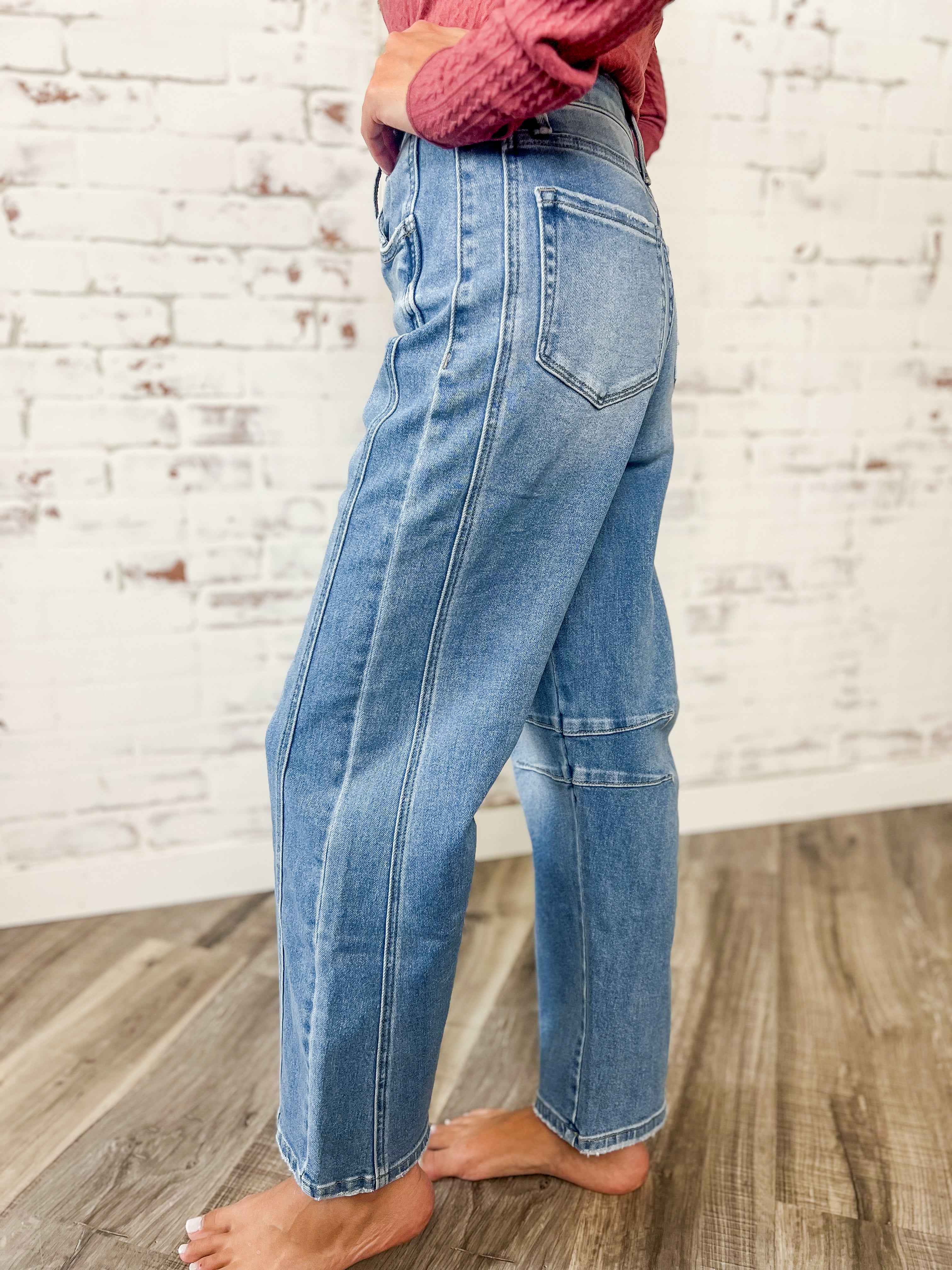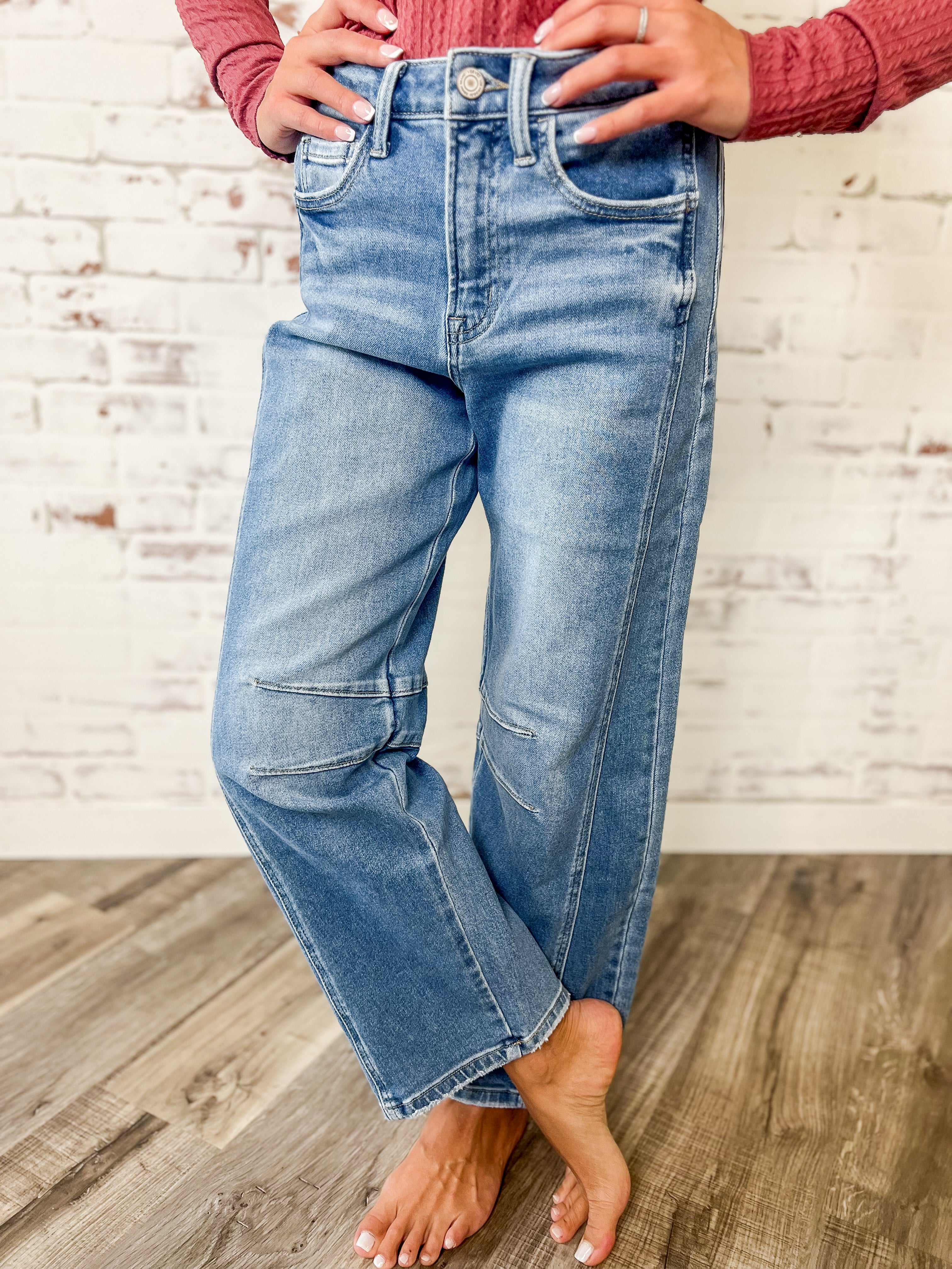 These high rise barrel jeans bring a fresh shape to your denim lineup with a relaxed fit that still feels clean and polished. Made with comfort stretch denim they move with you while holding their structure so you feel comfortable and put together from the moment you leave the house until you finally slow down at night. Seam detailing adds an elevated touch and gives these jeans a modern look that stands out in the best way.