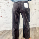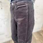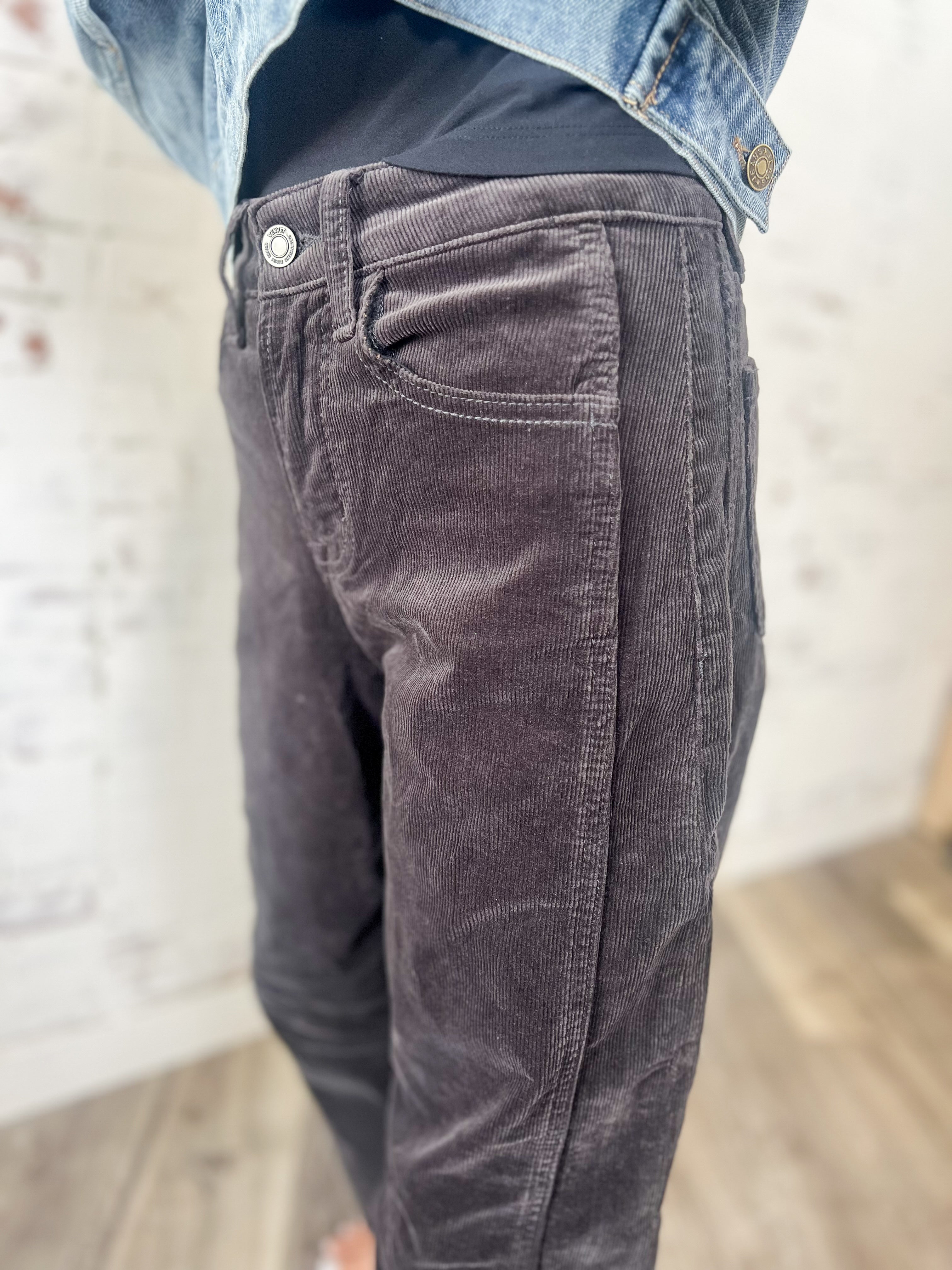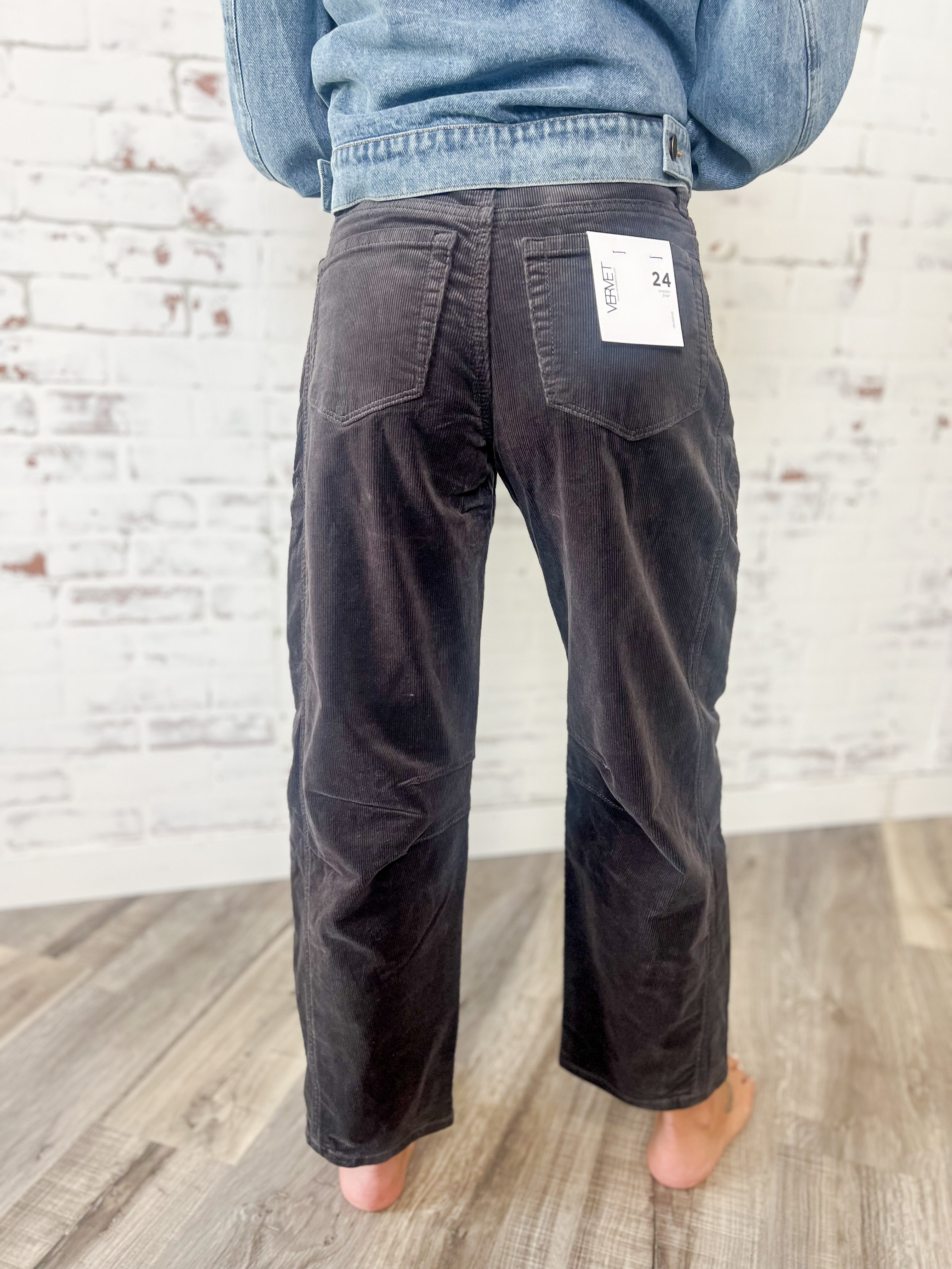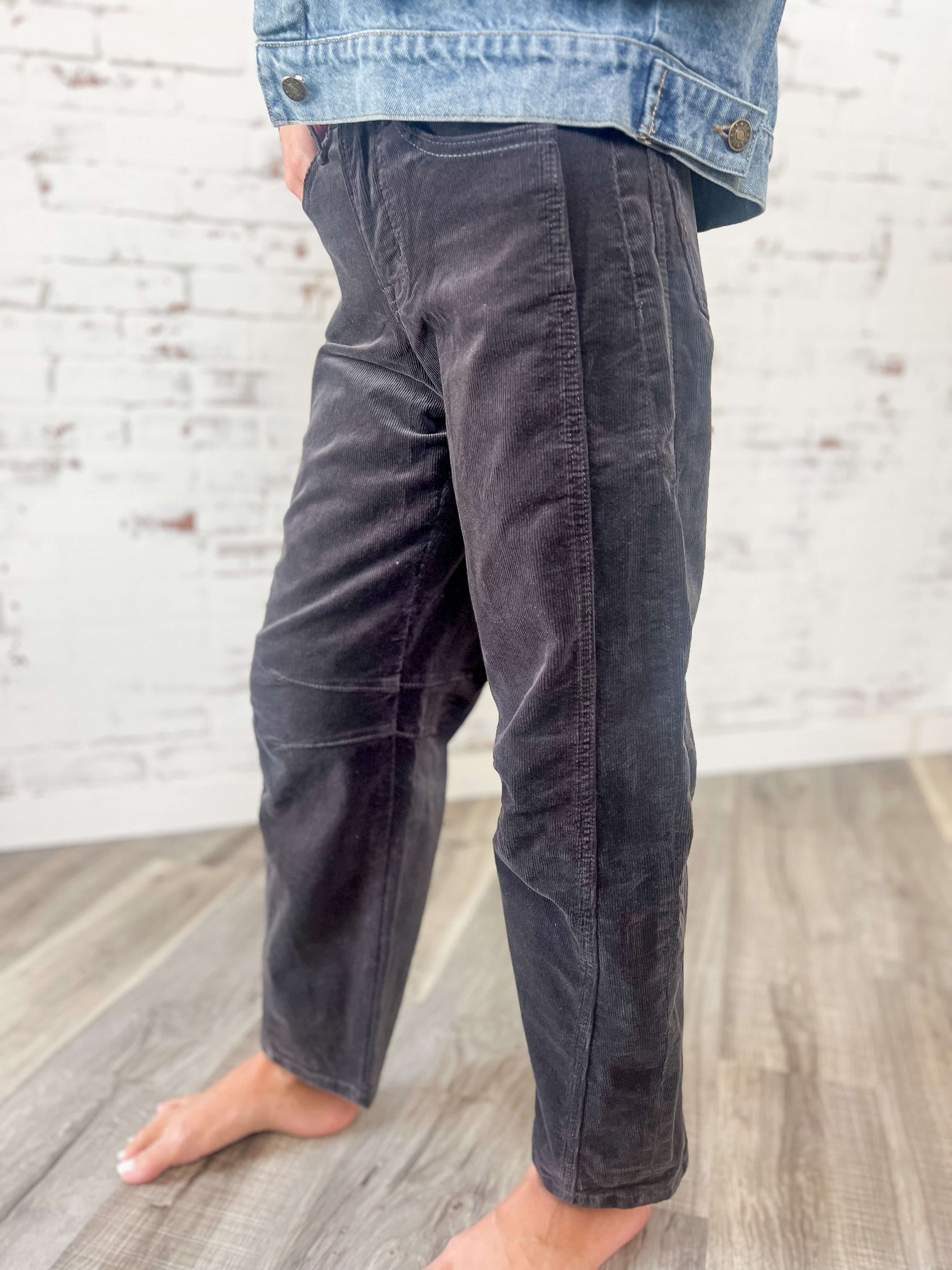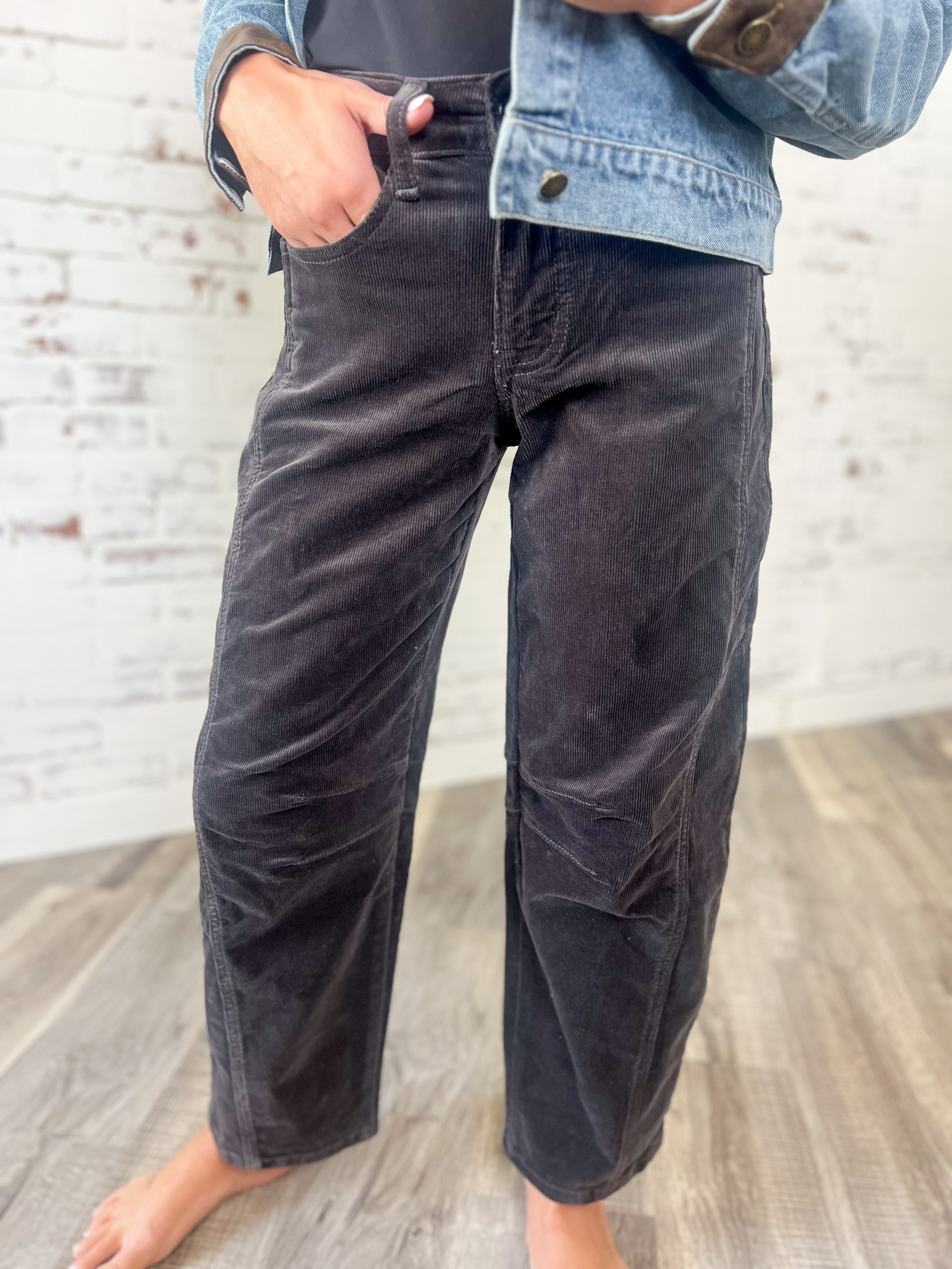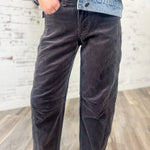 Step into your day feeling put-together with zero fuss. These dark grey barrel jeans are the perfect blend of relaxed structure and elevated ease. The soft corduroy texture adds a cozy, modern touch while the high rise waist and subtle seam detailing create a flattering shape that works everywhere your day takes you. Dress them up with a sleek blouse for the office or keep them casual with a chunky knit and sneakers. Either way, these are the jeans that make comfort look chic.