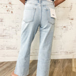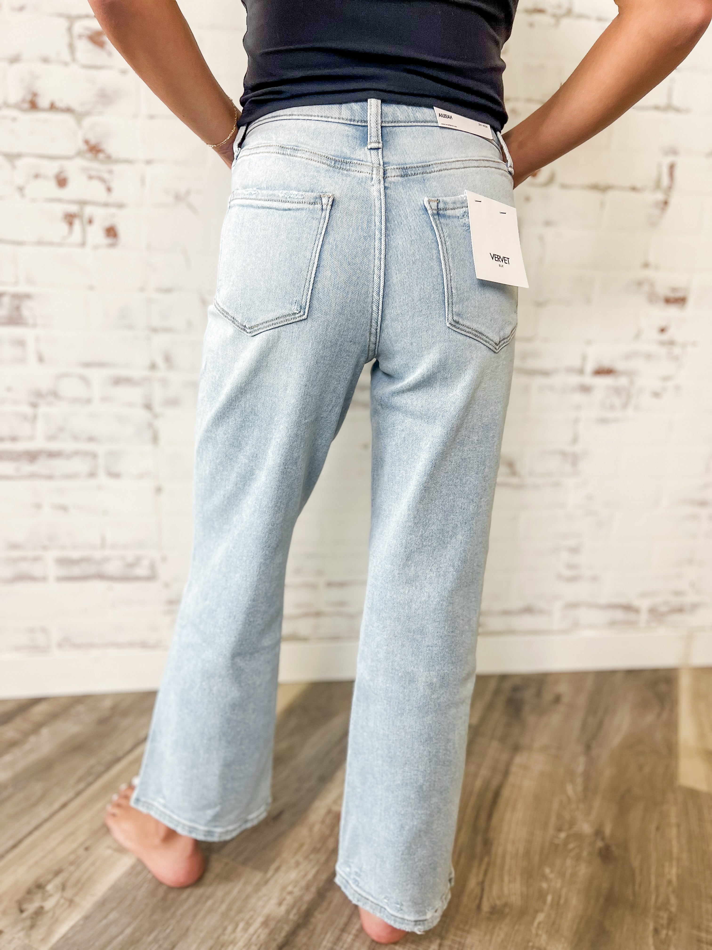 These light wash slim wide leg jeans are made for the woman who wants comfort without giving up a polished feel. The high rise waist smooths and flatters while the comfort stretch denim moves with you from morning to night. Subtle distressing adds the perfect touch of lived-in charm, and the cropped length keeps the look modern and easy to style with sandals sneakers or a sleek low heel.